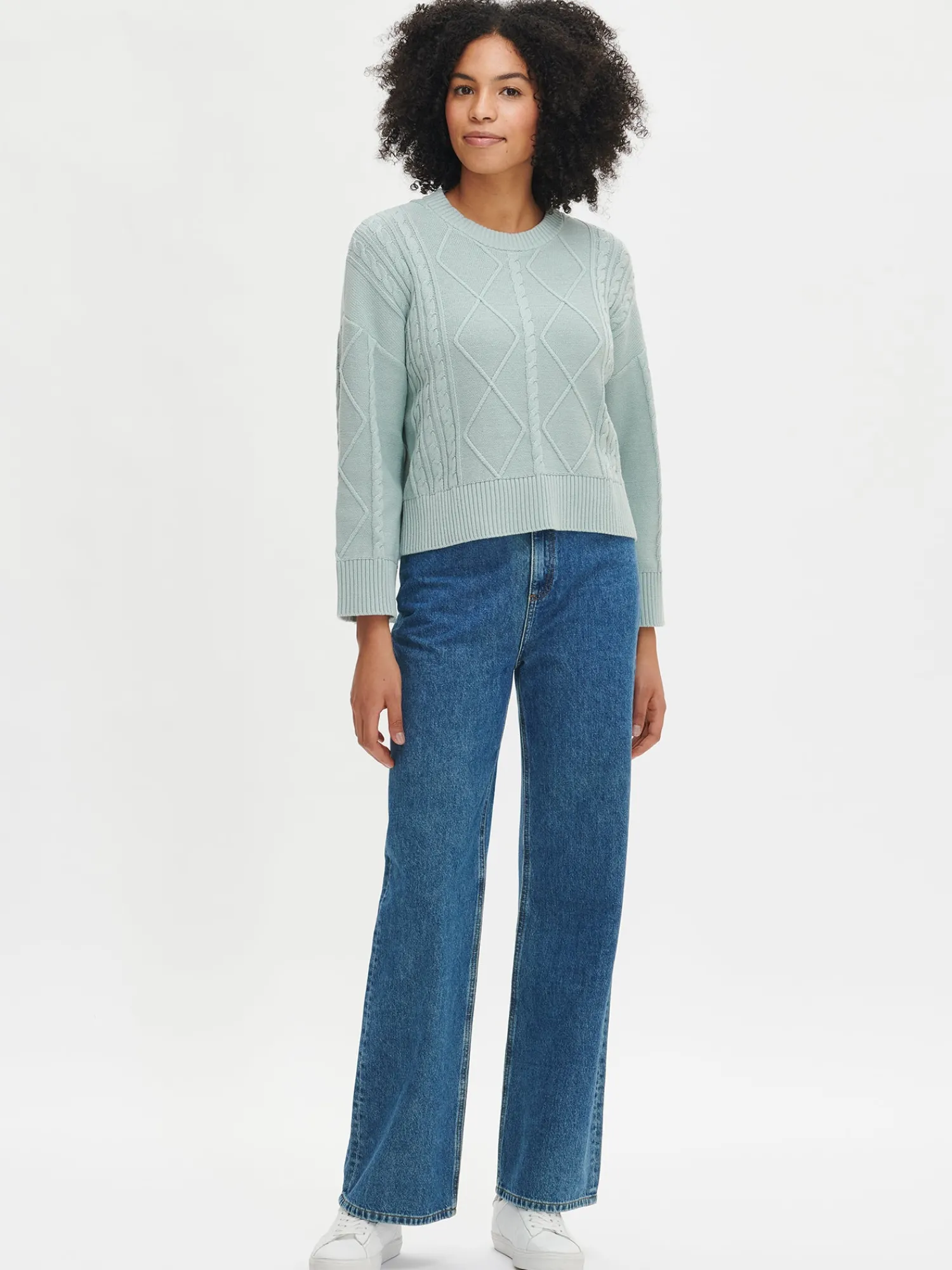 Naisten sinivihreä Coletta-neulepusero kauniilla palmikkokuviolla. Tyylikkääseen puuvillaneuleeseen on mukavaa pukeutua aina. Muotoonneulotussa laatikkomaisessa neulepuserossa on pyöreä pääntie ja hieman vajaamittaiset hihat. Neuleessa on kaunis palmikko kuviointi ja resori hihansuissa sekä helmassa. Tuotteen pituus koossa M on noin 58 cm. Neulepusero on valmistettu laadukkaasta sertifioidusta puuvillasta.