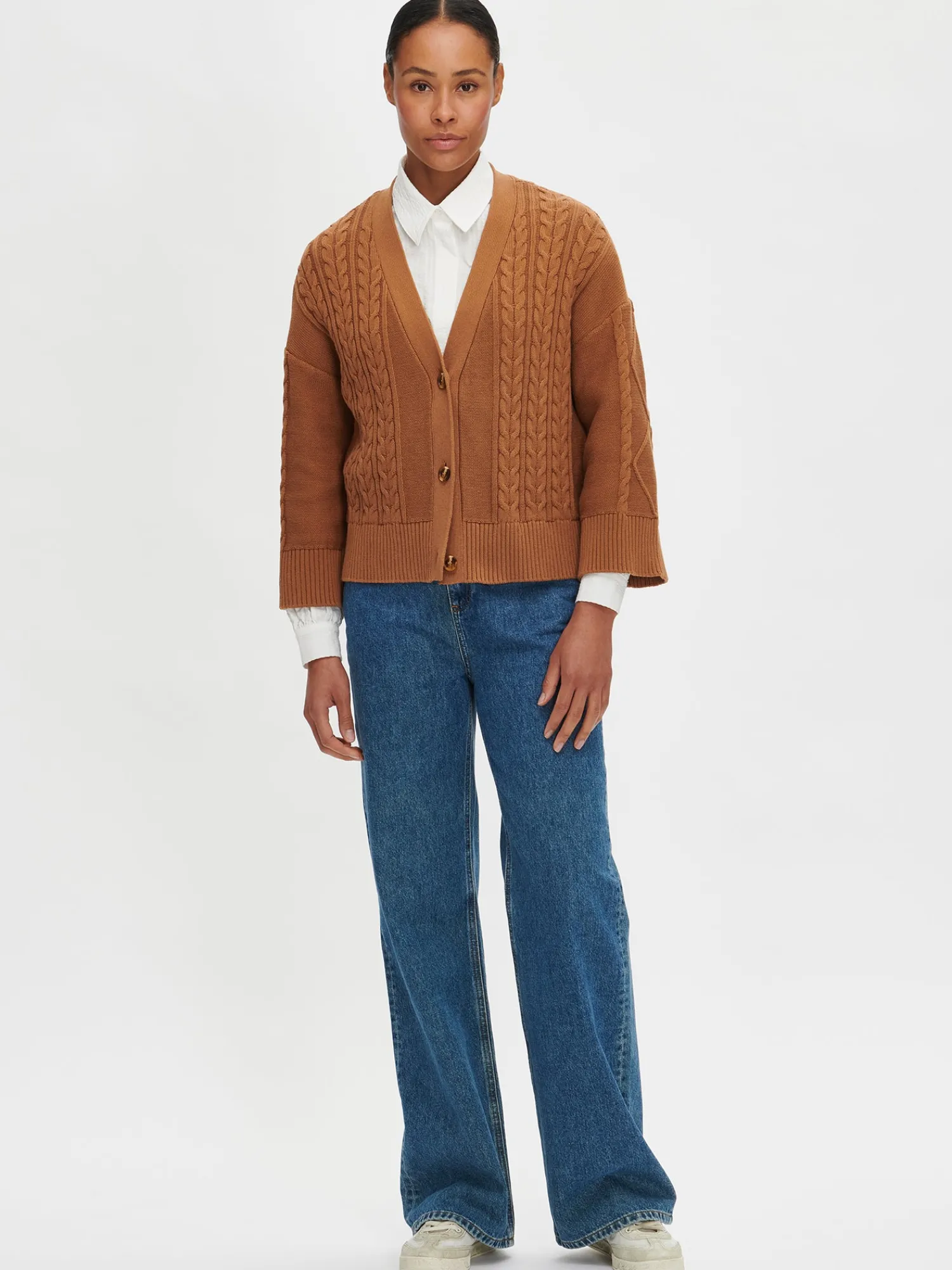 Naisten ruskea Coletta-neuletakki kauniilla palmikkokuviolla. Laadukas puuvillaneuletakki on vaatekaapin luottovaate ja kulmakivi. Neuletakissa on edessä napitus, täyspitkät hihat ja hihansuissa sekä helmassa on resori. Tuotteen pituus koossa M on noin 58 cm. Neuletakki on valmistettu laadukkaasta sertifioidusta puuvillasta. Neuleen hoito-ohjeet löydät .