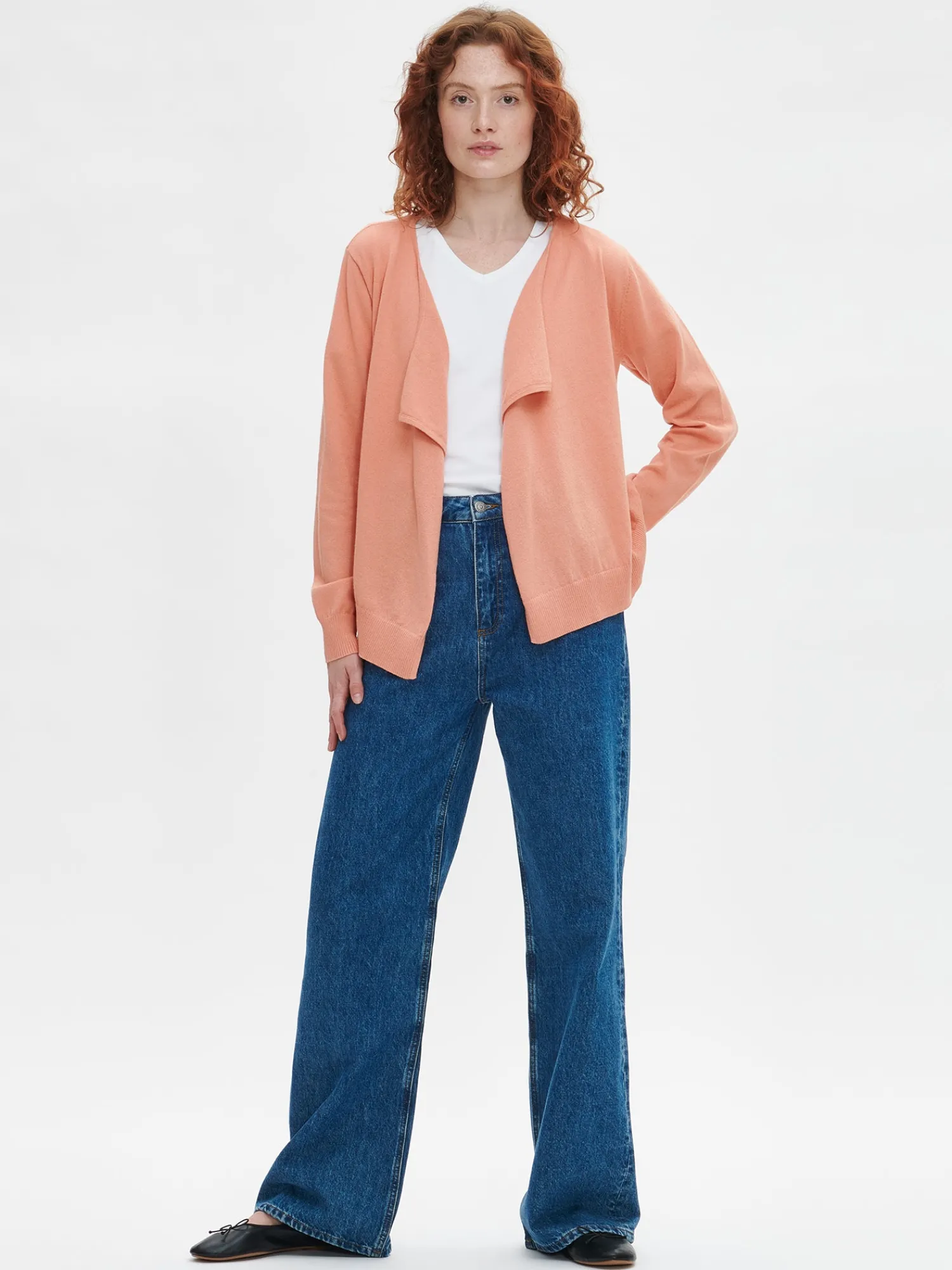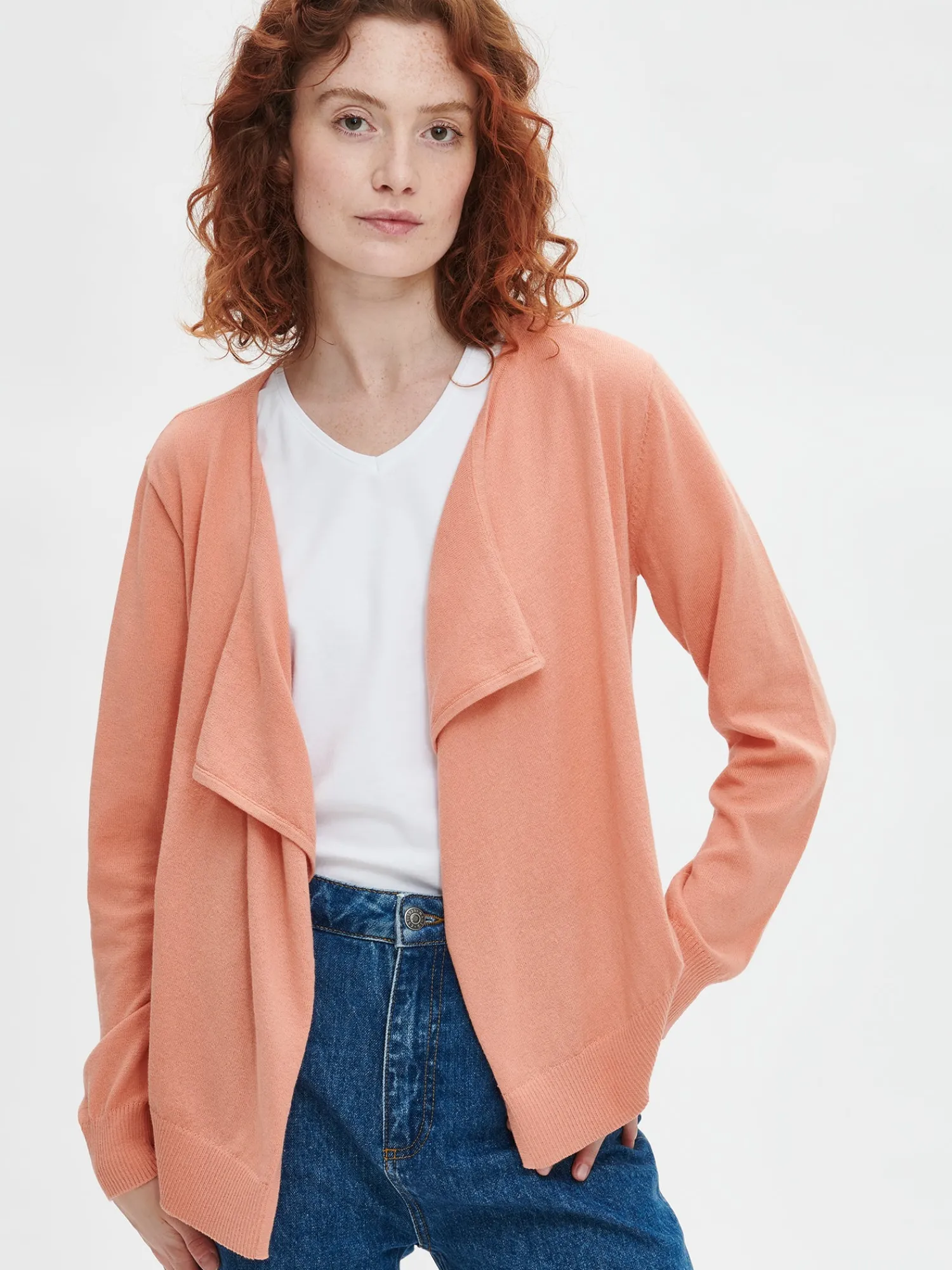 Naisten rento koralli Iisa-neuletakki. Rentoon ja mukavaan neuletakkiin on ihanaa pukeuta. Muotoonneulotussa neuletakissa on kauniisti laskeutuva leveä etukappale ja täyspitkät hihat. Hihansuissa ja helmassa on kapea ribbi. Neuletakin pituus koossa M on noin 60 cm. Pehmeän neuleen materiaali on sertifioitua puuvillaa ja kierrätettyä polyesteria.