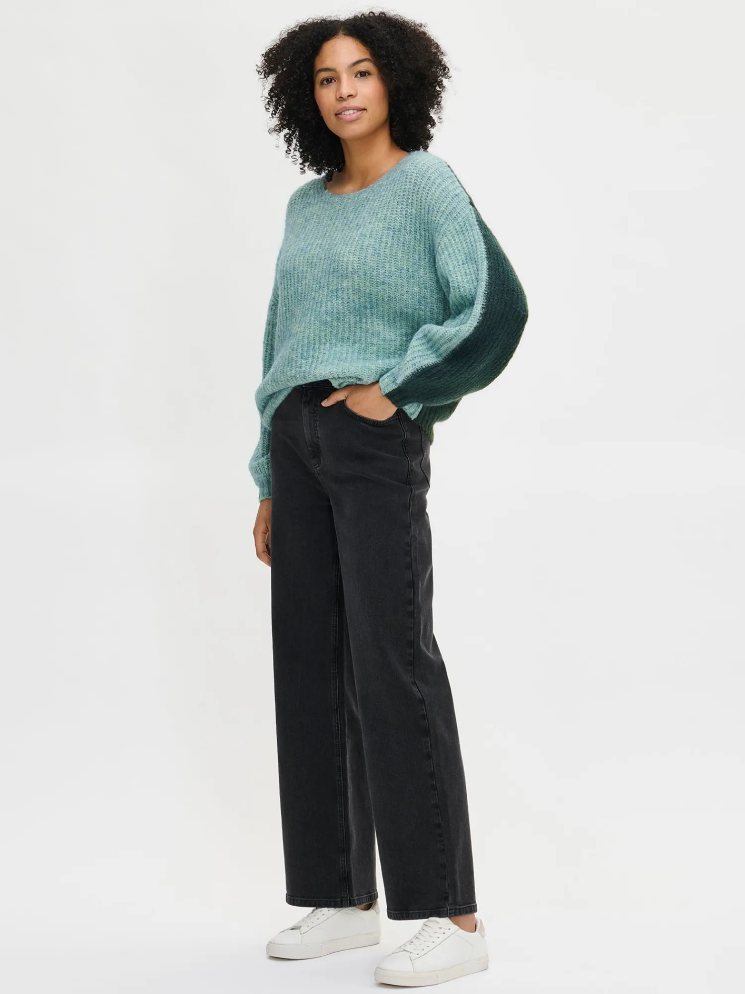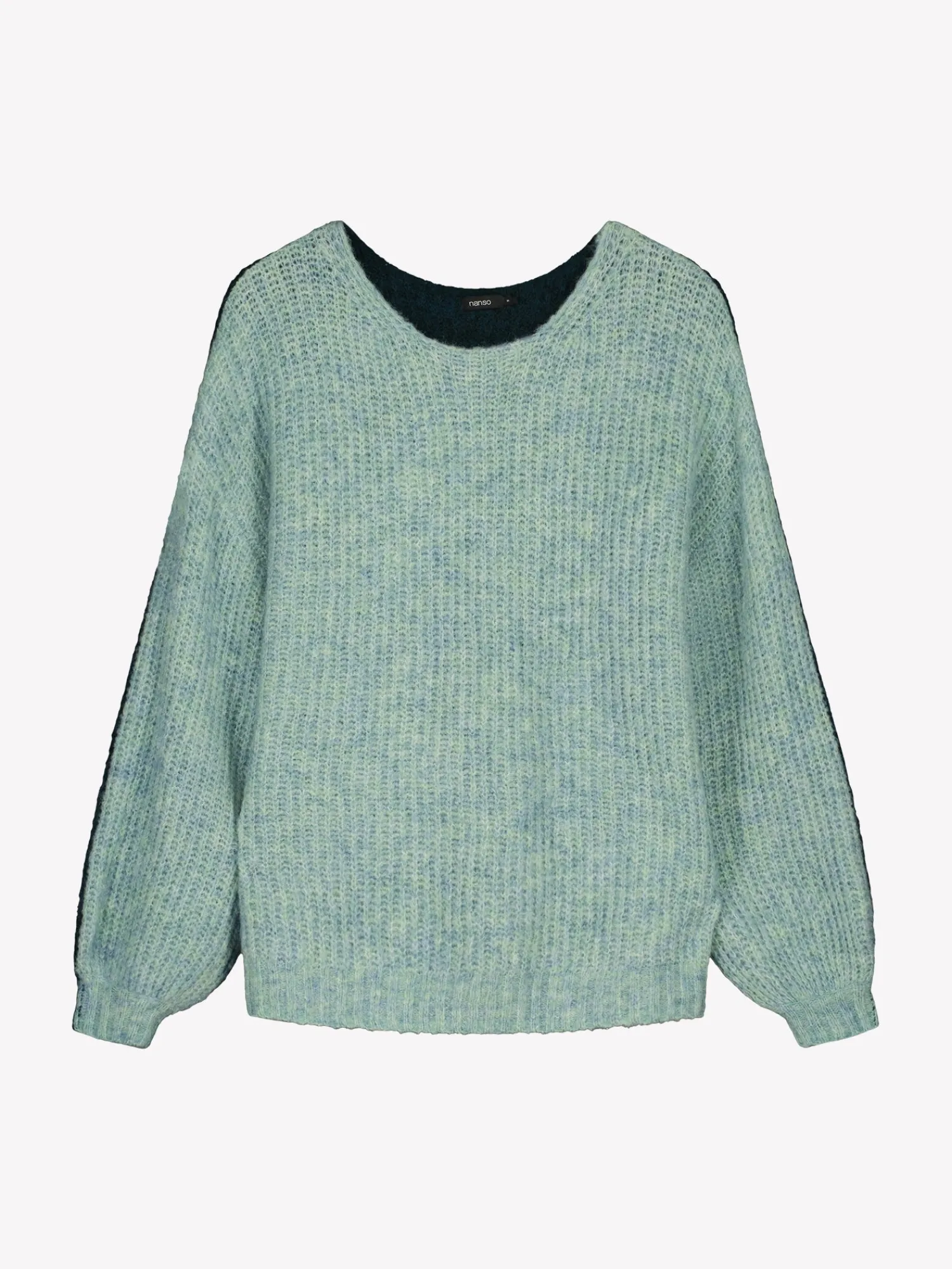 Naisten ylellinen vihreä Karamelli-neulepusero, jossa etu ja takakappale ovat eriväriset. Muhkean neulepuseron neulos on sekoite, jossa on osaksi sertifioitua mohairia, sertifioitua villaa, polyamidia ja hieman elastaania. Muotoonneulotussa neulepuserossa on vene pääntie ja täyspitkät suoralinjaiset hihat. Neulepuseron pituus koossa M on noin 61 cm.