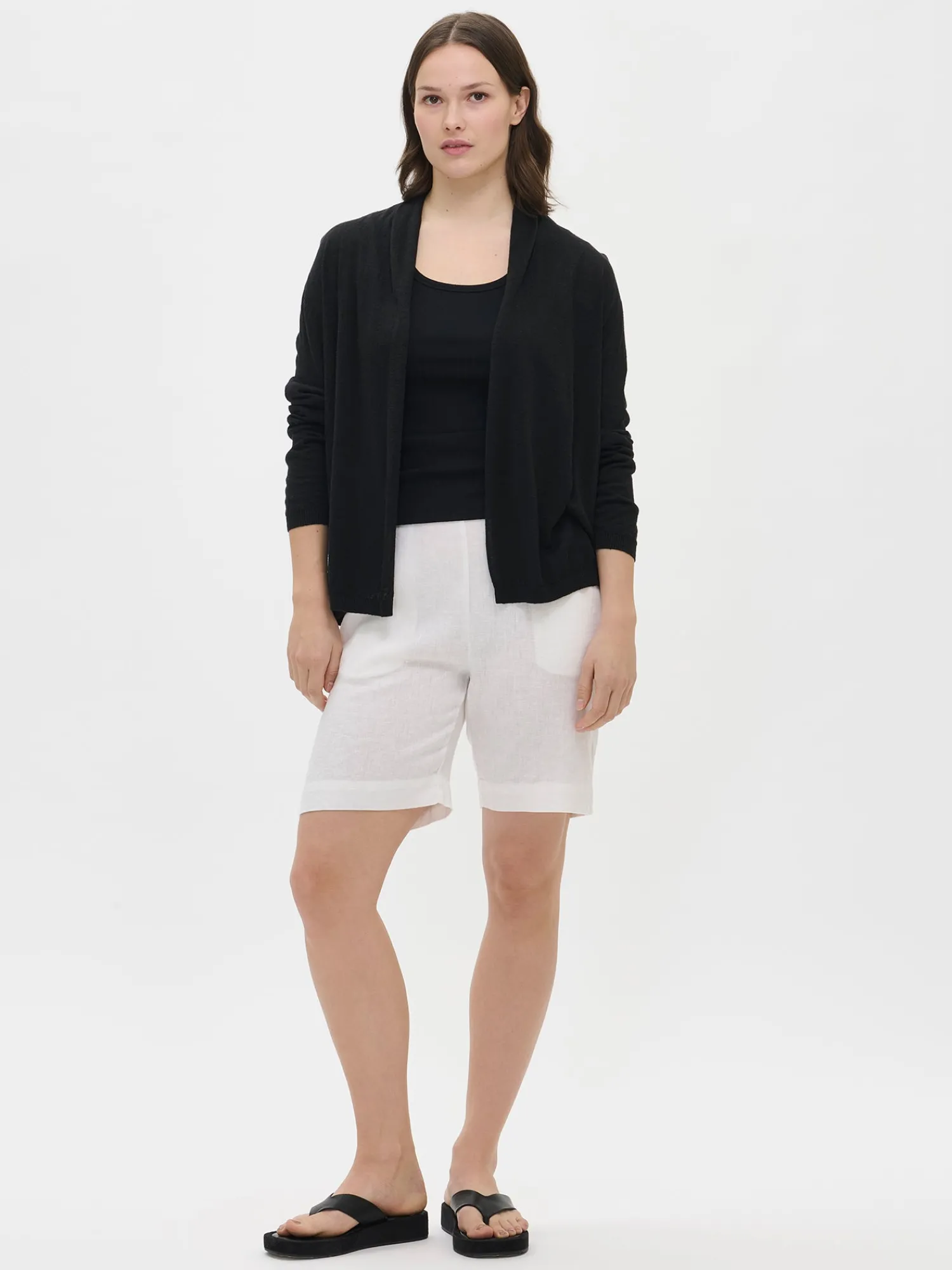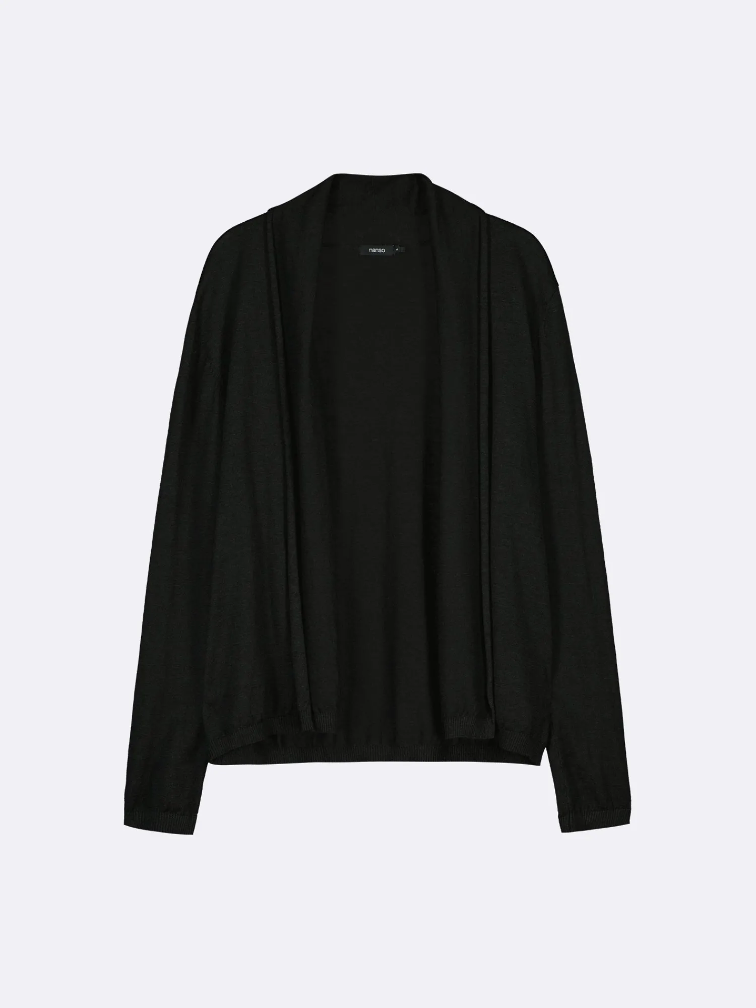 Naisten pitkähihainen musta Karina-neuletakki. Mukava ja kevyt neuletakki on muotoonneulottu laadukkaasta pellavan ja viskoosin sekoitteesta. Tyylikäs neuletakki on juuri sopiva kesäksi. Neuletakissa on klassinen shaalikaulus ja täyspitkät hihat. Neulatakin pituus koossa M on noin 60 cm.
