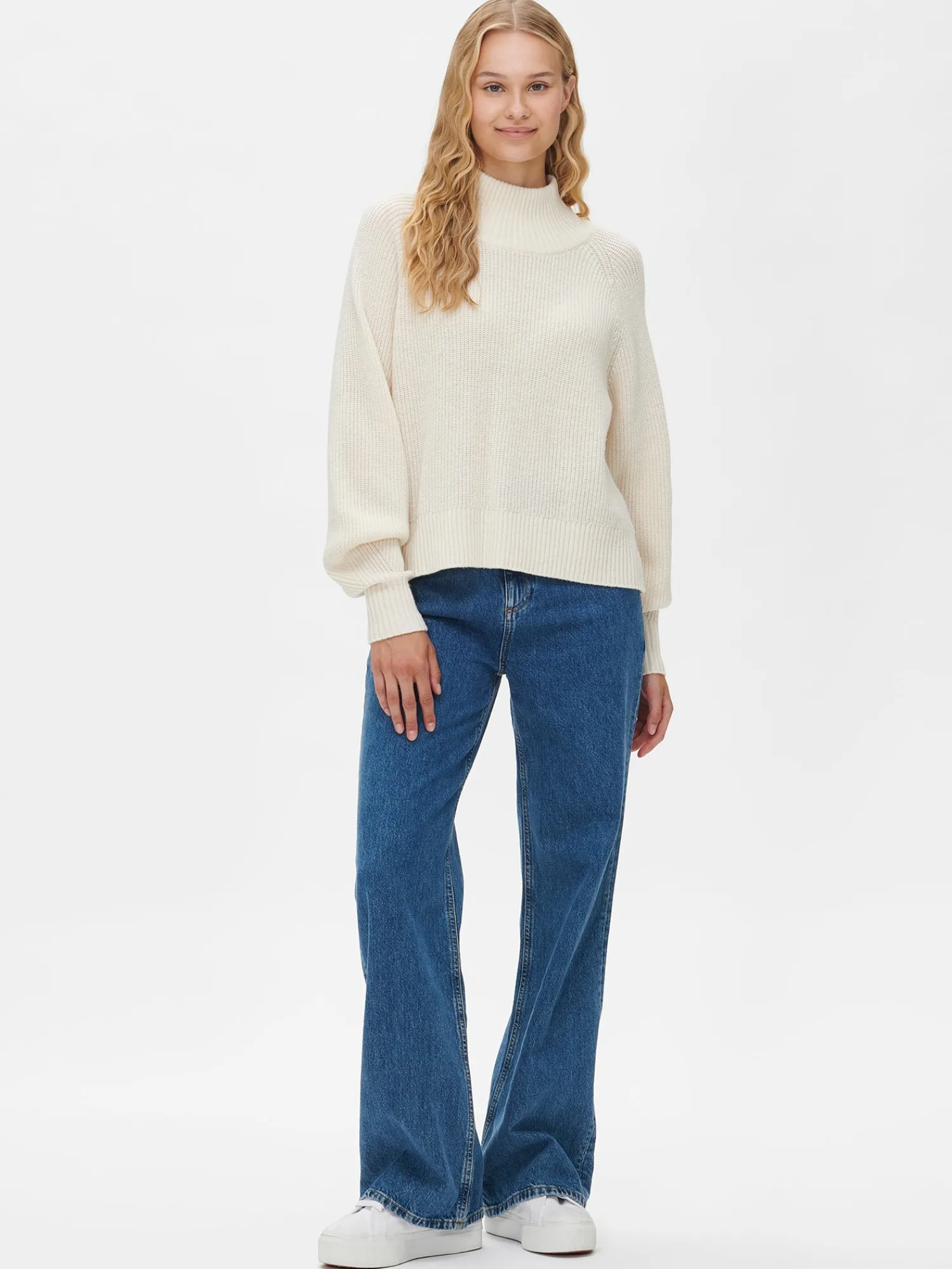 Naisten lämmin luonnonvalkoinen Nora-neulepusero. Mukavaan neulepaitaan on ihanaa pukeutua sään viilentyessä. Yhdistä neulepaita vaikka tyylikkäiden farkkujen tai suorien housujen pariksi. Neulepuserossa on pystykaulus ja täyspitkät hihat. Neulepuseron pituus koossa M on noin 55 cm. Puolipatenttineulos on pehmeän ja miellyttävän tuntuista villa-polyamidi sekoitetta. Tuotteen valmistuksessa on käytetty sertifioitua villaa. Neuleen hoito-ohjeet löydät