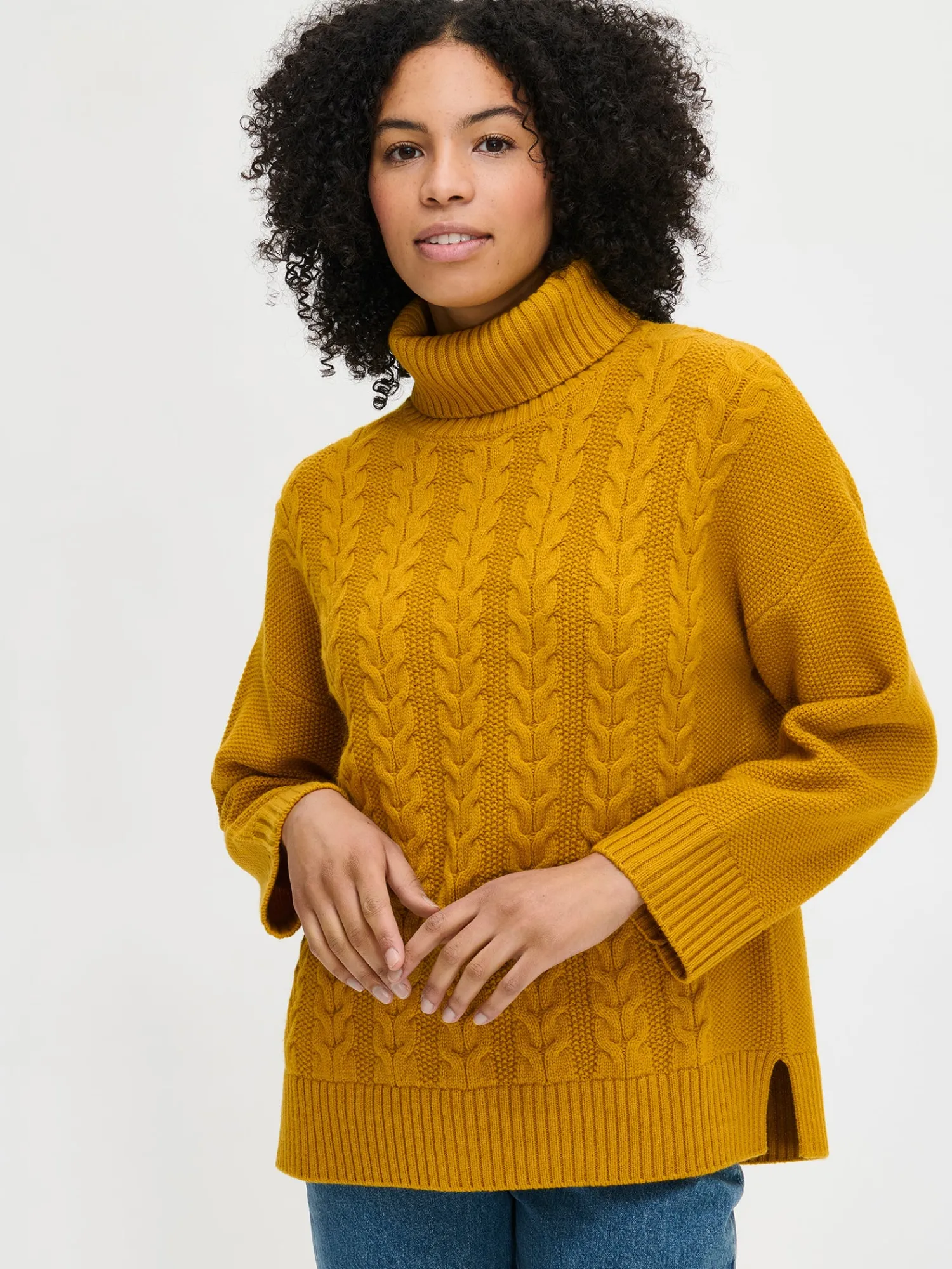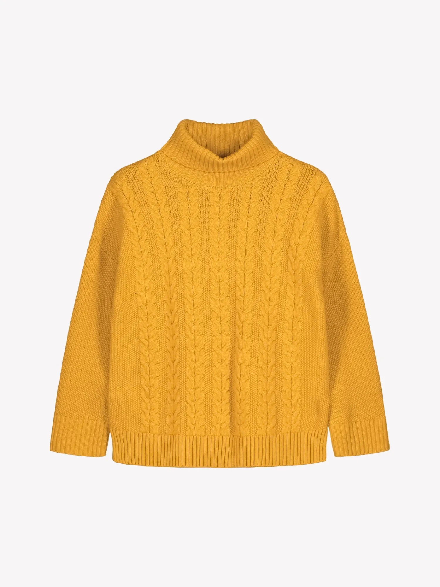 Naisten rento keltainen Palmikko-neulepusero poolokauluksella. Muotoonneulotussa neulepuserossa on pystykaulus, pudotettu olkalinja, täyspitkät hihat ja sivuhalkiot. Hihansuissa ja helmassa on resori. Neulepuserossa on kaunis neulottu palmikkokuvio ja sen pituus koossa M on noin 66 cm. Neulos on pehmeän ja miellyttävän tuntuista villa-polyamidi sekoitetta. Tuotteen valmistuksessa on käytetty sertifioitua villaa.