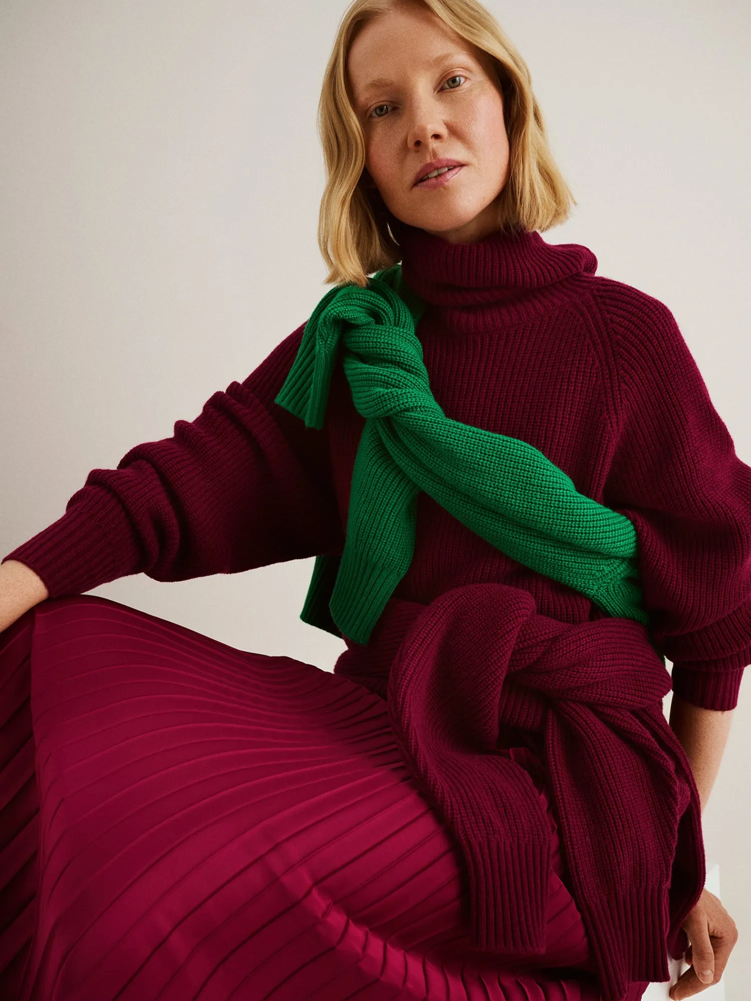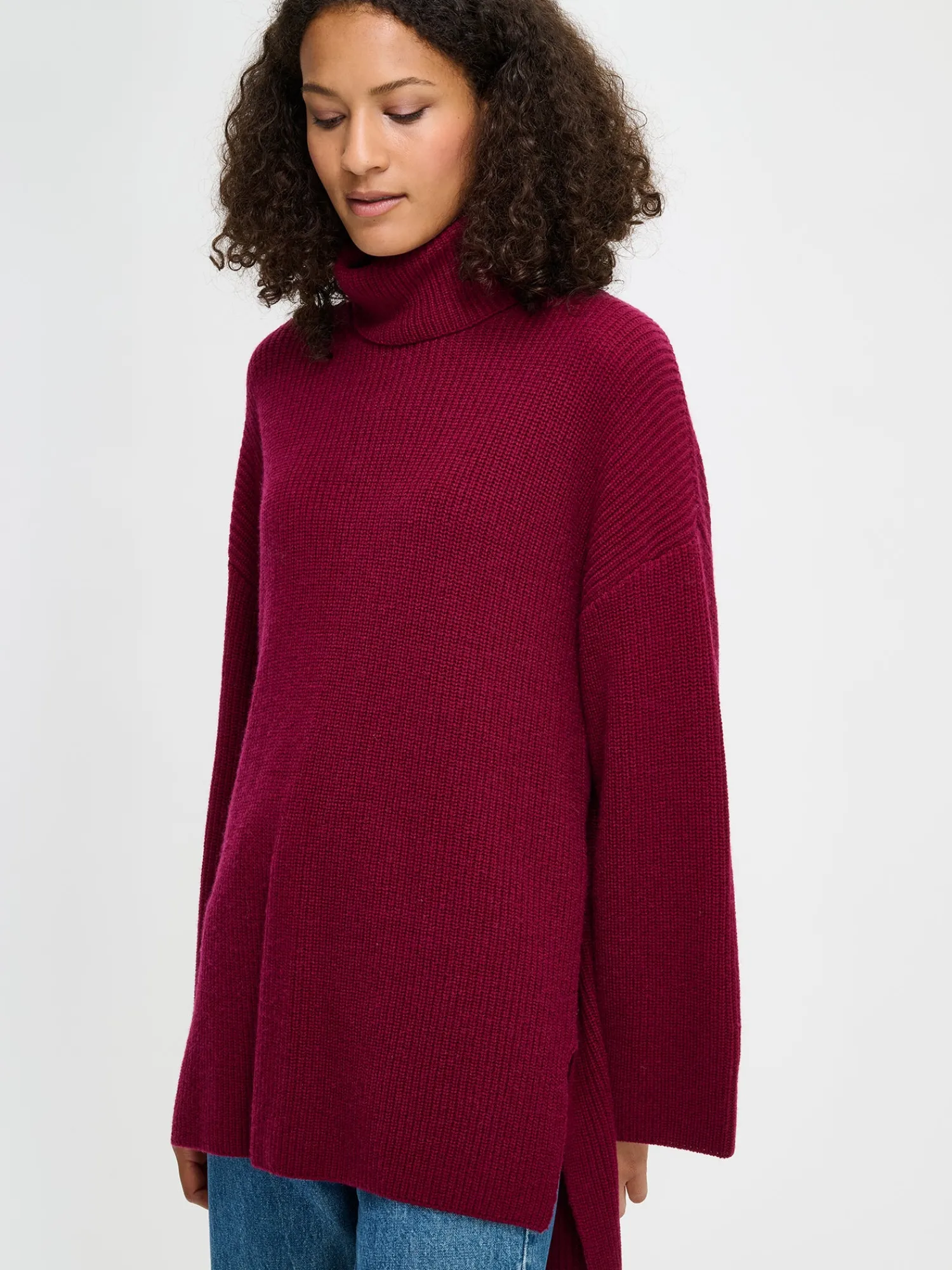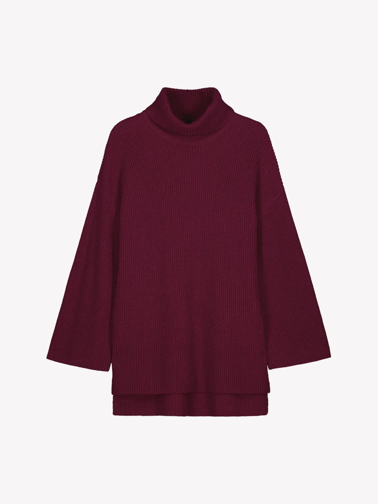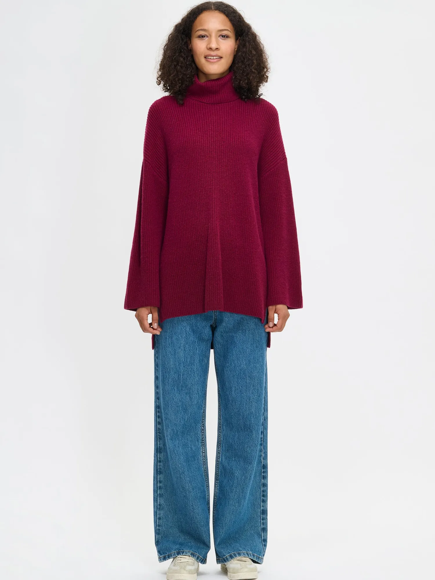 Naisten rento viininpunainen Pamela-neulepusero poolokauluksella. Neulepuserossa on pystykaulus, pudotettu olkalinja ja leveät täyspitkät hihat. Helmassa on sivuissa halkiot. Neulepuseron pituus koossa M on noin 70 cm ja helma on takaa 6cm pidempi. Neulepusero on puolipatenttineulosta. Neulos on pehmeän ja miellyttävän tuntuista villa-viskoosi-polyamidi sekoitetta. Tuotteen valmistuksessa on käytetty sertifioitua villaa. Neuleen hoito-ohjeet löydät