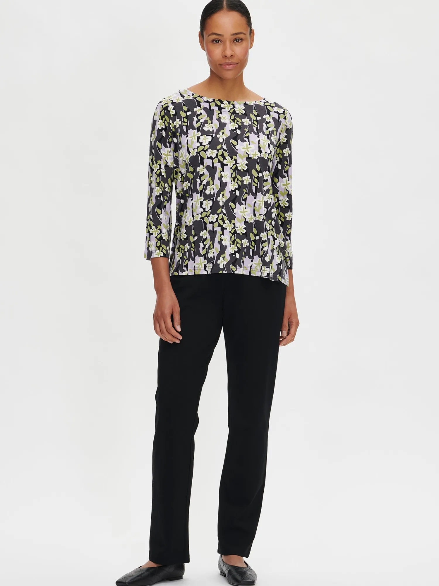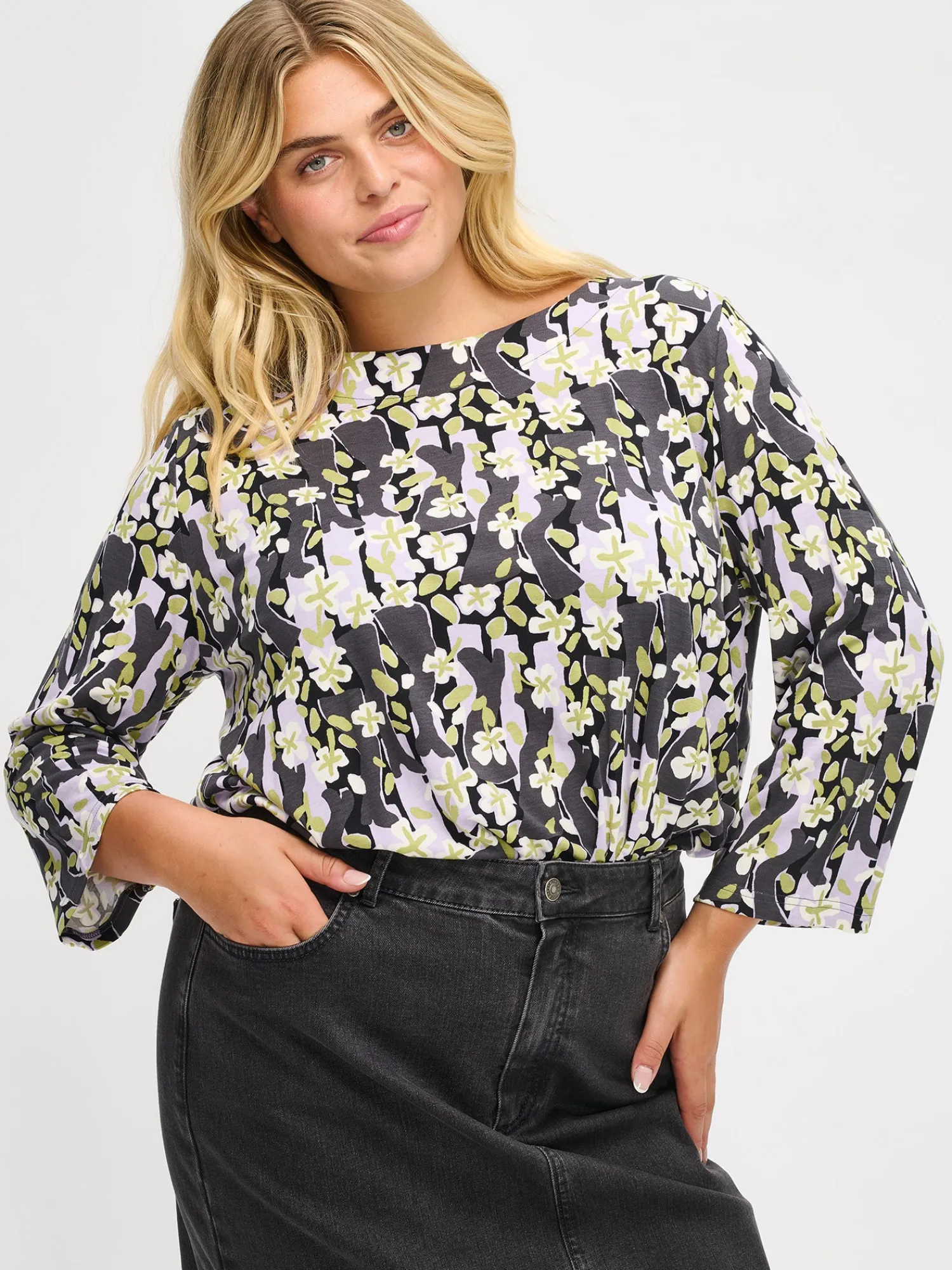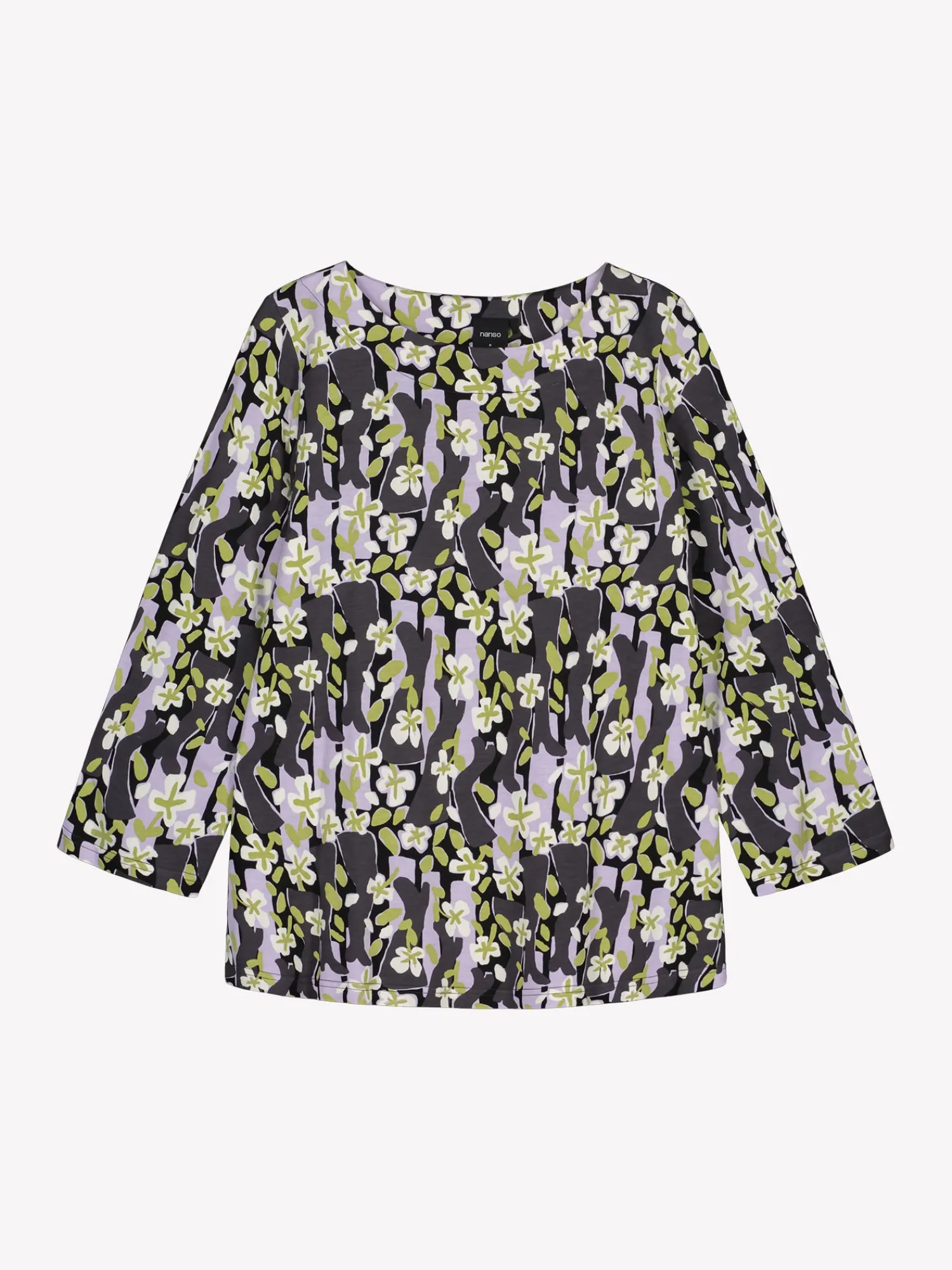 Naisten kuosillinen harmaa Bootsit-pusero. Väljässä puserossa on alavaralla viimeistelty ovaali pääntie, 3/4 pituiset hihat ja suora helma sivuhalkioilla. Puseron pituus koossa M on noin 60 cm ja sivuissa on halkiot. Materiaali on laadukasta, miellyttävän tuntuista ja laskeutuvaa viskoosi-elastaani-neulosta, joka pysyy hyvänä pesusta toiseen. Tuote on valmistettu LENZING™ ECOVERO™-viskoosista. Materiaalille on ominaista 3-5 % kutistuminen ensimmäisessä pesussa.