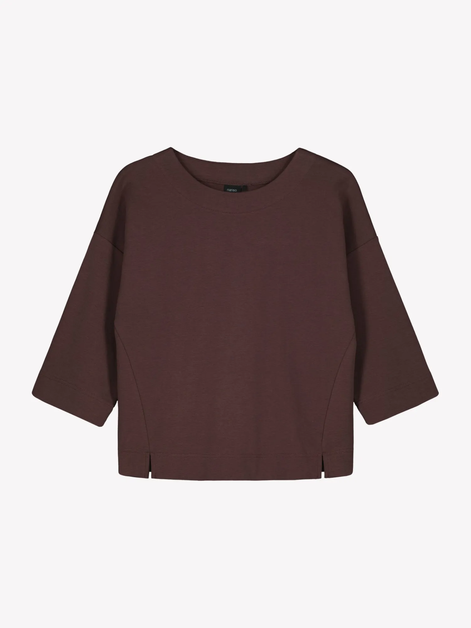 Naisten rento, ruskea Elena-pusero. Laatikkomaisessa puserossa on alavaralla huoliteltu ovaali pääntie ja 3/4 pituiset hihat. Olkalinja on reilusti pudotettu ja helmassa on halkiot. Puseron sivusauma tulee hienovaraisesti etupuolelle, korostaen vartalon linjoja ja tuoden asuun kevyttä muotoa. Puseron pituus koossa M on noin 62 cm. Materiaali on miellyttävää ja joustavaa puuvilla-polyesteri-elastaanineulosta. Pehmeä ja joustava Elena-pusero on helppo yhdistää eri asuihin, ja se tuo arkeen ajattoman mukavuutta.