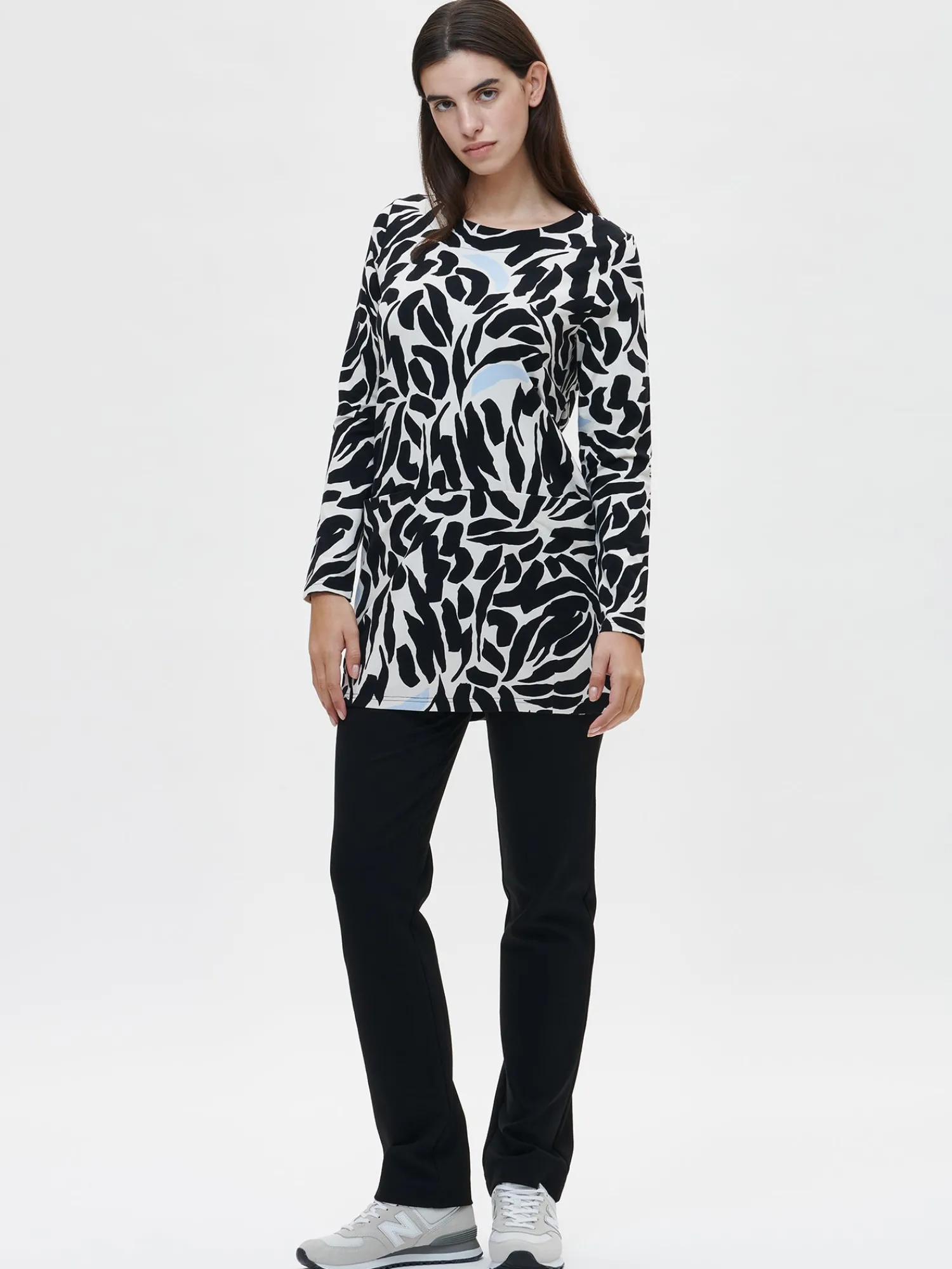 Naisten kuosillinen beige Flavia-tunika pitkillä hihoilla. Rentolinjaisessa tunikassa on helmassa muotolaskokset luomassa tulppaanimaista muotoa. Pyöreä pääntie on viimeistelty alavaralla, edessä leikkaussaumassa on upotettuna taskut ja hihat ovat täyspitkät. Tunikan pituus koossa M on noin 80 cm. Materiaali on laadukasta ja miellyttävän tuntuista puuvilla-elastaani-neulosta.