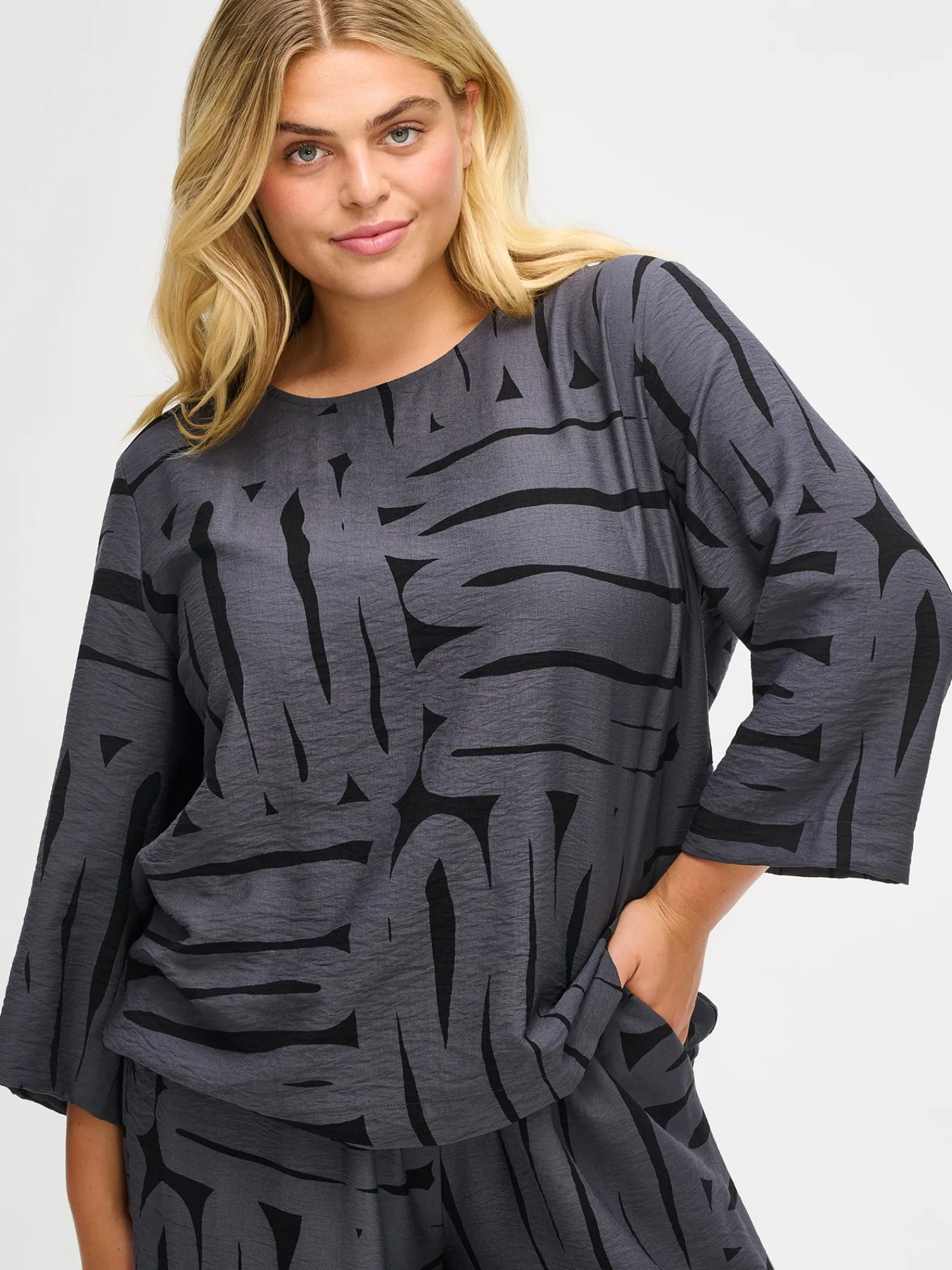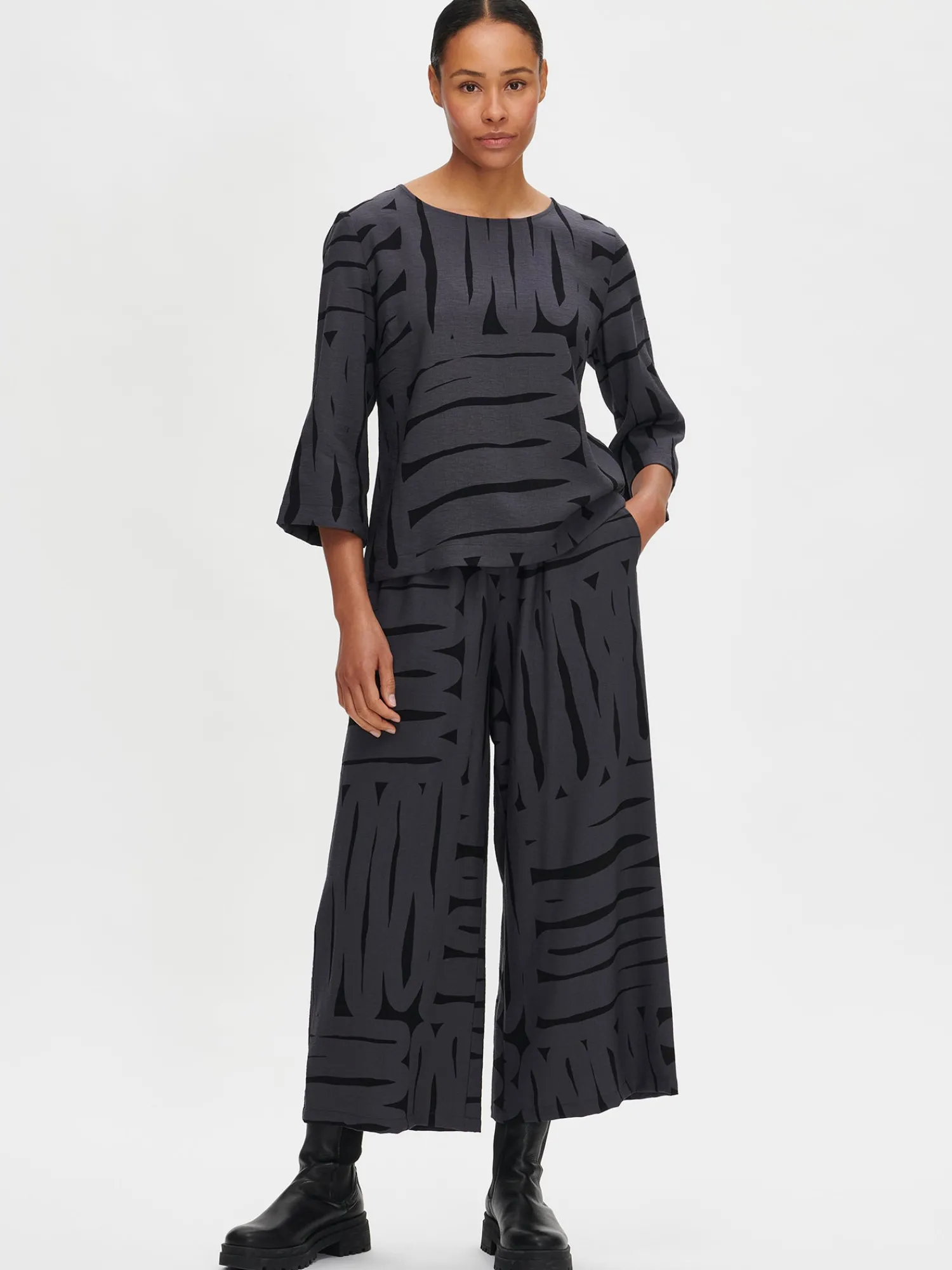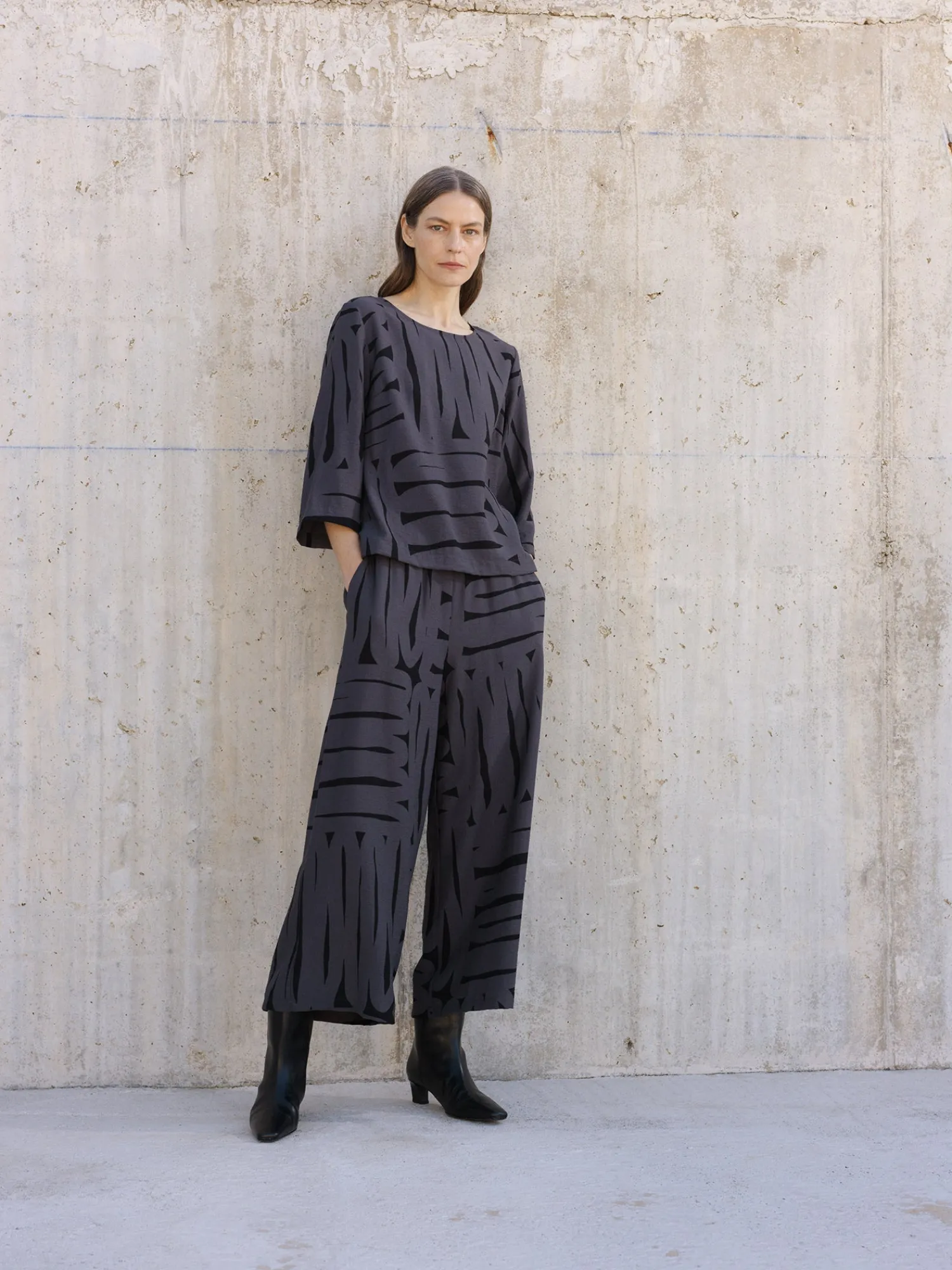 Naisten kuosillinen harmaa Kaiku-pusero. Pusero yhdistyy kauniisti samanvärisiin Kaiku-housuihin. Suoralinjaisessa puserossa on kantilla viimeistelty ovaali pääntie, jonka takana on nappihalkio. Väljät hihat ovat 3/4 pituiset. Puseron pituus koossa 38 on noin 62 cm. Materiaali on laadukasta ja miellyttävän tuntuista, kevyttä twill-sidoksista viskoosi-polyamidikangasta.