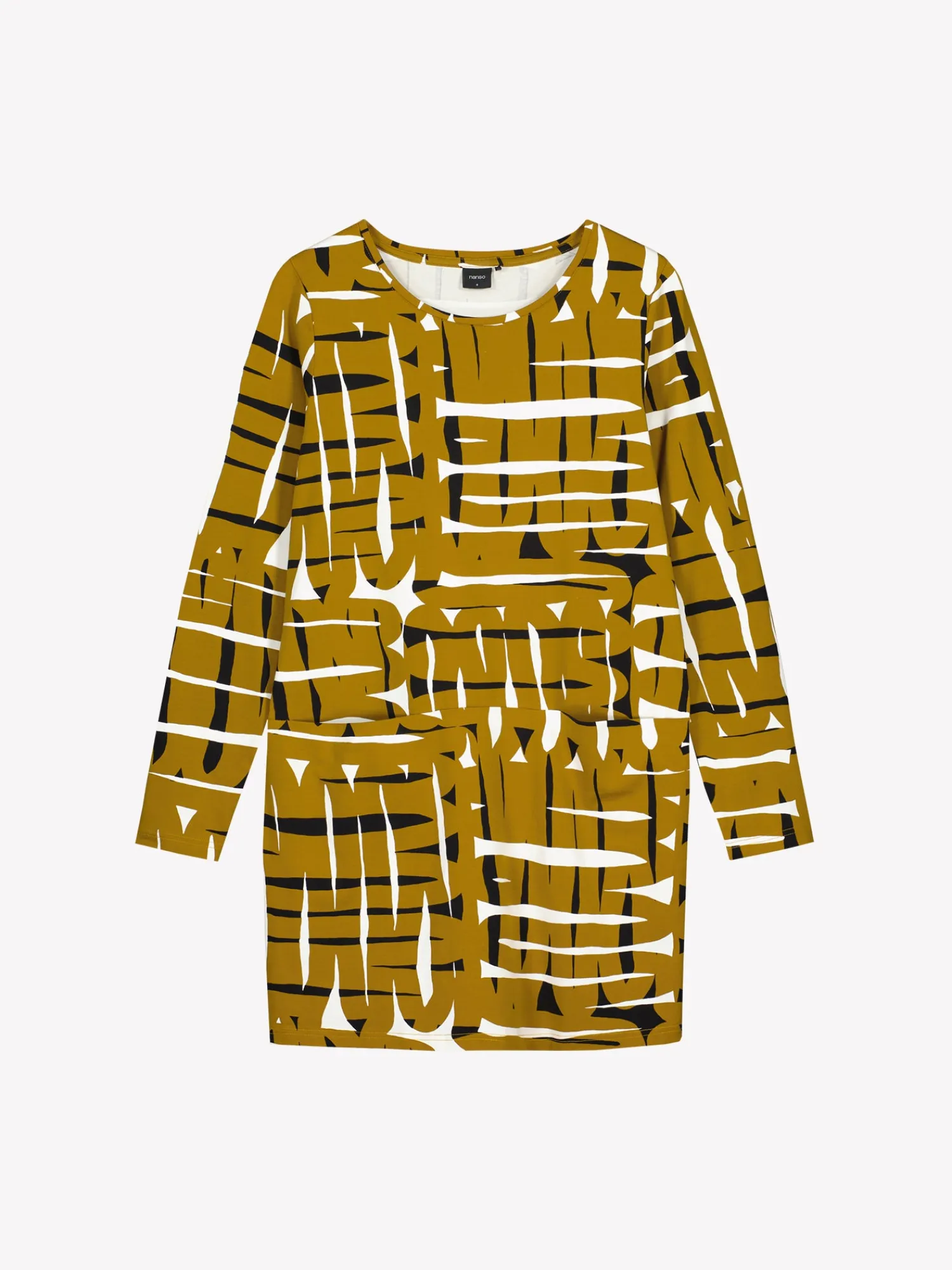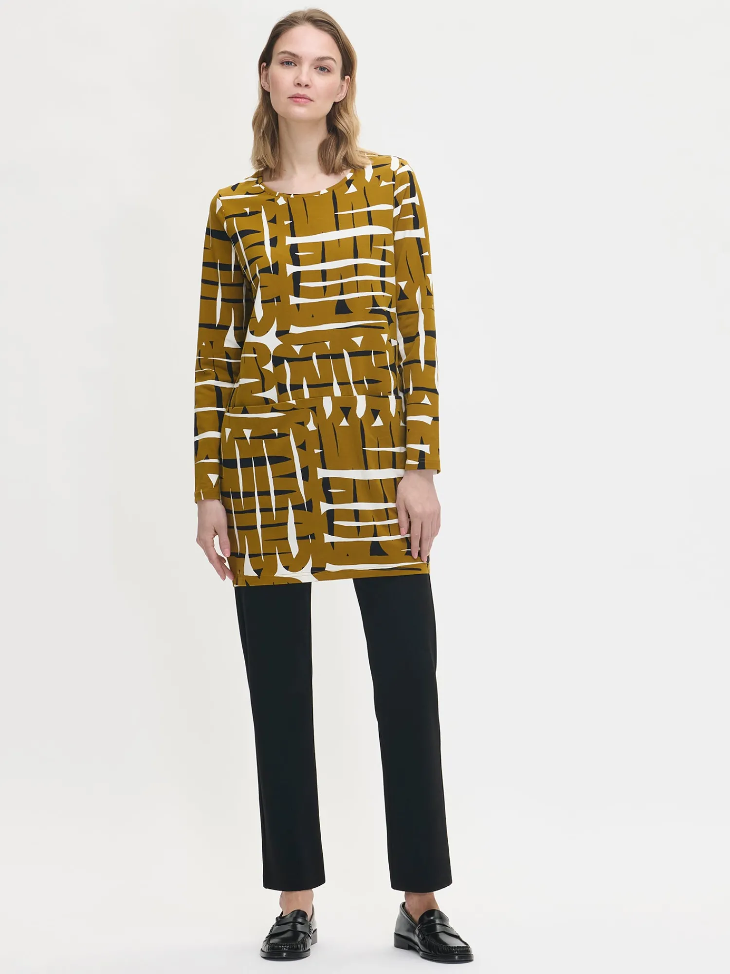 Naisten kuosillinen ruskea Kaiku-tunika. Suoralinjaisessa tunikassa on tereellä viimeistelty pyöreä pääntie ja täyspitkät hihat. Tunikan leikkaussaumassa on upotettuna taskut. Tunikan pituus koossa M on noin 85 cm. Materiaali on miellyttävän tuntuista ja helppohoitoista puuvilla-elastaani-neulosta.