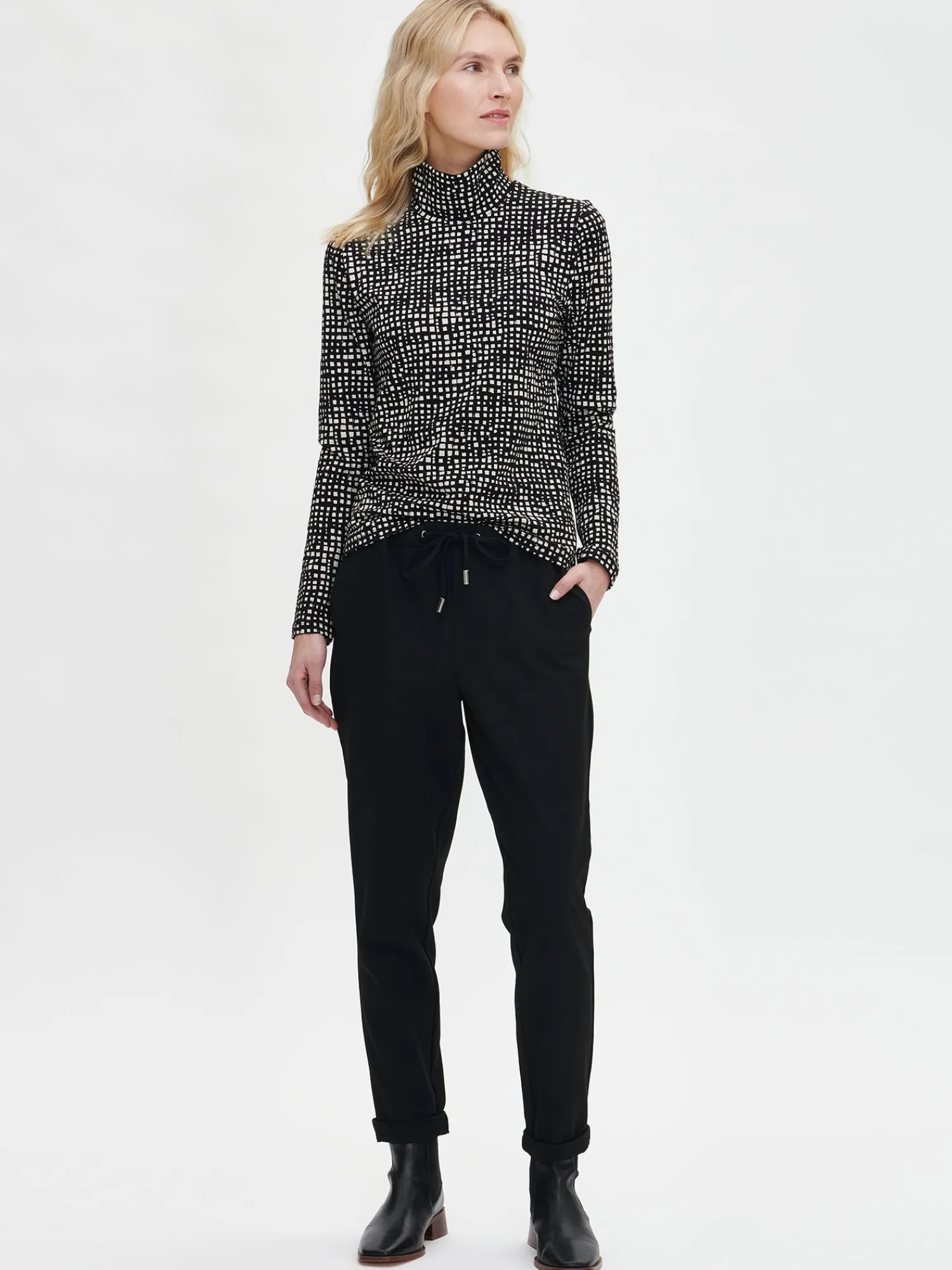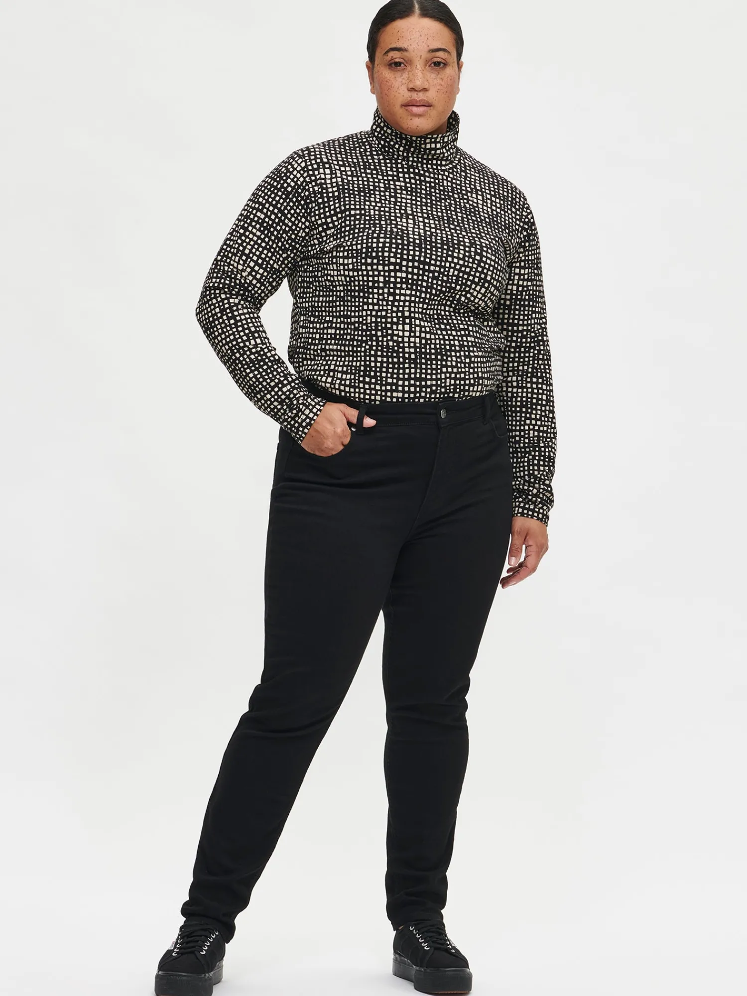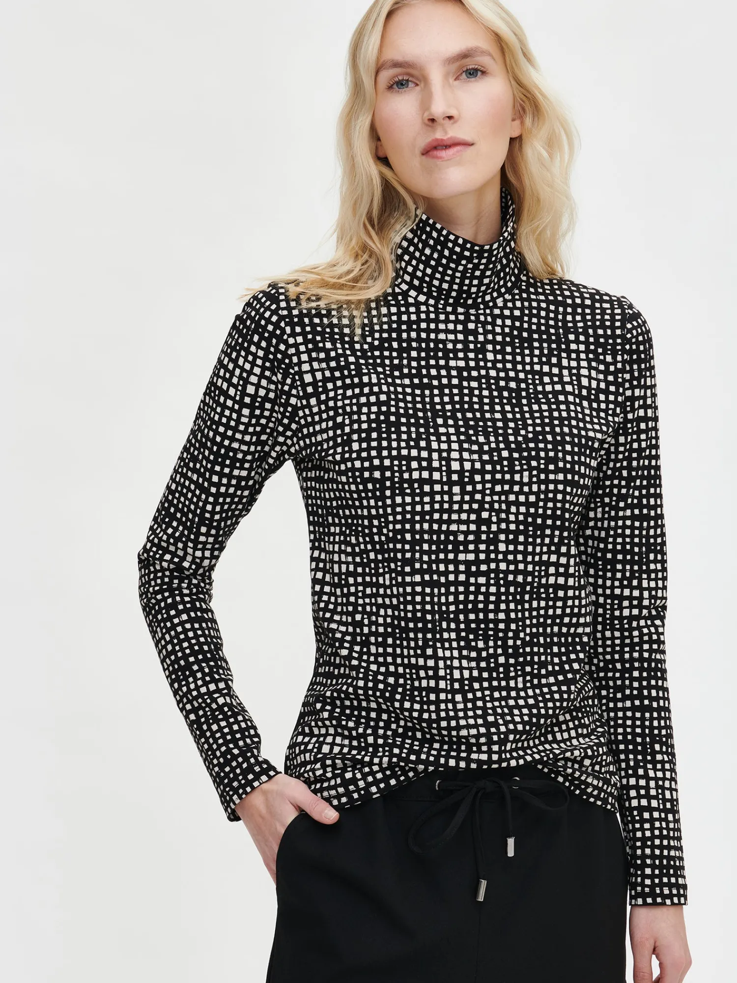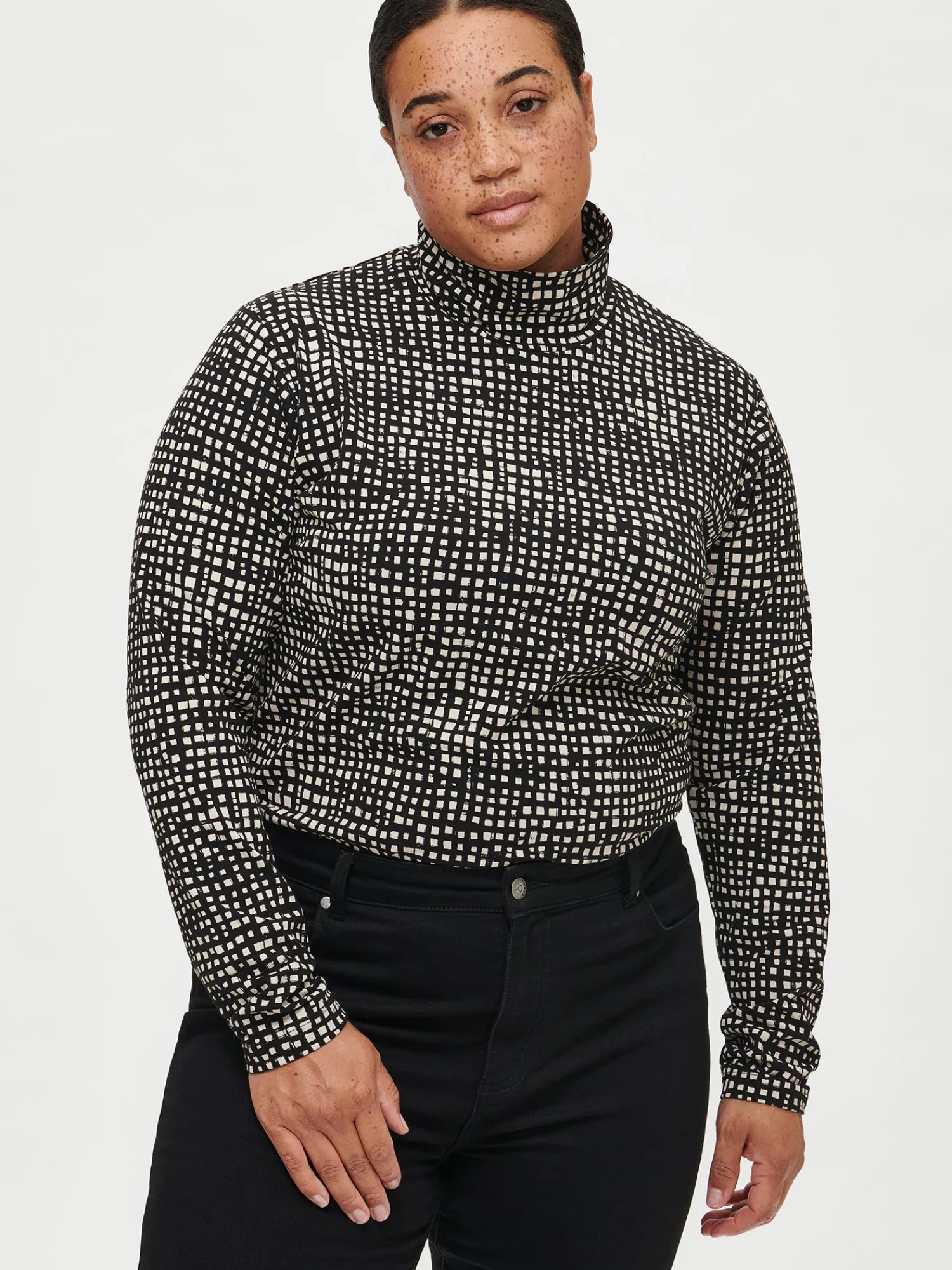 Naisten kuosillinen mustavalkoinen Karmi-poolopusero. Kuosillinen poolo on näyttävä klassikko, johon haluaa pukeutua vuodesta toiseen. Monikäyttöisen poolon voi pukea myös lyhythihaisen mekon tai paidan alle. Istuvassa matalakauluksellisessa poolopuserossa on täyspitkät hihat. Puseron pituus koossa M on noin 65 cm. Materiaali on miellyttävää ja joustavaa puuvilla-elastaani-neulosta.