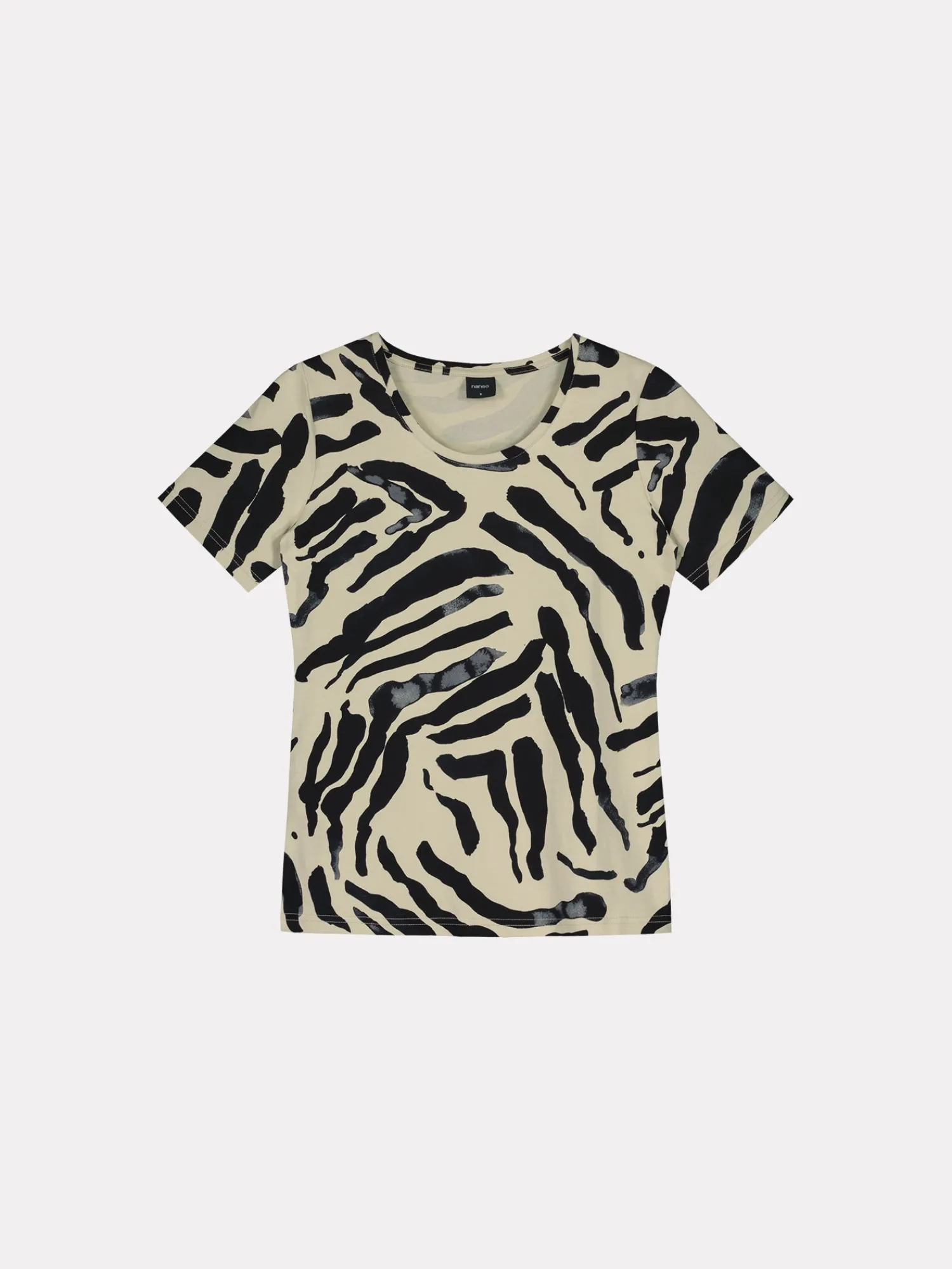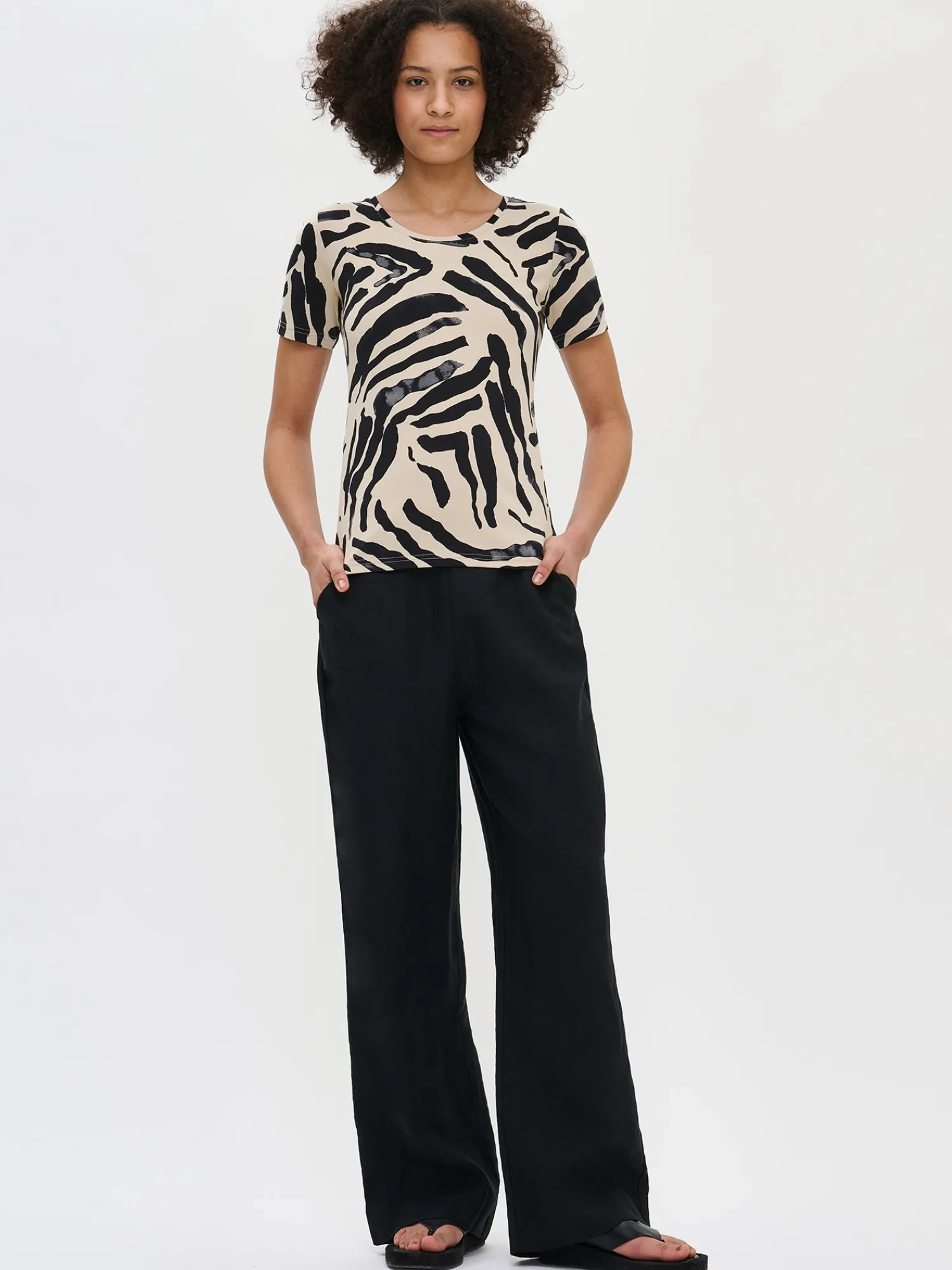 Naisten kuosillinen musta Klippan-pusero. Istuvassa puserossa on avara, pyöreä pääntie ja lyhyet hihat. Puseron pituus koossa M on noin 64 cm. Materiaali on laadukasta ja helppohoitoista puuvilla-elastaani-neulosta, joka pysyy hyvänä pesusta toiseen.
