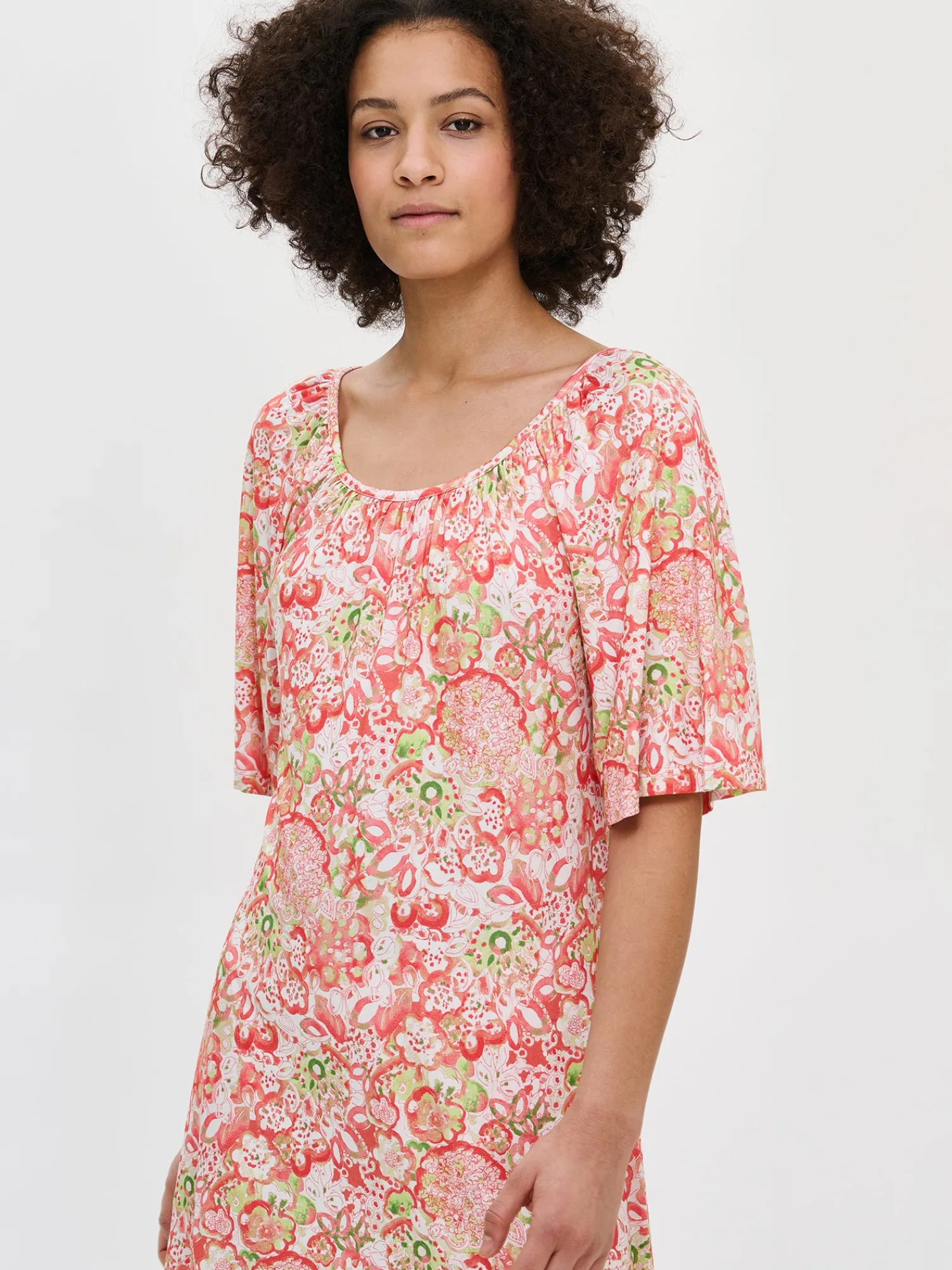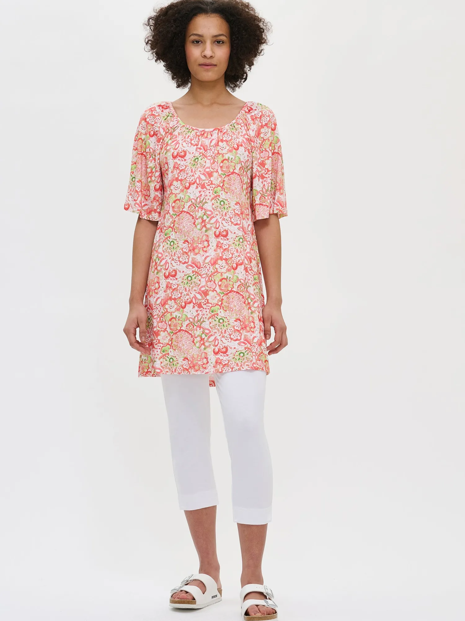 Naisten kuosillinen Kreeta-tunika. Tunikassa on kantilla poimutettu pyöreä pääntie, sivuissa taskut ja 2/4 pituiset kellotetut hihat. Tunikan pituus koossa M on noin 85 cm. Materiaali on laadukasta ja miellyttävän tuntuista, ohutta viskoosi-elastaani-neulosta. Viskoosineulos on sähköistymätöntä ja helppohoitoista. Tuote on valmistettu LENZING™ ECOVERO™ -viskoosista. Materiaalille on ominaista 3-5% kutistuminen ensimmäisessä pesussa.