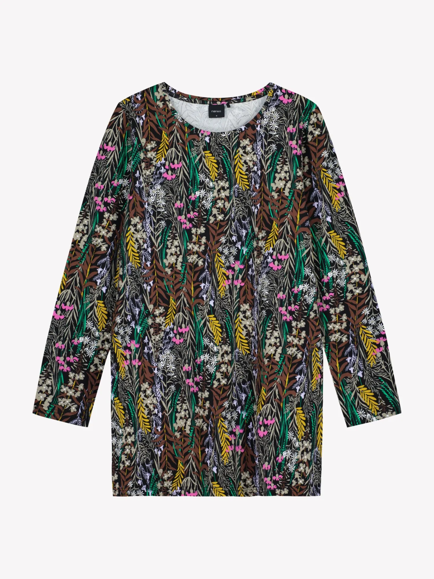 Naisten kuosillinen monivärinen Kuutamo-tunika. Tunikassa on tereellä viimeistelty pyöreä pääntie, sivuissa taskut ja täyspitkät hihat. Tunikan pituus koossa M on noin 80 cm. Materiaali on miellyttävän tuntuista ja helppohoitoista puuvilla-elastaani-neulosta.