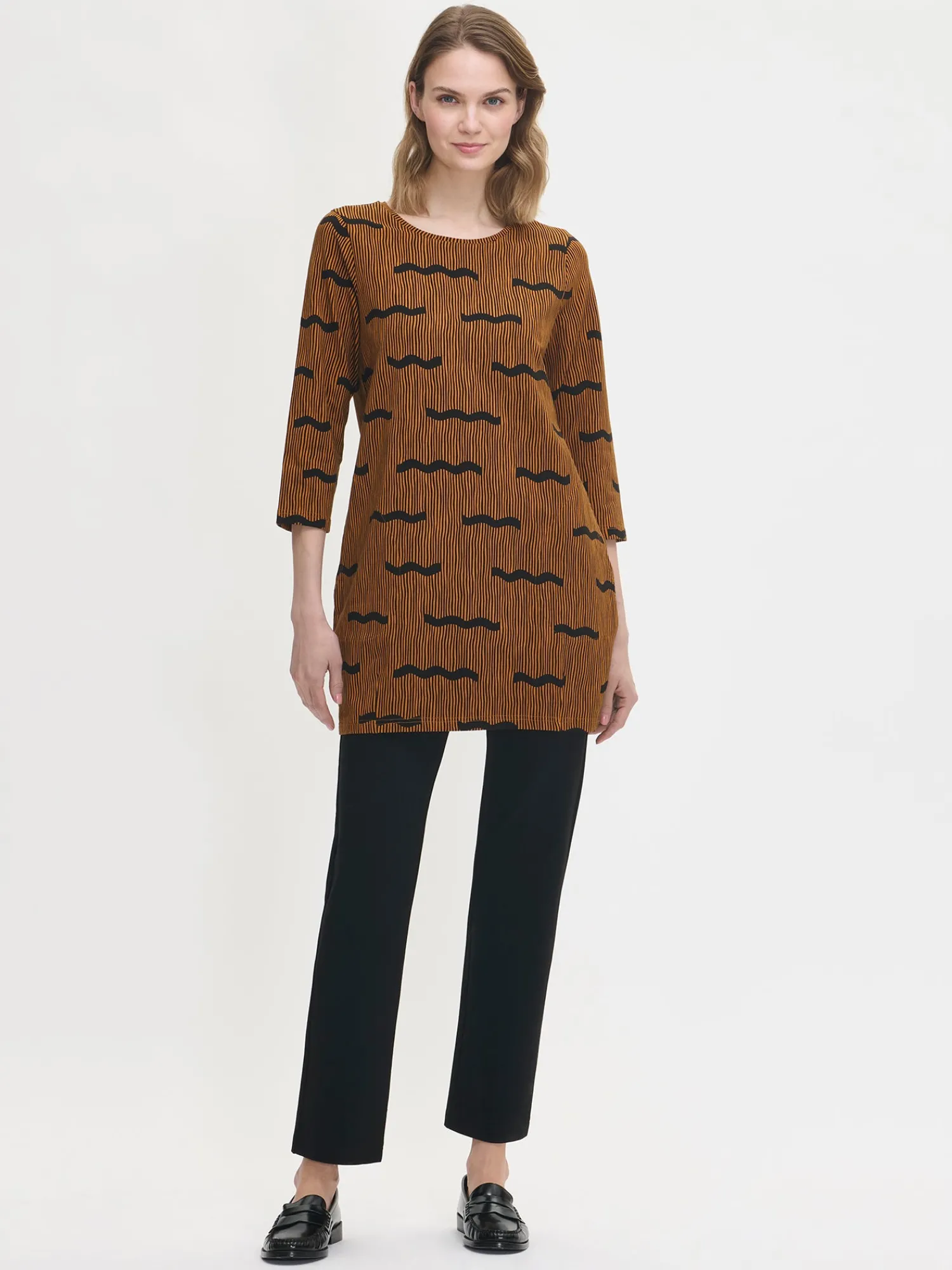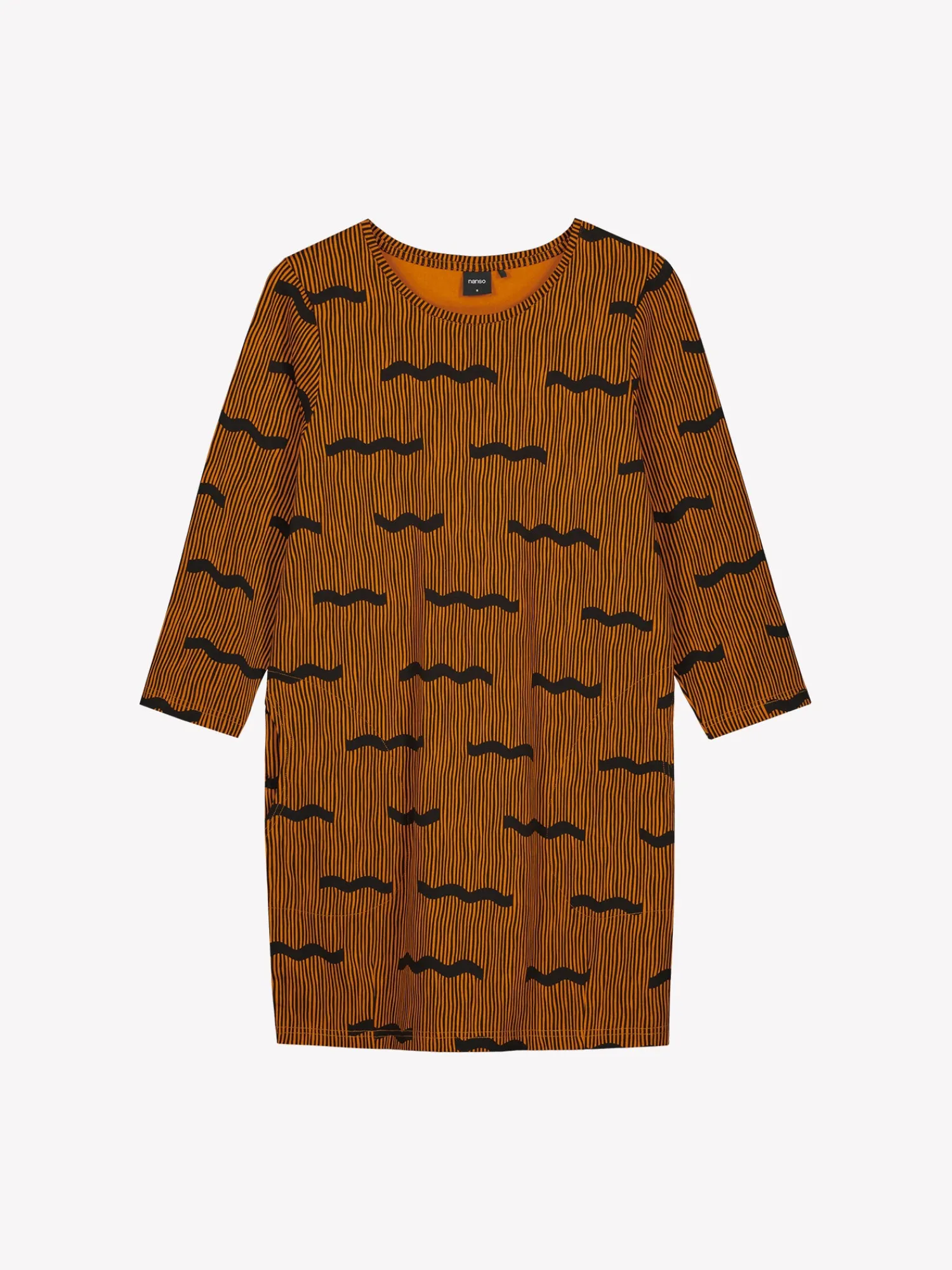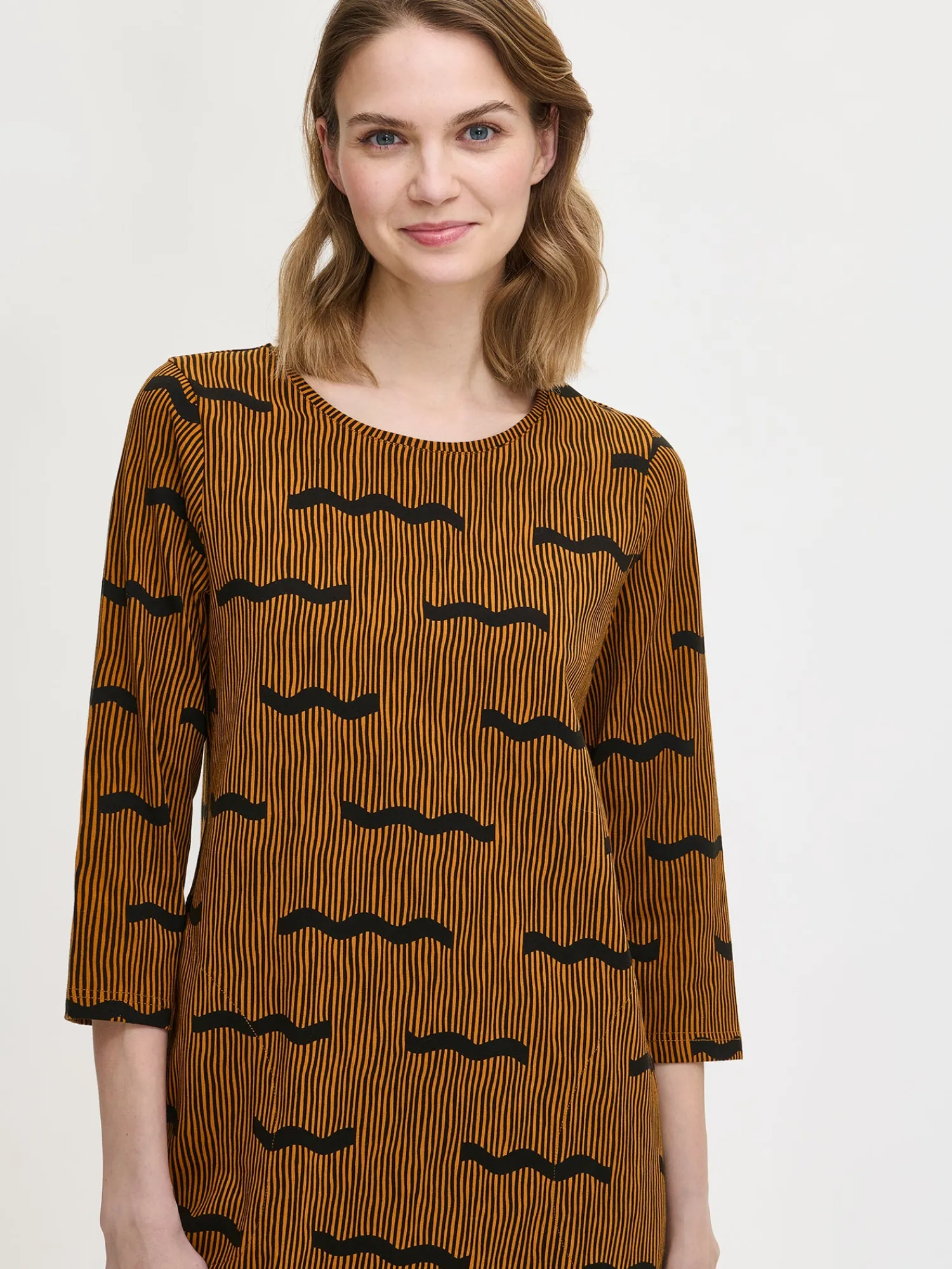 Naisten kuosillinen oranssi Laineilla-tunika. Rentolinjaisessa tunikassa on helmassa muotolaskokset luomassa tulppaanimaista muotoa. Pyöreä pääntie on viimeistelty tereellä, sivuissa on taskut ja hihat ovat 3/4 pituiset. Tunikan pituus koossa M on noin 85 cm. Materiaali on laadukasta ja miellyttävän tuntuista puuvilla-elastaani-neulosta.