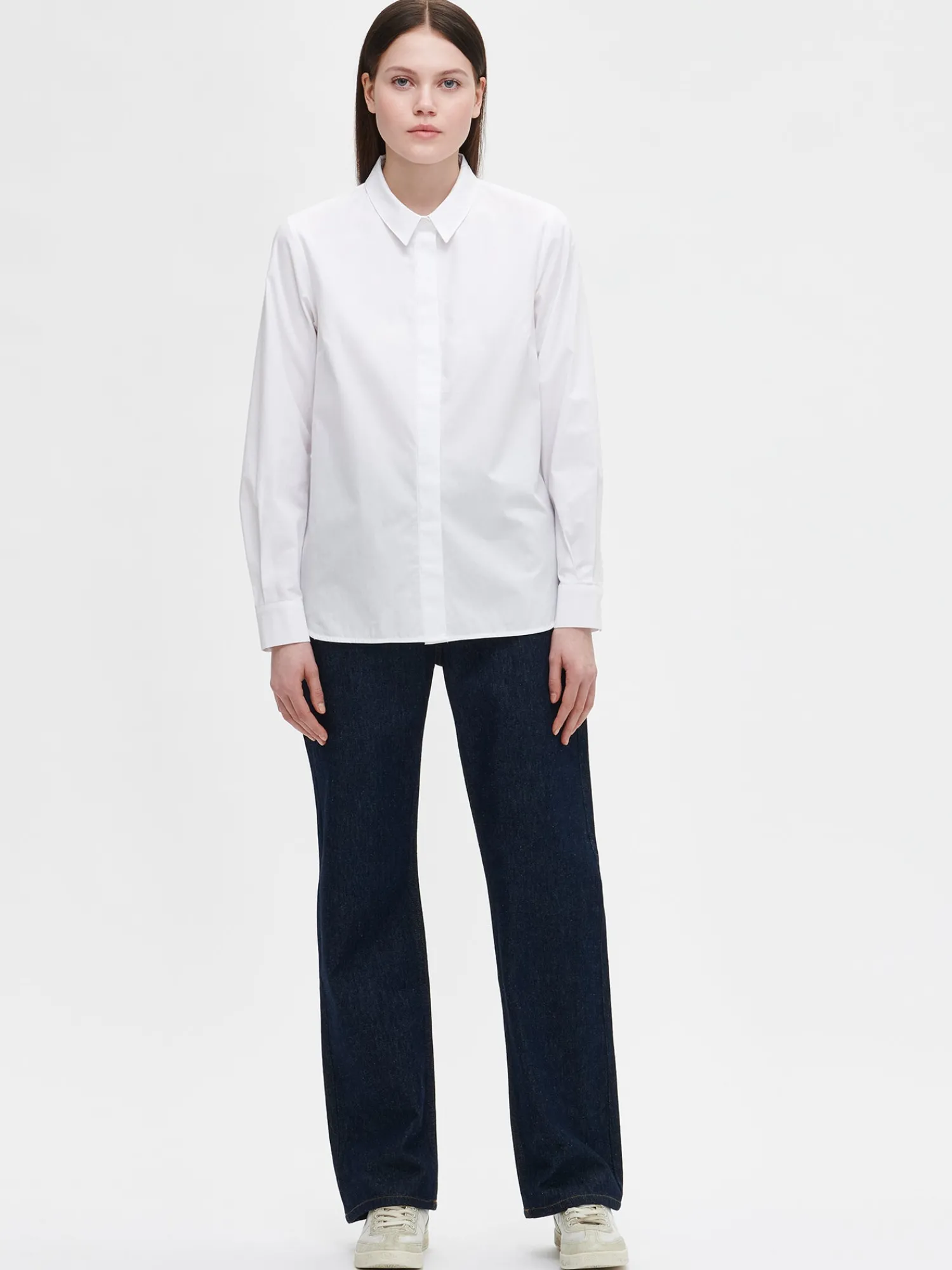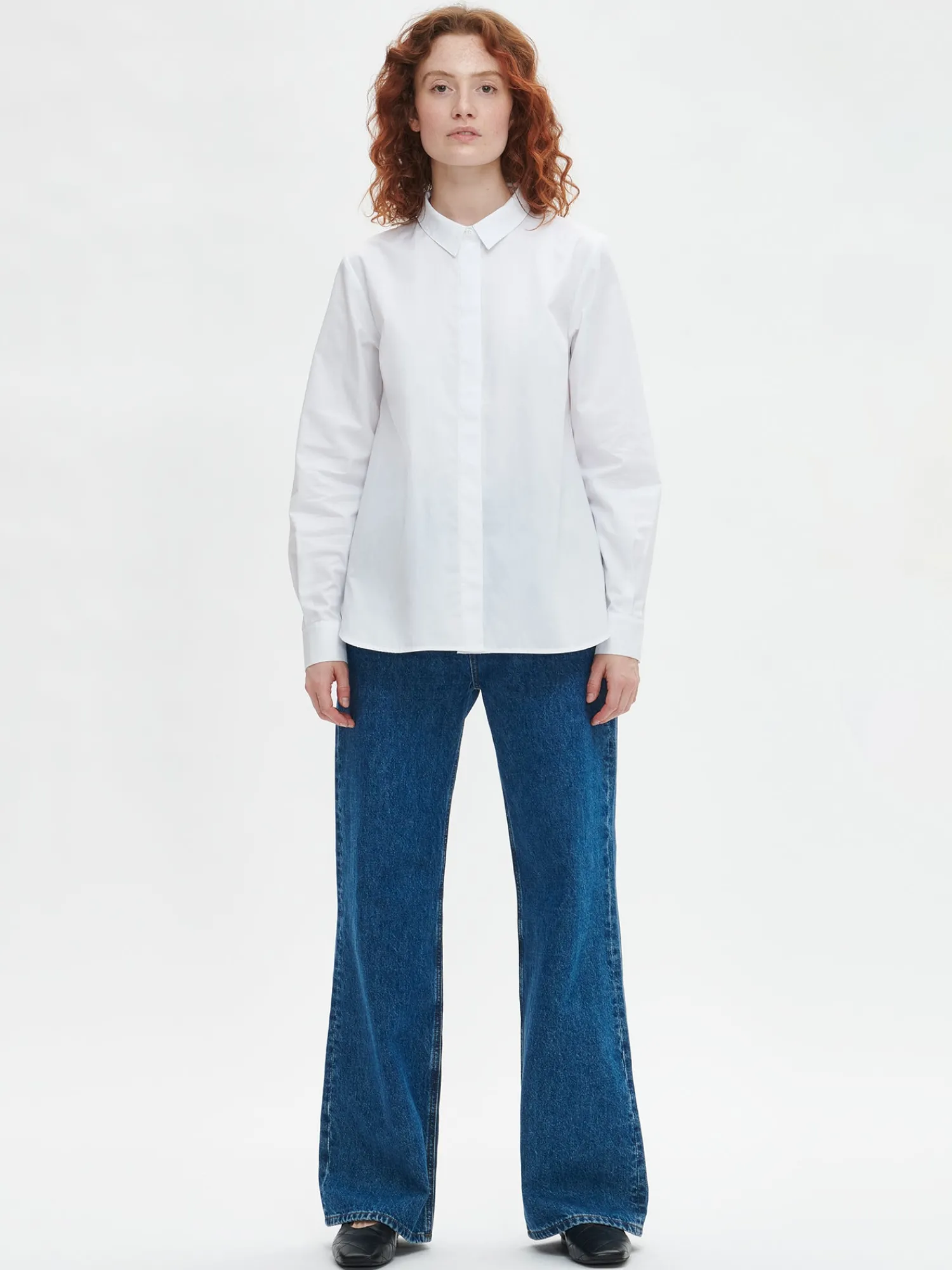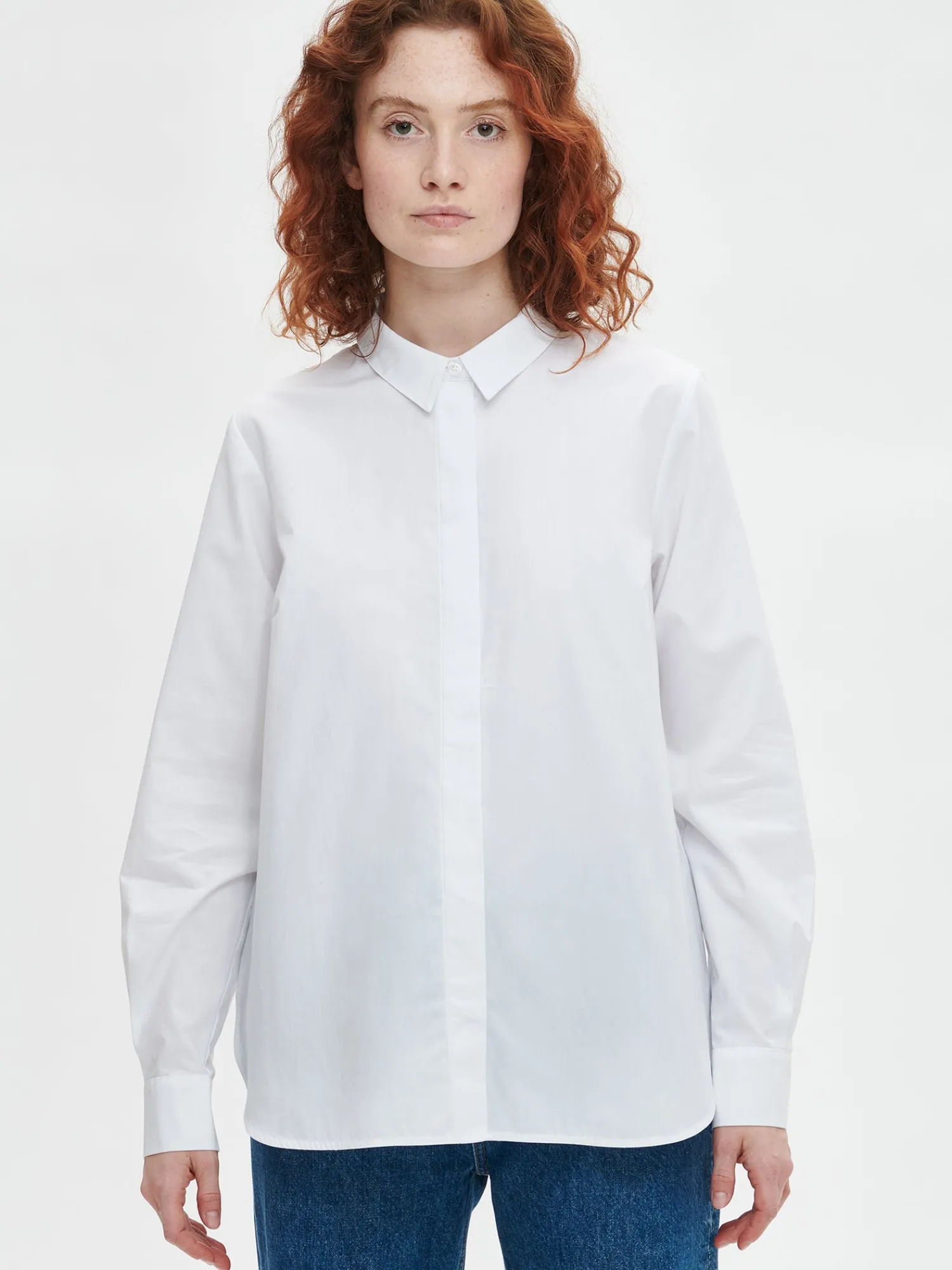 Naisten klassinen valkoinen Lena-paitapusero. Ajaton valkoinen kauluspaita hurmaa monikäyttöisyydellään ja siksi se on varma valinta kerta toisensa jälkeen. Tyylikkäässä paitapuserossa on edessä piilonapitus sekä helmassa sivuissa pyöristetyt halkiot. Puserossa on täyspitkät hihat, joiden hihansuissa on nappikalvosimet. Puseron pituus koossa 38 on noin 70 cm. Tuote on valmistettu laadukkaasta ja ryhdikkäästä kudotusta puuvilla-popliinikankaasta, jonka puuvilla on sertifioitua.