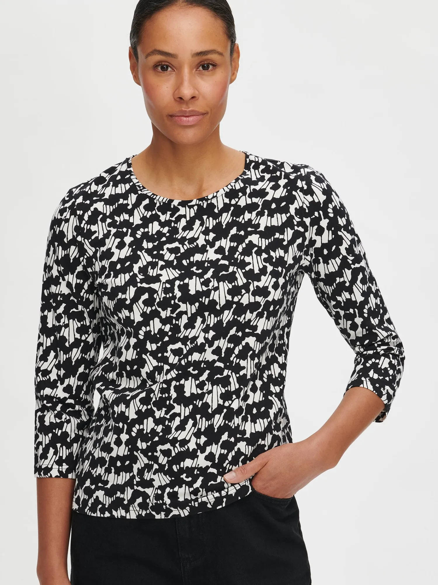 Naisten kuosillinen mustavalkoinen Liito-pusero. Istuvassa puserossa on pyöreä tereellä viimeistelty pääntie ja 3/4 pituiset hihat. Puseron pituus koossa M on noin 65 cm. Materiaali on miellyttävän tuntuista ja helppohoitoista puuvilla-elastaani-neulosta.