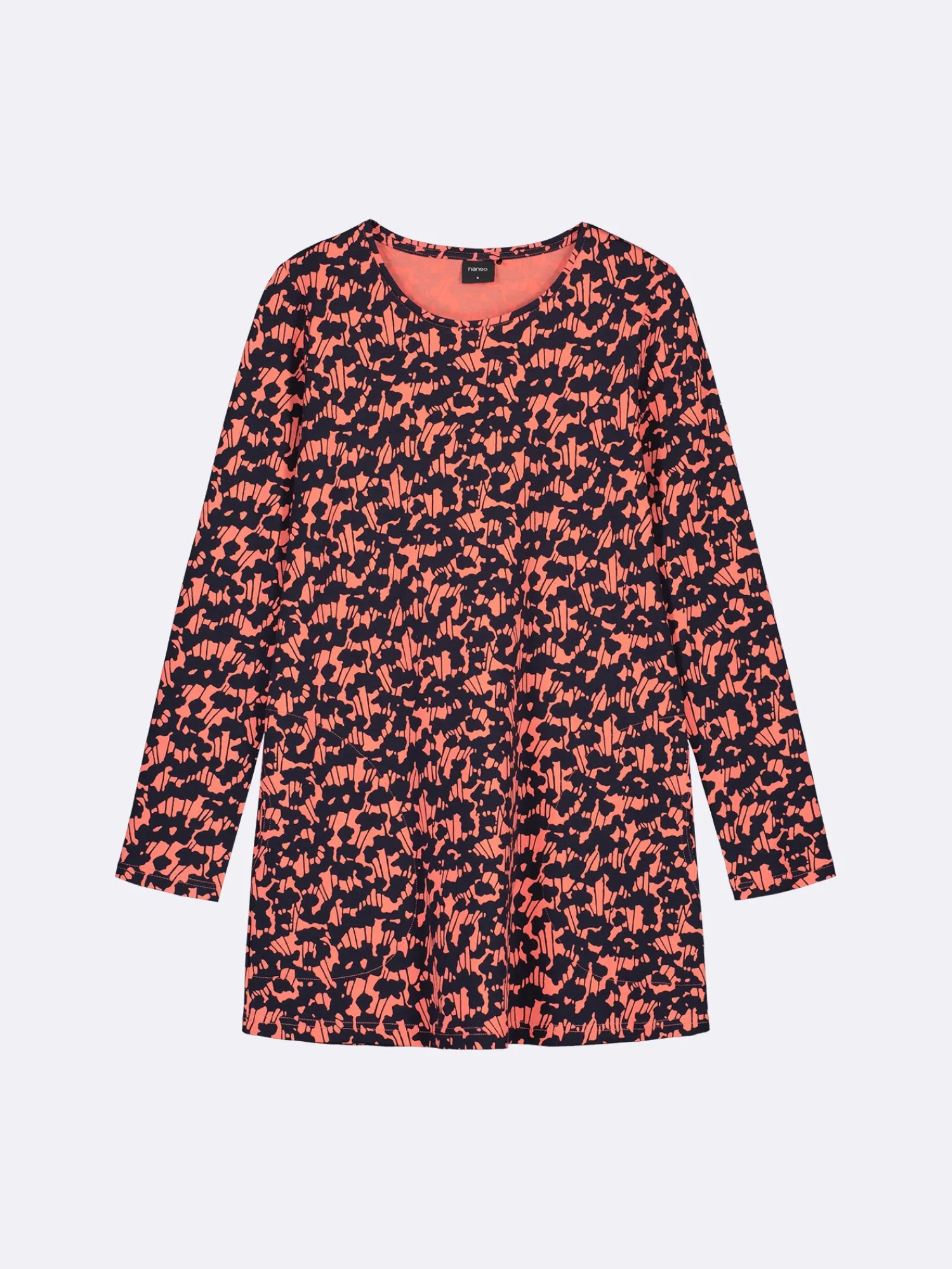 Naisten pitkähihainen punainen Liito-tunika kauniilla kuosilla. Tunikassa on pyöreä tereellä viimeistelty pääntie, sivuissa taskut ja täyspitkät hihat. Tunikan pituus koossa M on noin 80 cm. Materiaali on miellyttävän tuntuista ja helppohoitoista puuvilla-elastaani-neulosta.