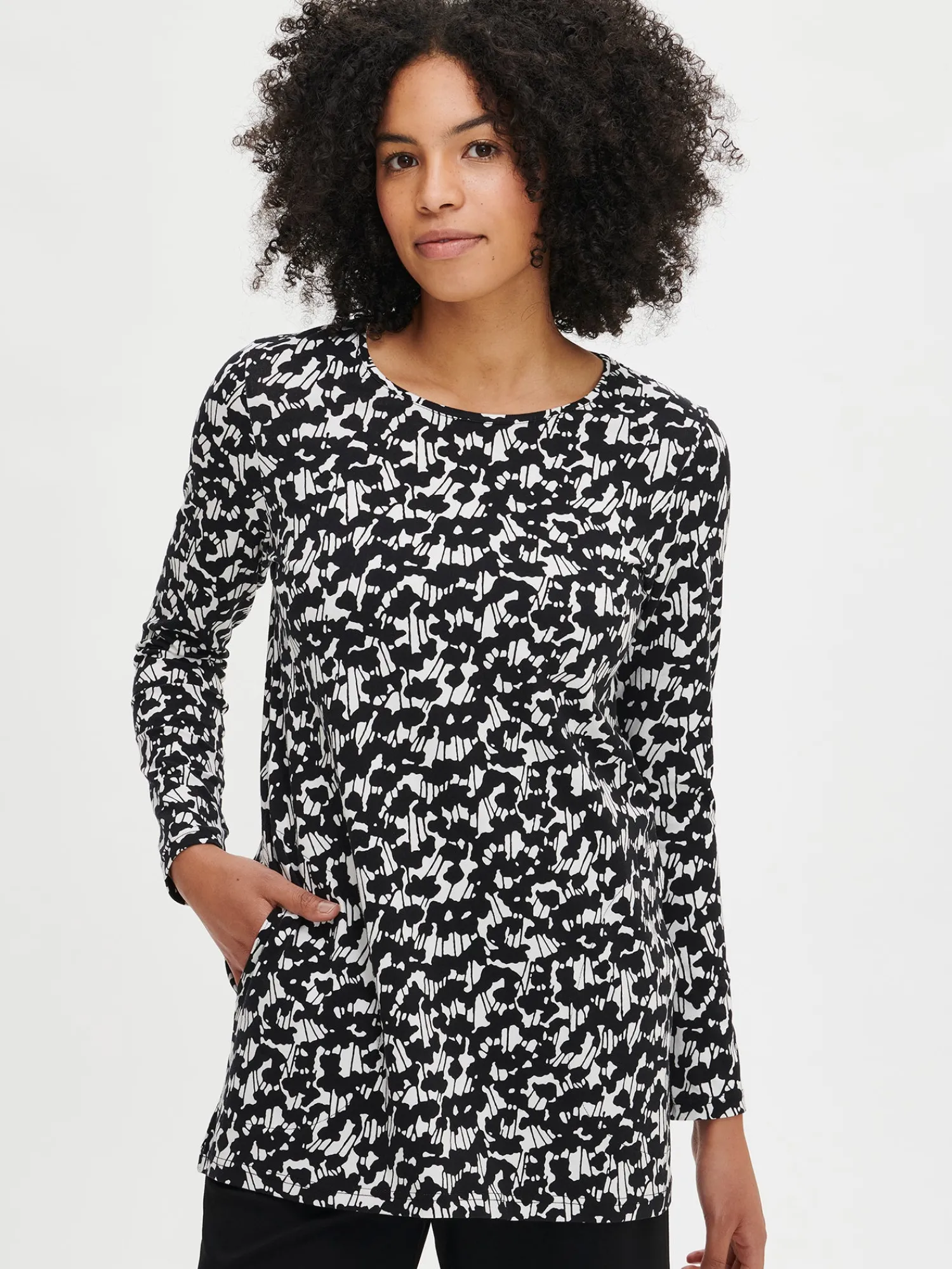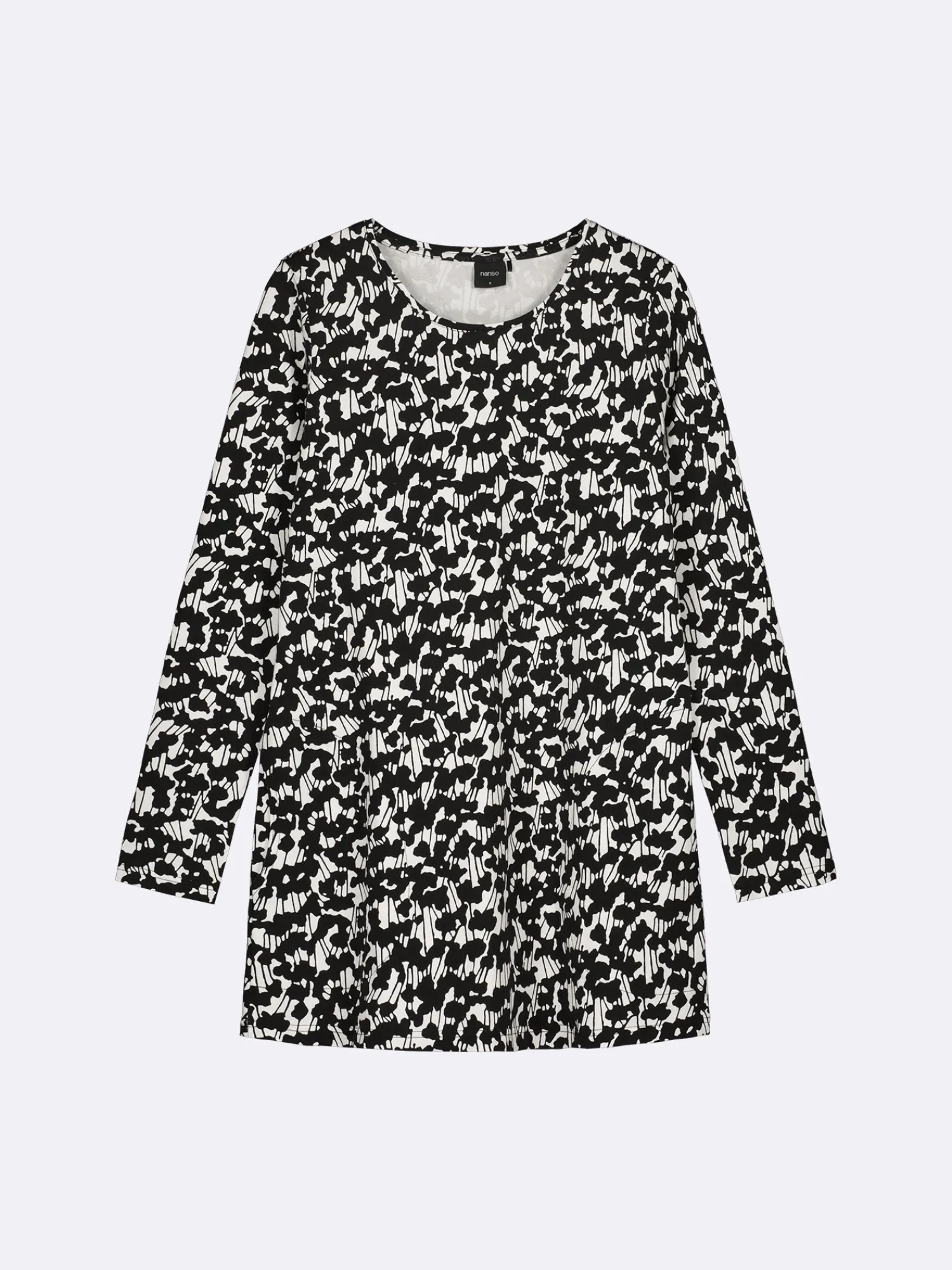 Naisten pitkähihainen mustavalkoinen Liito-tunika kauniilla kuosilla. Tunikassa on pyöreä tereellä viimeistelty pääntie, sivuissa taskut ja täyspitkät hihat. Tunikan pituus koossa M on noin 80 cm. Materiaali on miellyttävän tuntuista ja helppohoitoista puuvilla-elastaani-neulosta.