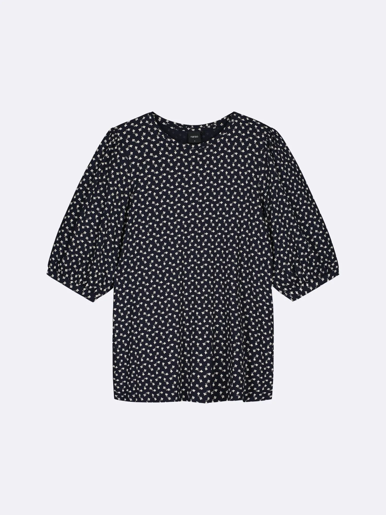Naisten kuosillinen tummansininen Liliana-pusero. Puserossa on tereellä viimeistelty pyöreä pääntie. 2/4 mittaiset hihat poimuttuvat olalta sekä hihansuun kaitaleen yläpuolelta. Puseron pituus koossa M on noin 65 cm. Kauniisti laskeutuvan puseron materiaali on laadukasta ja miellyttävän tuntuista viskoosi-elastaani-neulosta. Viskoosineulos on sähköistymätöntä ja helppohoitoista. Tuote on valmistettu LENZING™ ECOVERO™ -viskoosista. Materiaalille on ominaista 3-5 % kutistuminen ensimmäisessä pesussa.