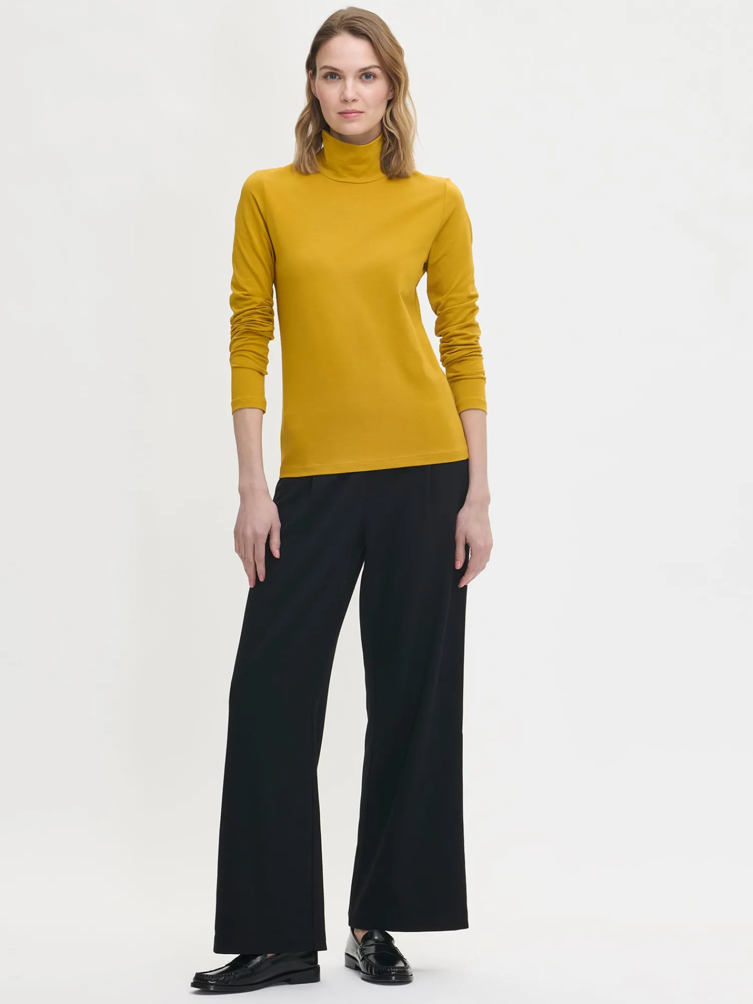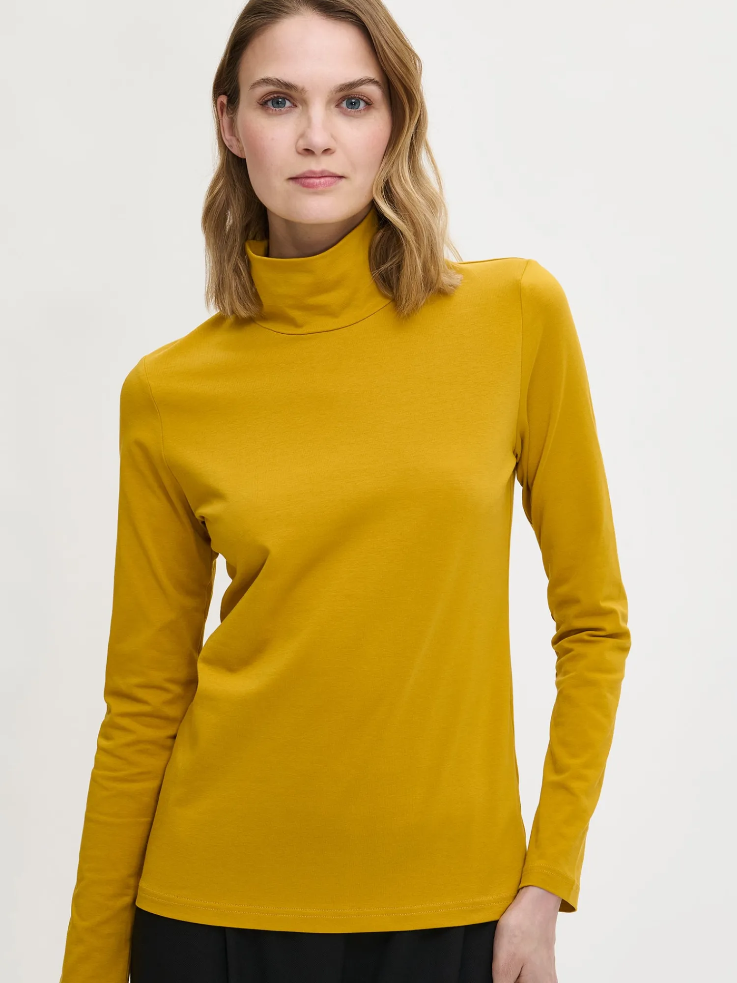 Naisten keltainen Mari-poolopusero. Istuva poolo on ajaton klassikko, johon haluaa pukeutua vuodesta toiseen. Monikäyttöisen poolon voi pukea myös lyhythihaisen mekon tai paidan alle. Istuvassa matalakauluksellisessa poolopuserossa on täyspitkät hihat. Puseron pituus koossa M on noin 65 cm. Poolon materiaali on miellyttävää ja joustavaa luomupuuvilla-elastaani-neulosta.