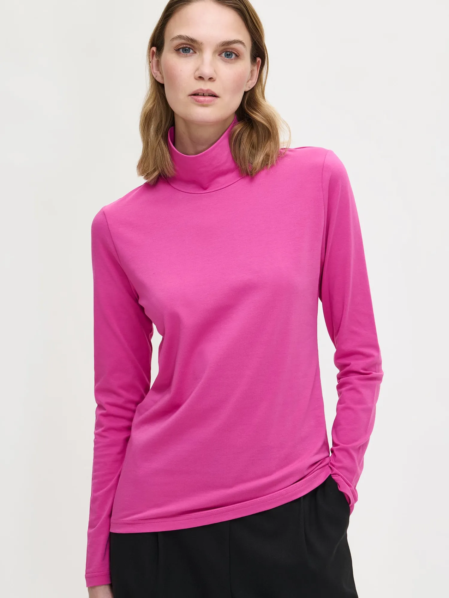 Naisten pinkki Mari-poolopusero. Istuva poolo on ajaton klassikko, johon haluaa pukeutua vuodesta toiseen. Monikäyttöisen poolon voi pukea myös lyhythihaisen mekon tai paidan alle. Istuvassa matalakauluksellisessa poolopuserossa on täyspitkät hihat. Puseron pituus koossa M on noin 65 cm. Poolon materiaali on miellyttävää ja joustavaa luomupuuvilla-elastaani-neulosta.