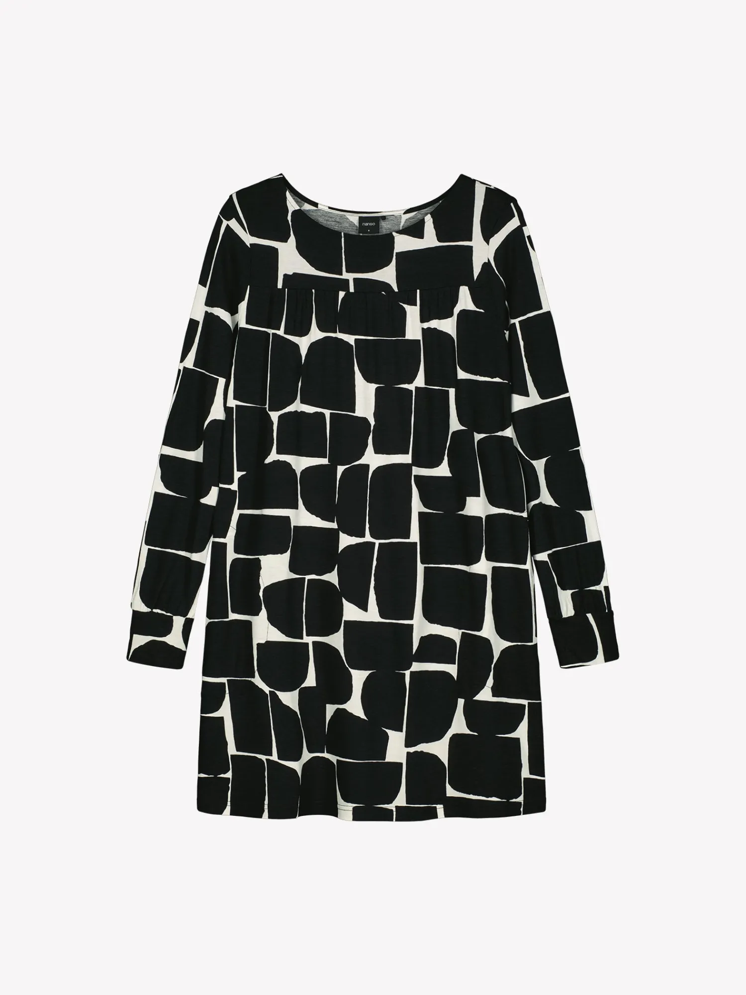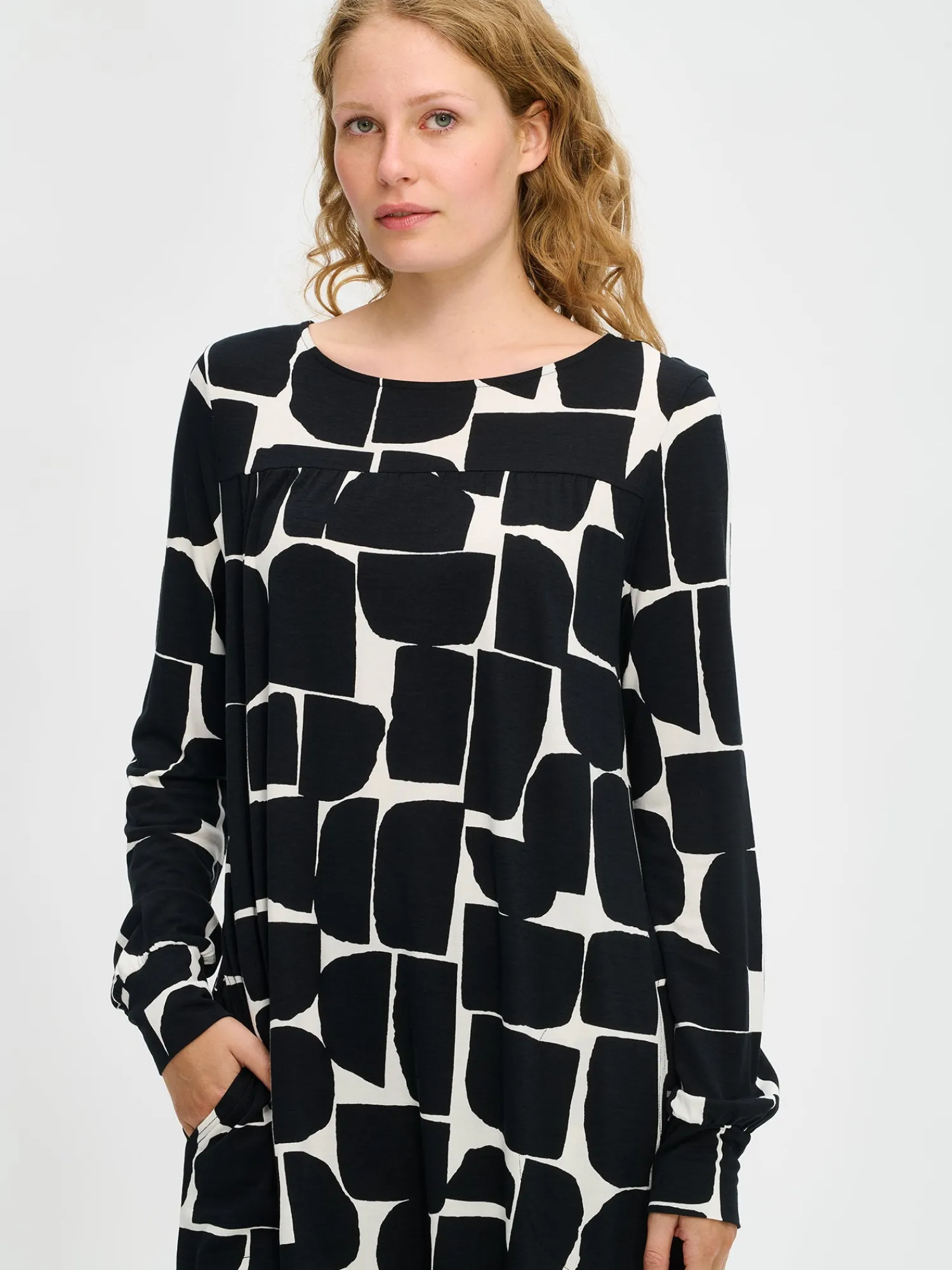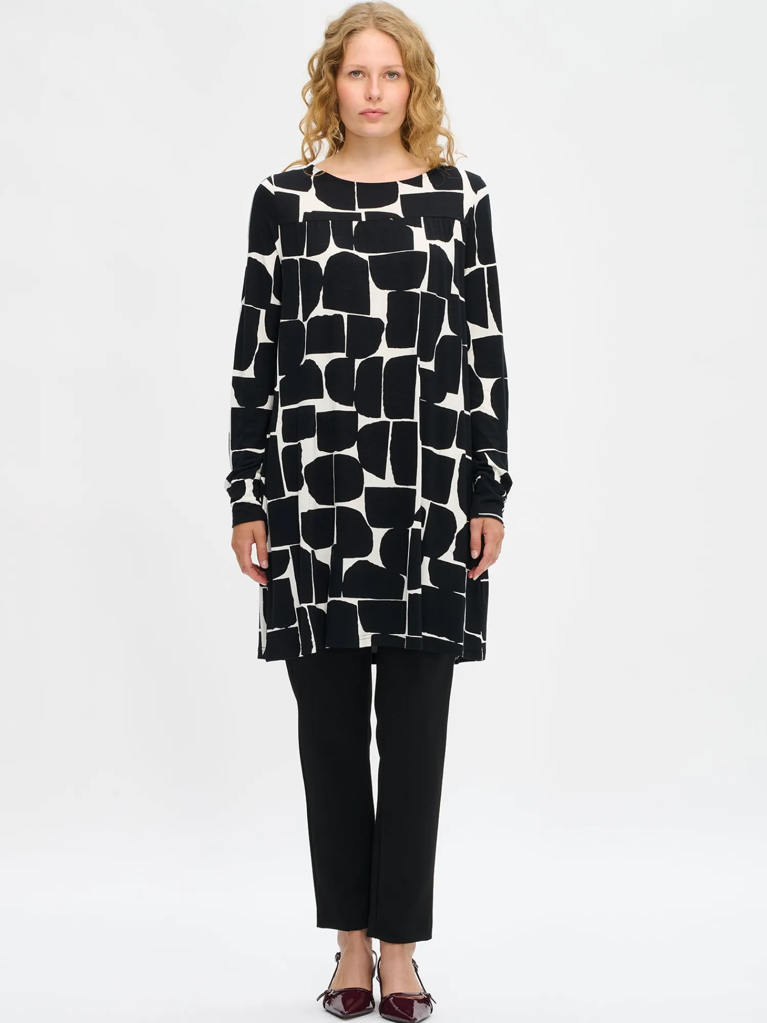 Naisten kuosillinen Muuri-tunika. Väljä helmaisessa tunikassa on kantilla huoliteltu pyöreä pääntie, kaarrokkeen leikkaussaumassa poimutusta ja sivuissa taskut. Tunikan täyspitkät hihat poimuttuvat kauniisti hihansuun kaitaleiden yläpuolelle. Tunikan pituus koossa M on noin 85 cm. Kauniisti laskeutuvan tunikan materiaali on laadukasta ja miellyttävän tuntuista viskoosi-elastaani-neulosta. Viskoosineulos on sähköistymätöntä ja helppohoitoista. Tuote on valmistettu LENZING™ ECOVERO™ -viskoosista. Materiaalille on ominaista 3-5% kutistuminen ensimmäisessä pesussa.