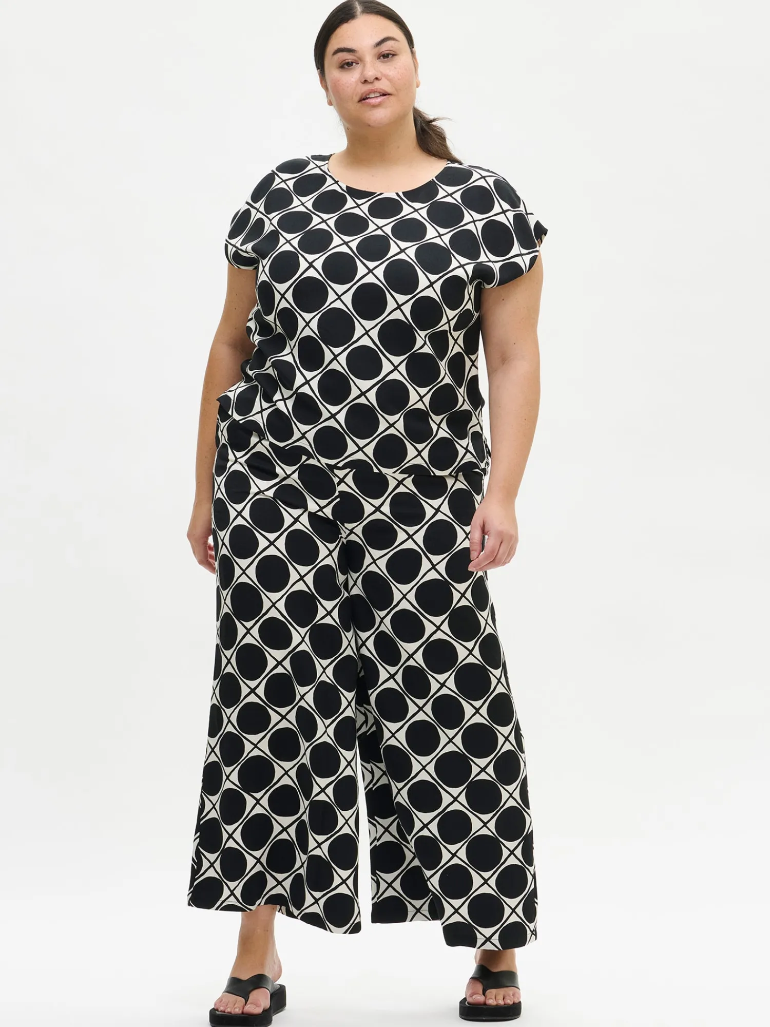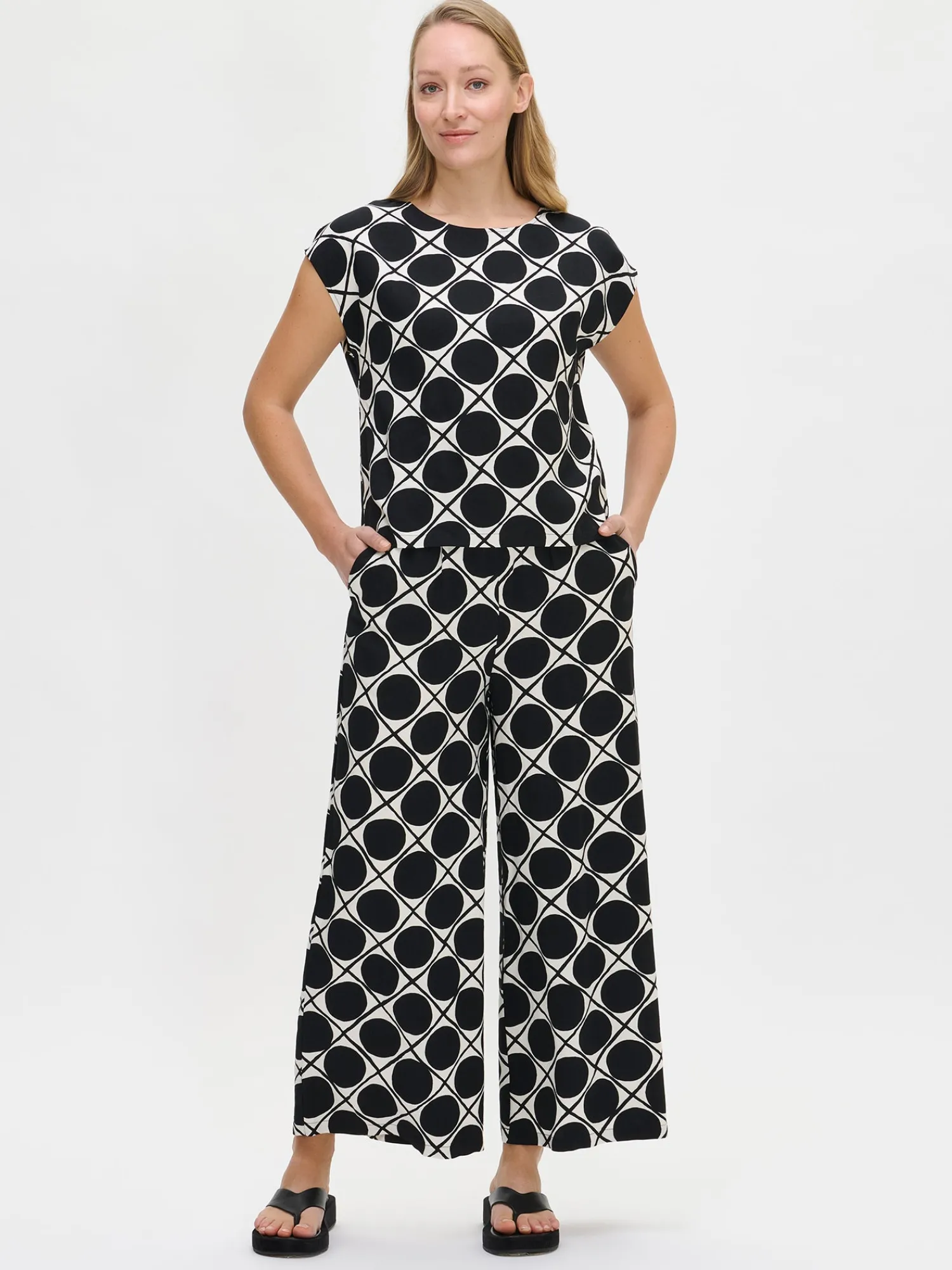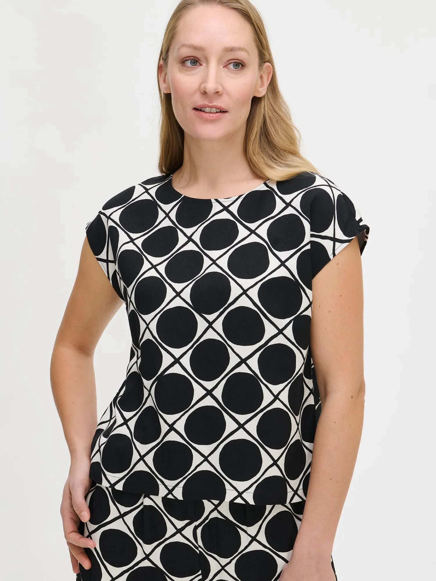 Naisten rento kuosillinen musta Napoli-pusero. Yhdistä tyylikäs Napoli-toppi yhteensopiviin . Laatikkomaisessa puserossa on kantilla viimeistelty pyöreä pääntie, suora helma ja halkiot sivuissa. Puseron pituus koossa 38 on noin 58 cm. Materiaali on laadukasta ja miellyttävän tuntuista kudottua viskoosi-pellava-kangasta. Kankaan pinta on twill sidoksinen ja pinnassa on hienostunut, himmeä kiilto. Materiaalille on ominaista 3-5 % kutistuminen ensimmäisessä pesussa.