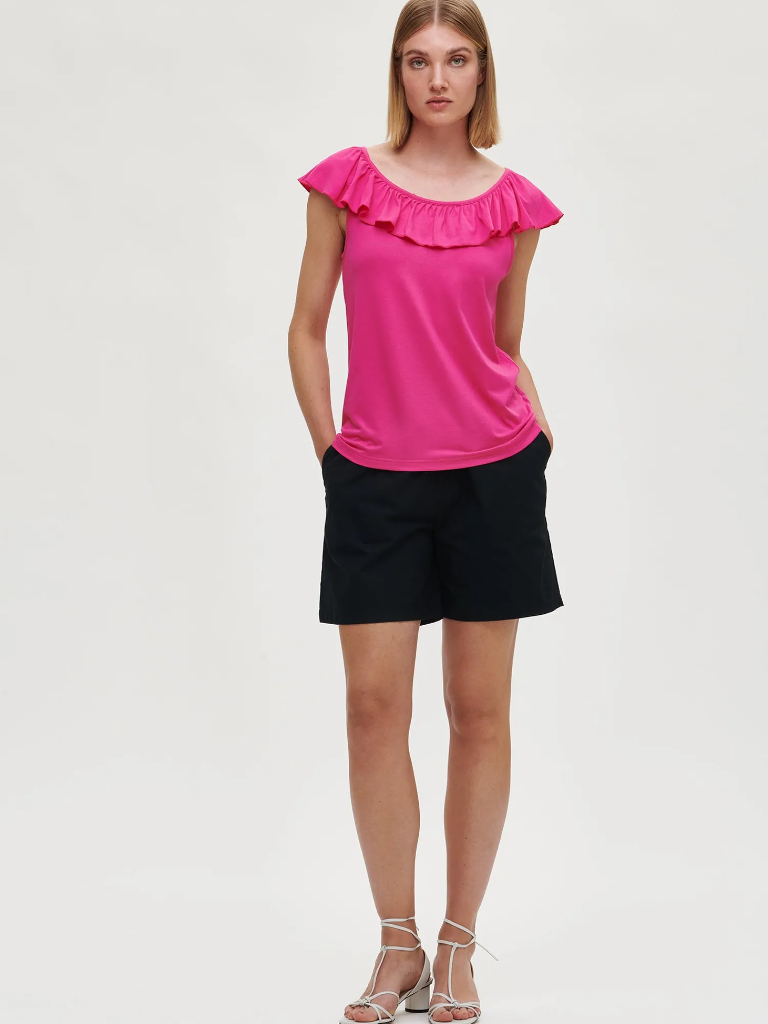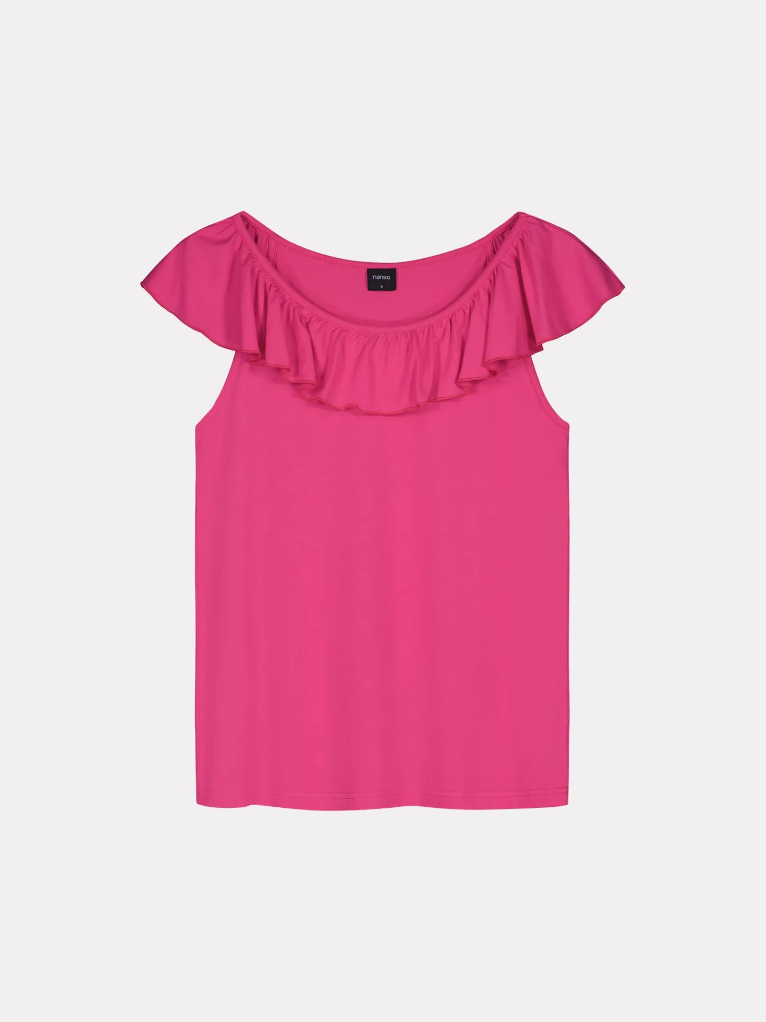 Naisten tyylikäs pinkki Nata-toppi. Hihattoman topin kädentiet on huoliteltu kapealla kantilla. Avaraa pääntietä reunustaa kauniisti laskeutuva frilla. Topin pituus koossa M on noin 62 cm. Materiaali on laadukasta ja miellyttävän tuntuista, ohutta viskoosi-elastaani-neulosta. Viskoosineulos on sähköistymätöntä ja helppohoitoista. Tuote on valmistettu vastuullisemmasta LENZING™ ECOVERO™ -viskoosista. Materiaalille on ominaista 3-5% kutistuminen ensimmäisessä pesussa.