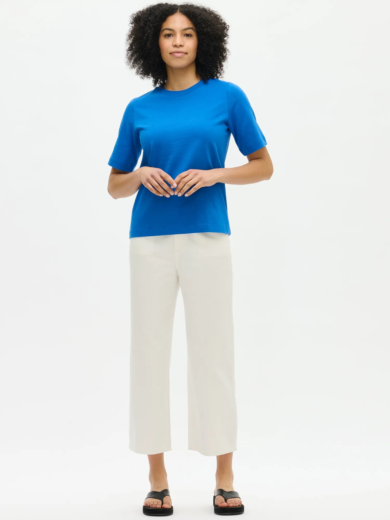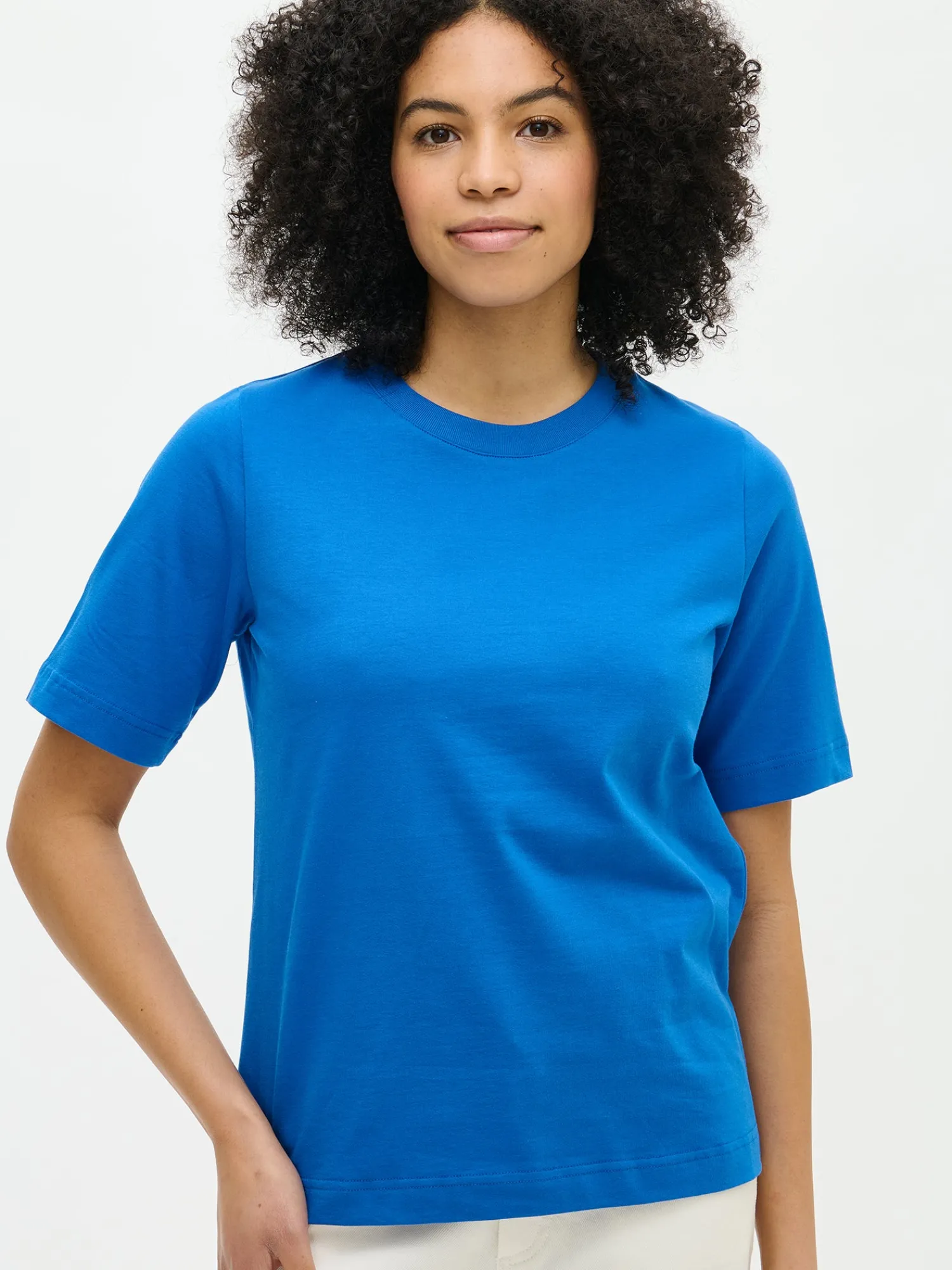 Naisten laadukas sininen Normi-t-paita. Suoralinjaisessa t-paidassa on pyöreä ribbi pääntie ja 2/4 pituiset hihat. T-paidan pituus koossa M on noin 65 cm. Materiaali on 100% laadukasta luomupuuvillaa, joka pysyy hyvänä käytössä.