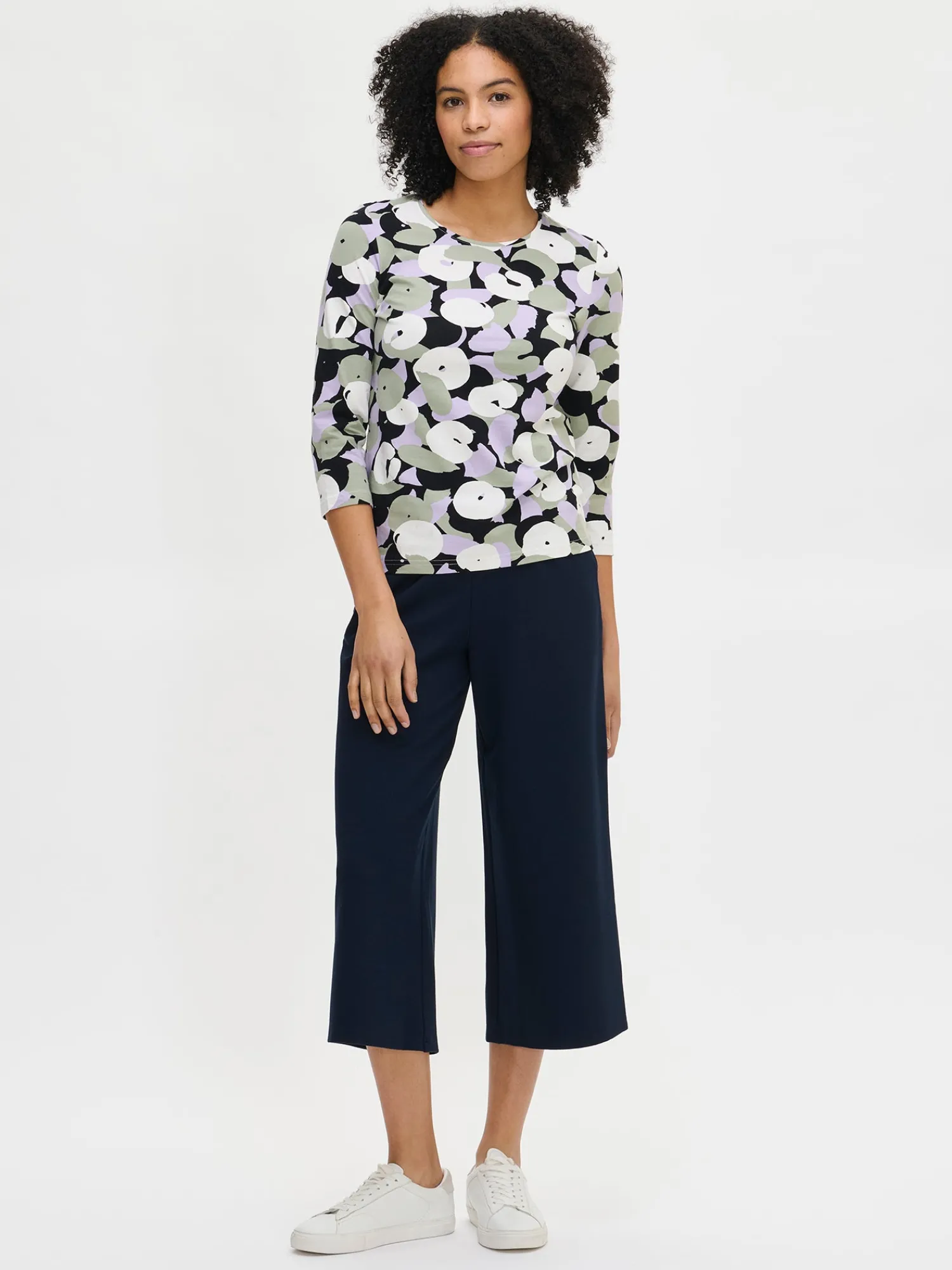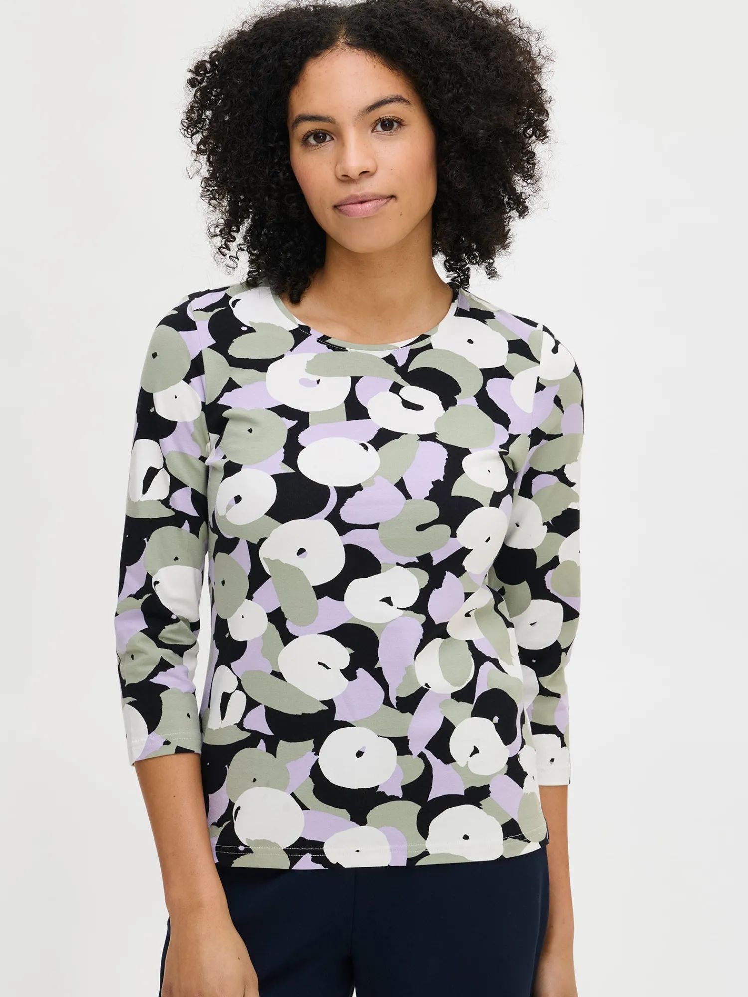 Naisten kuosillinen oliivinvihreä Perenna-pusero. Istuvassa puserossa on tereellä viimeistelty pyöreä pääntie ja 3/4 pituiset hihat. Puseron pituus koossa M on noin 65 cm. Materiaali on miellyttävän tuntuista ja helppohoitoista puuvilla-elastaani-neulosta.