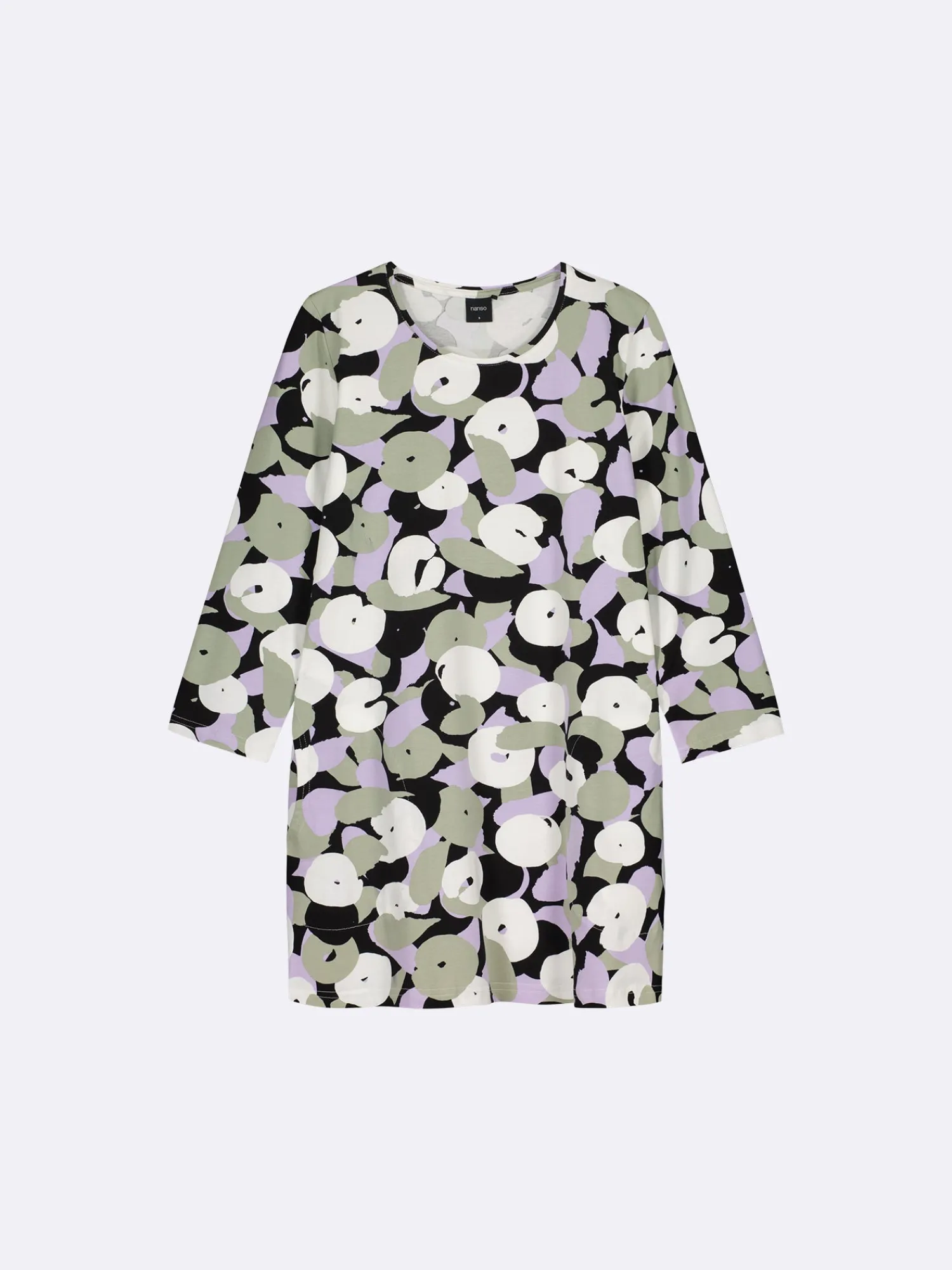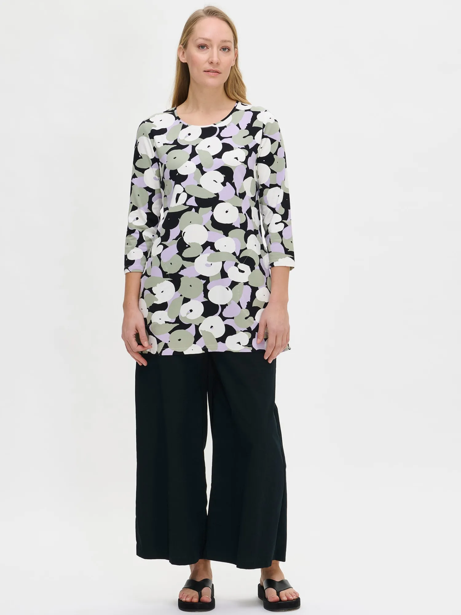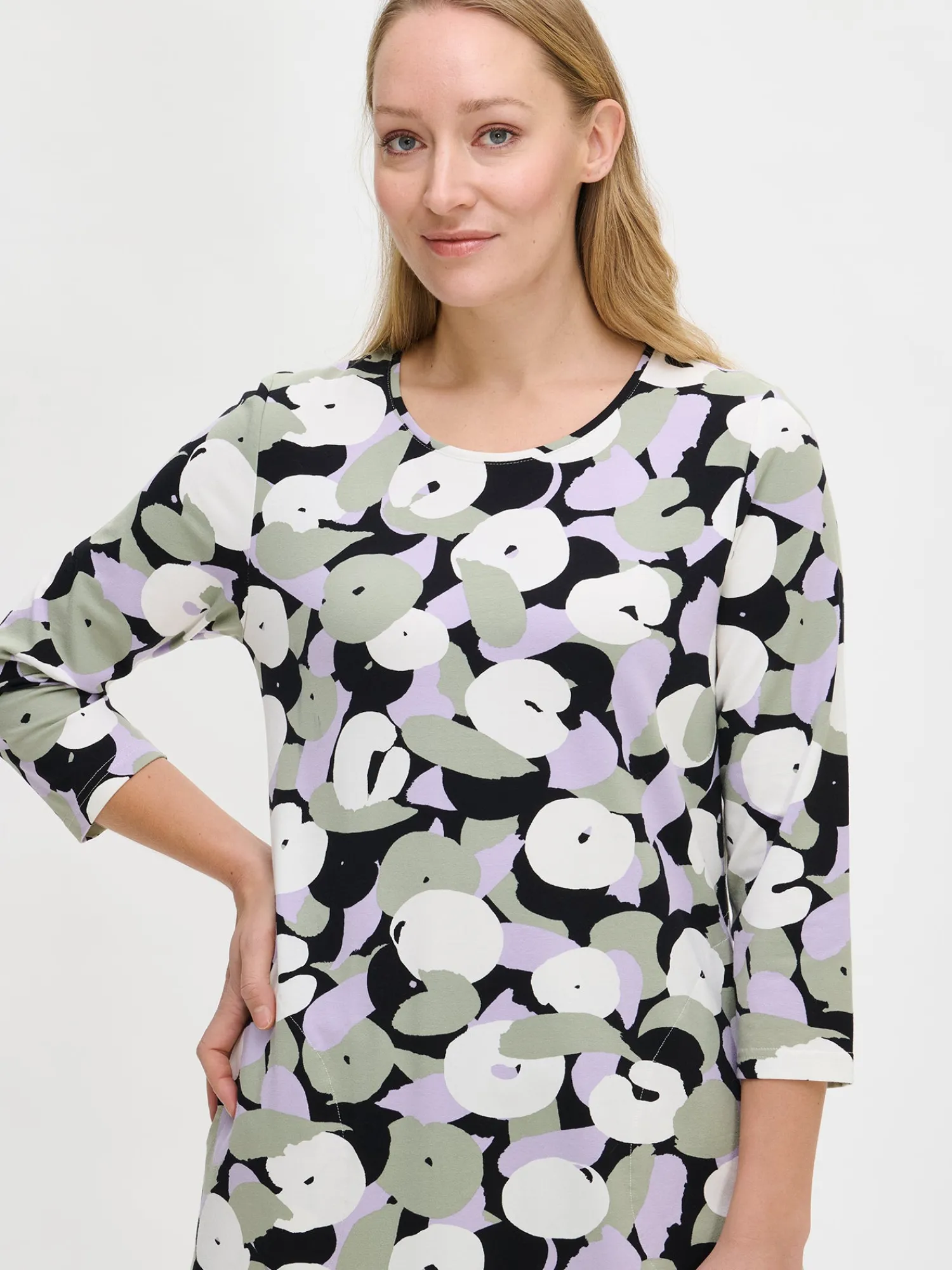 Naisten kuosillinen oliivinvihreä Perenna-tunika. Tunikassa on tereellä viimeistelty pyöreä pääntie, sivuissa taskut ja 3/4 pituiset hihat. Tunikan pituus koossa M on noin 80 cm. Materiaali on miellyttävän tuntuista ja helppohoitoista puuvilla-elastaani-neulosta.