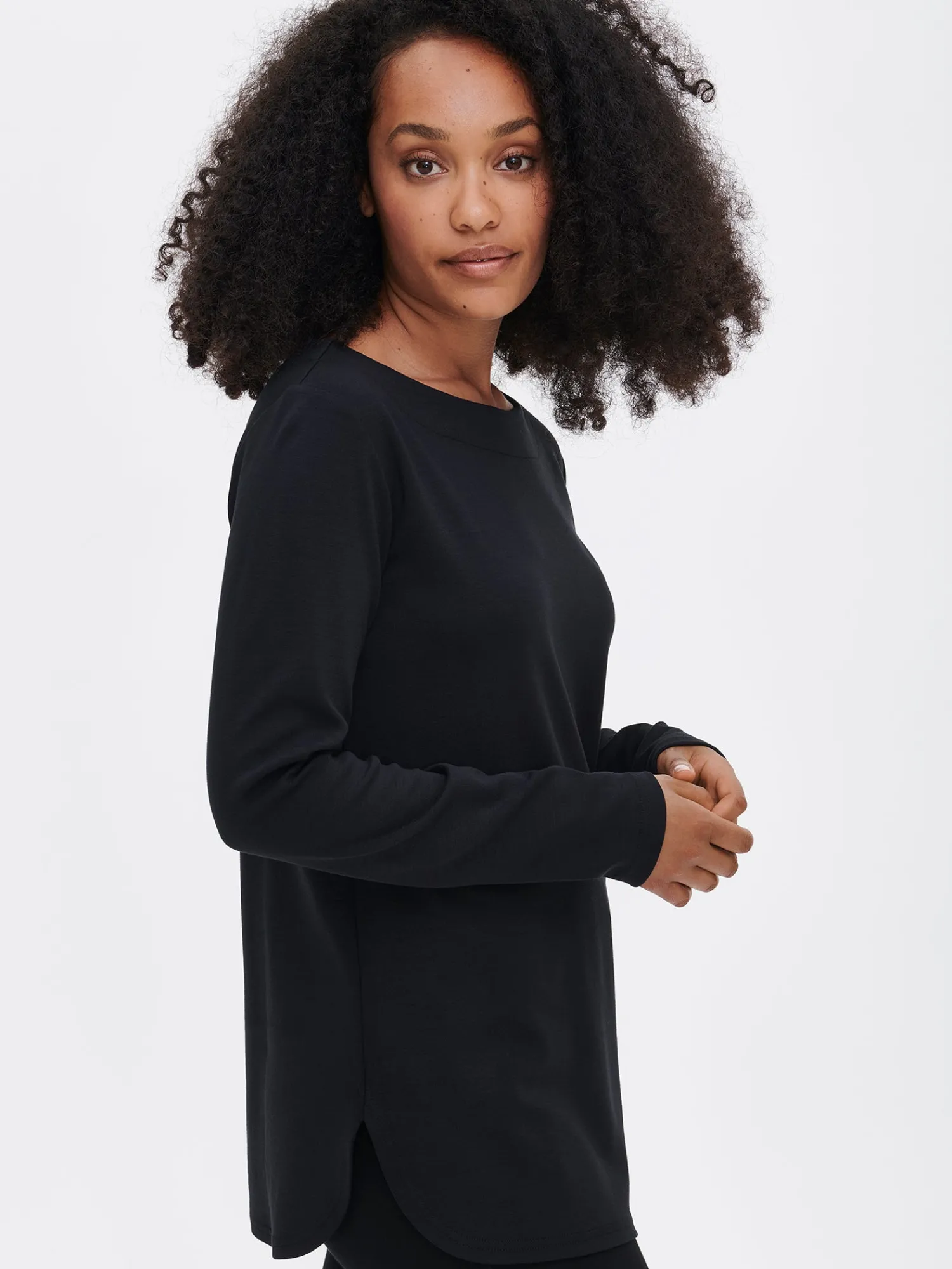 Naisten pitkähihainen musta Piirre-pusero. Klassinen pusero sopii täydellisesti jokapäiväiseen pukeutumiseen. Puserossa on alavaralla viimeistelty kaunis venepääntie. Paidan hihat ovat täyspitkät ja helmassa on sivuissa pyöristetyt halkiot. Puseron pituus koossa M on noin 73 cm. Materiaali on pehmeää, paskumpaa viskoosi-polyamidi-elastaani -neulosta.