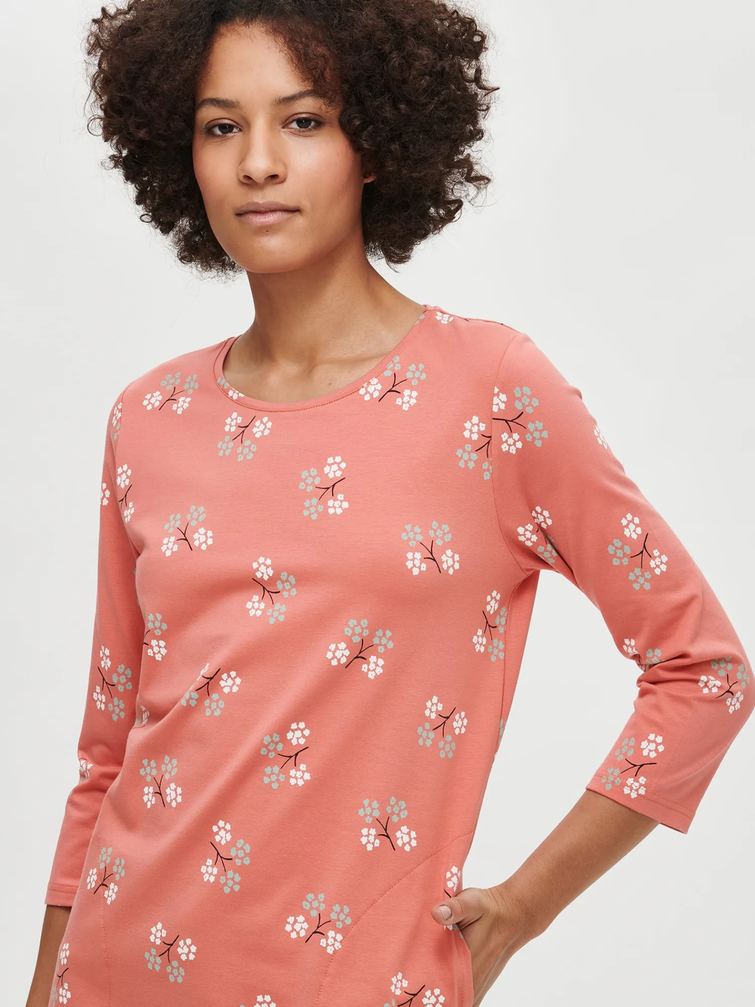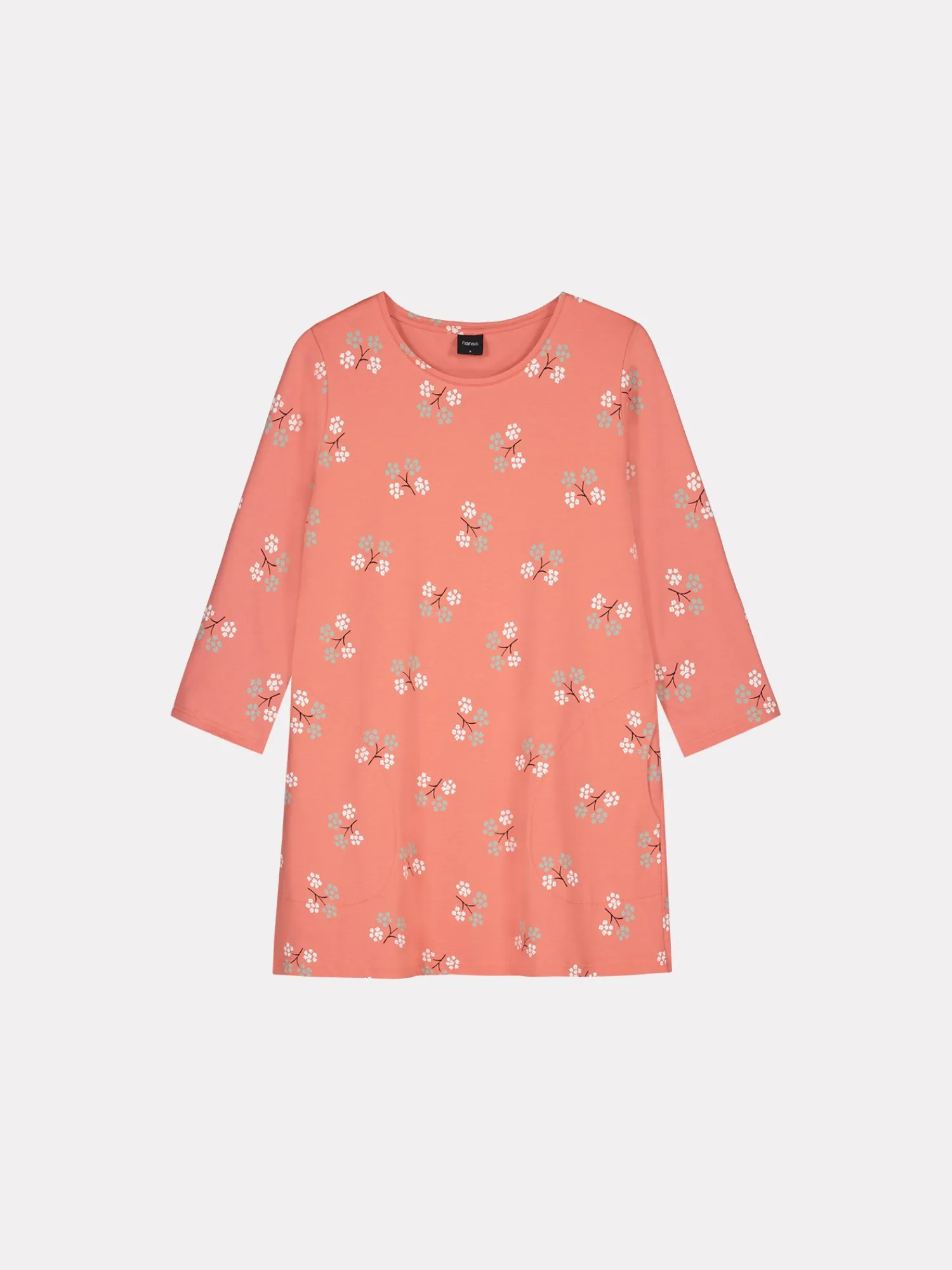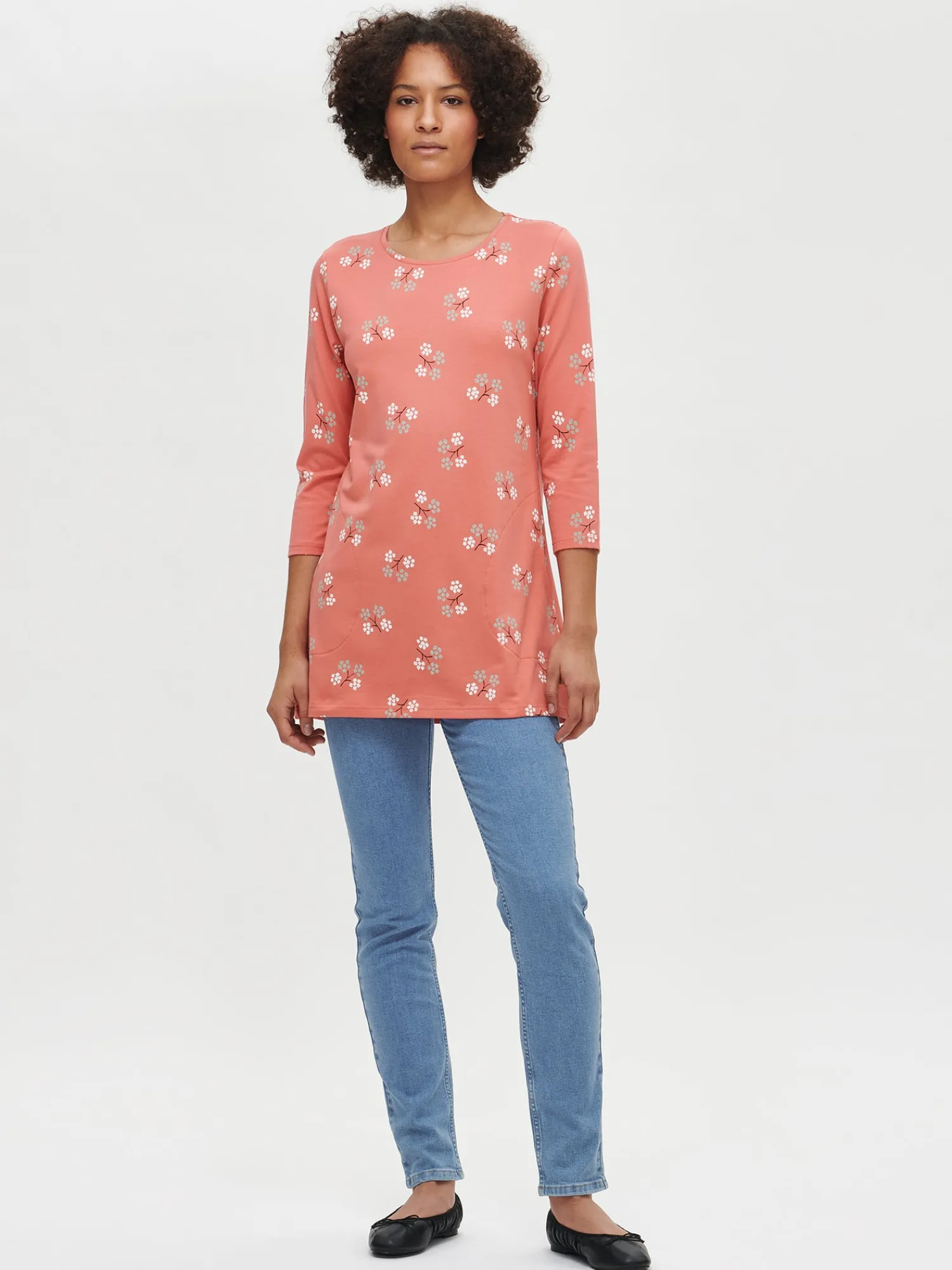 Naisten kuosillinen koralli Pikku Cassia-tunika. Kauniissa tunikassa on tereellä viimeistelty pyöreä pääntie, sivuissa taskut ja 3/4 pituiset hihat. Tunikan pituus koossa M on noin 80 cm. Materiaali on miellyttävän tuntuista ja helppohoitoista puuvilla-elastaani-neulosta.