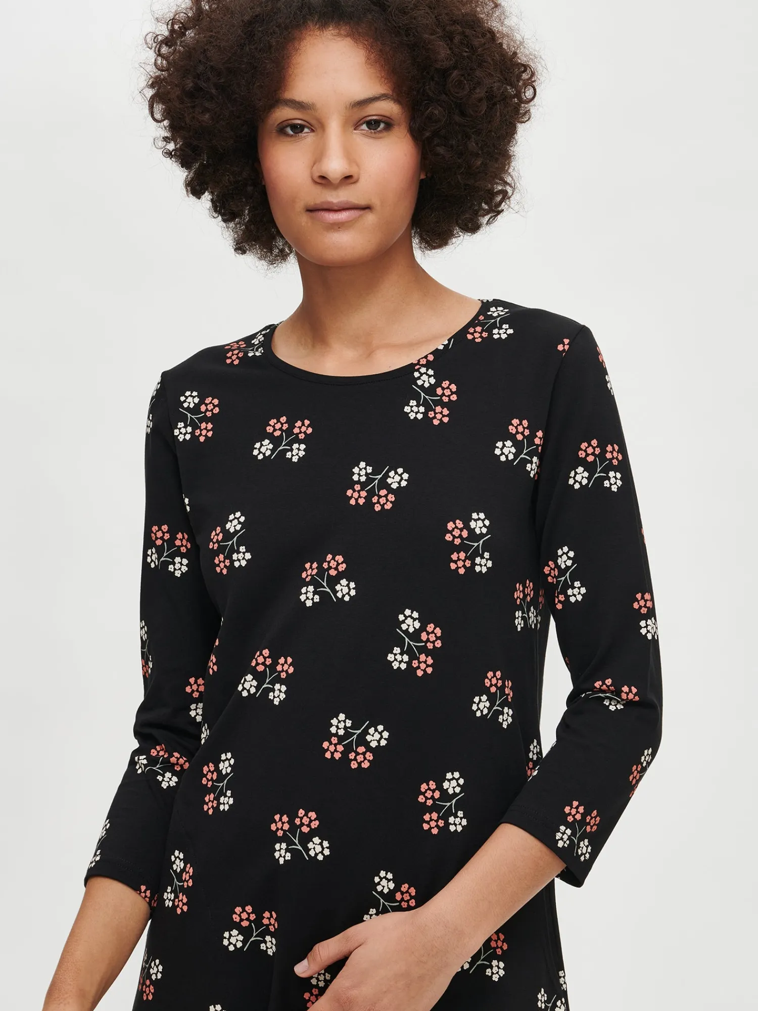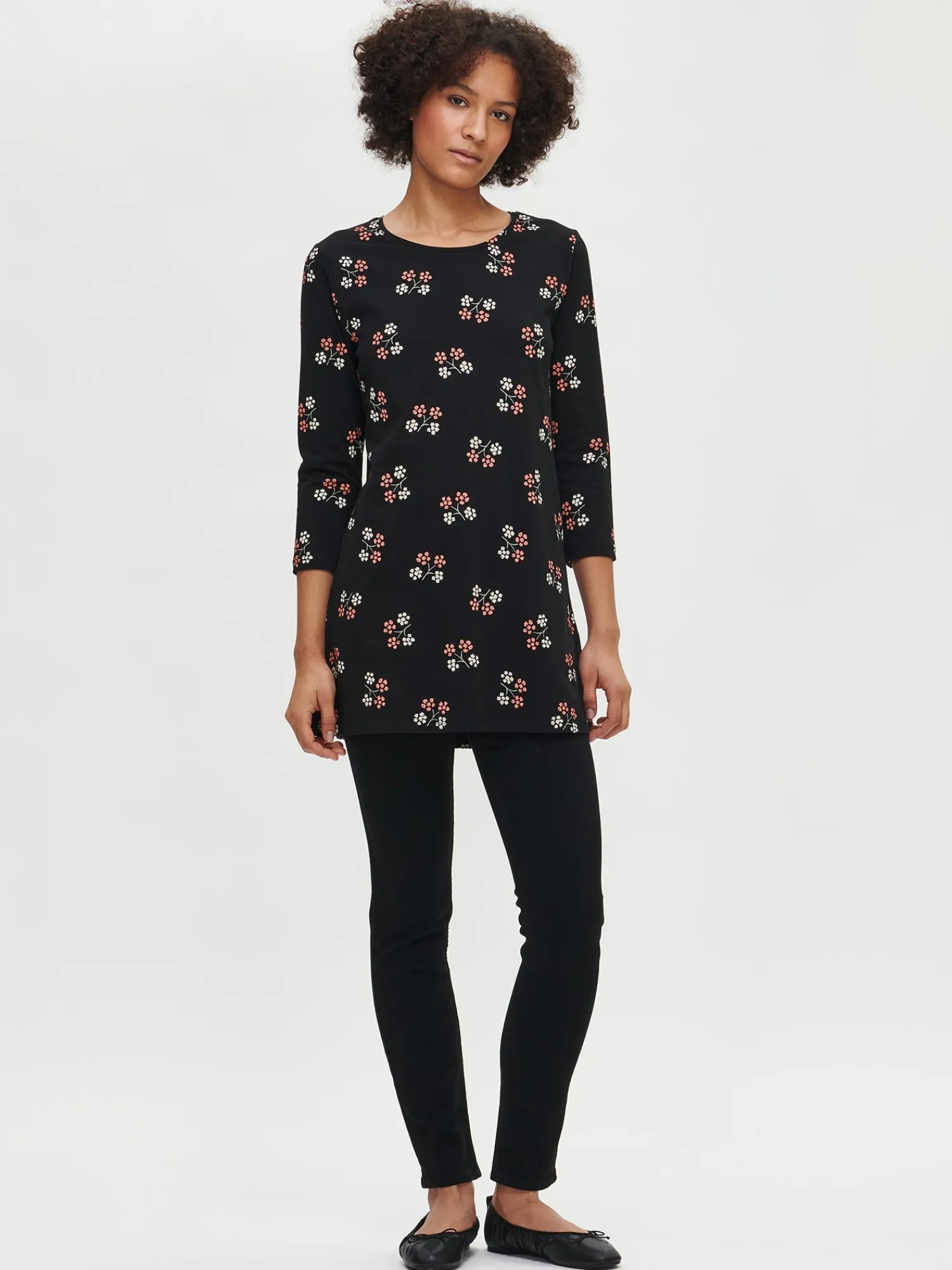 Naisten kuosillinen musta Pikku Cassia-tunika. Kauniissa tunikassa on tereellä viimeistelty pyöreä pääntie, sivuissa taskut ja 3/4 pituiset hihat. Tunikan pituus koossa M on noin 80 cm. Materiaali on miellyttävän tuntuista ja helppohoitoista puuvilla-elastaani-neulosta.