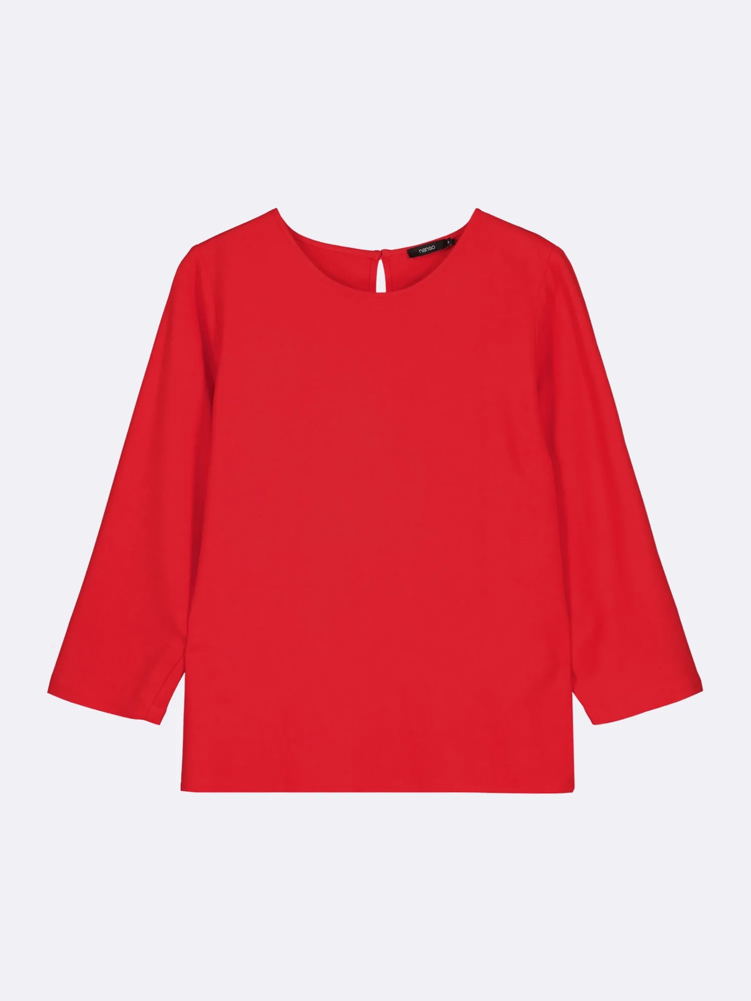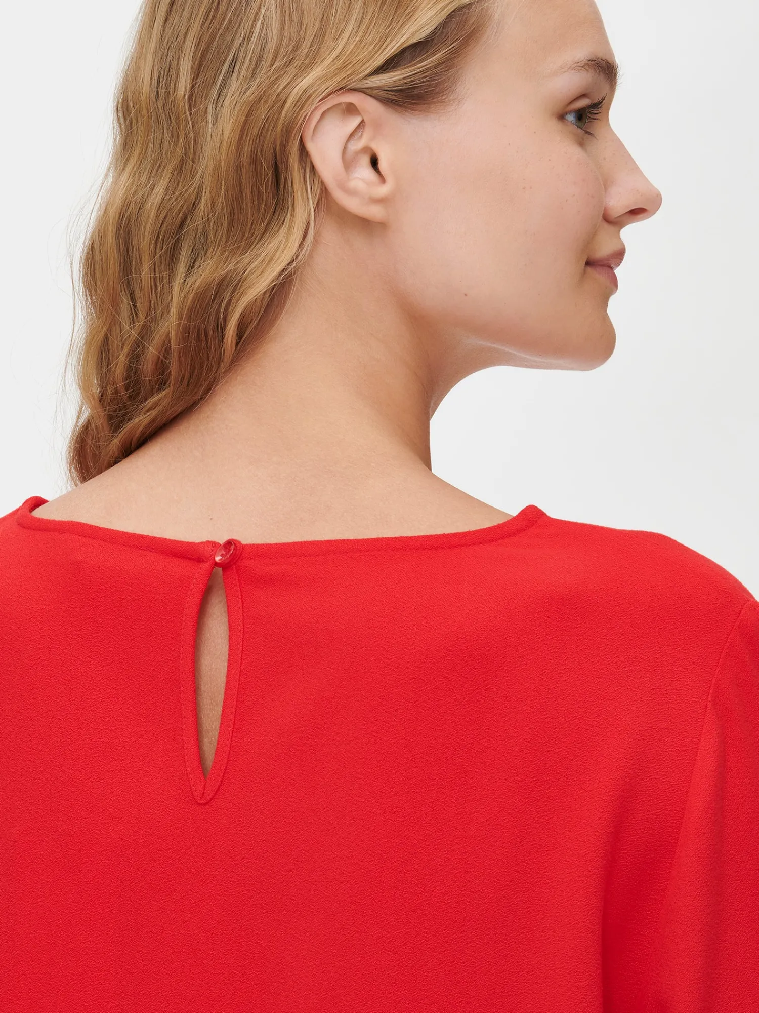 Naisten tyylikäs punainen Piritta-pusero. Kirkkaan punainen pusero piristää arkipukeutumista ja sopii erinomaisesti myös juhlaan. Puserossa on kantilla viimeistelty pyöreä pääntie, jossa takana nappihalkio. Edessä on rintamuotolaskokset ja sivuissa halkiot. Suorat hihat ovat 3/4 mittaiset. Puseron pituus koossa 38 on noin 65 cm. Materiaali on kauniisti laskeutuvaa 100 % viskoosikreppikangasta. Materiaalille on ominaista 3-5% kutistuminen ensimmäisessä pesussa.