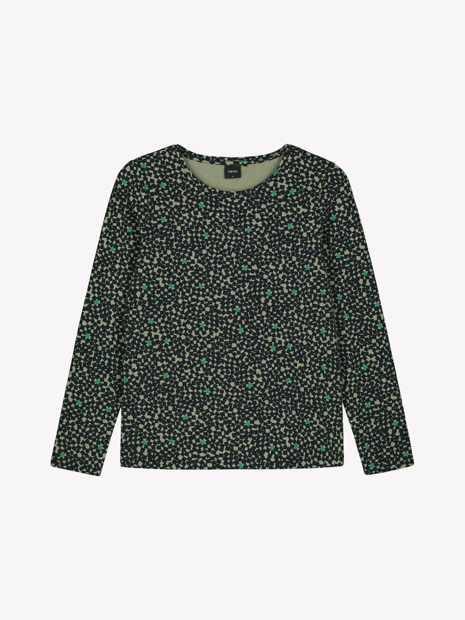 Naisten kuosillinen vihreä Polku-pusero. Puseron pyöreä pääntie on viimeistelty tereellä ja hihat ovat täyspitkät. Puseron pituus koossa M on noin 65 cm. Materiaali on miellyttävän tuntuista ja helppohoitoista puuvilla-elastaani-neulosta.