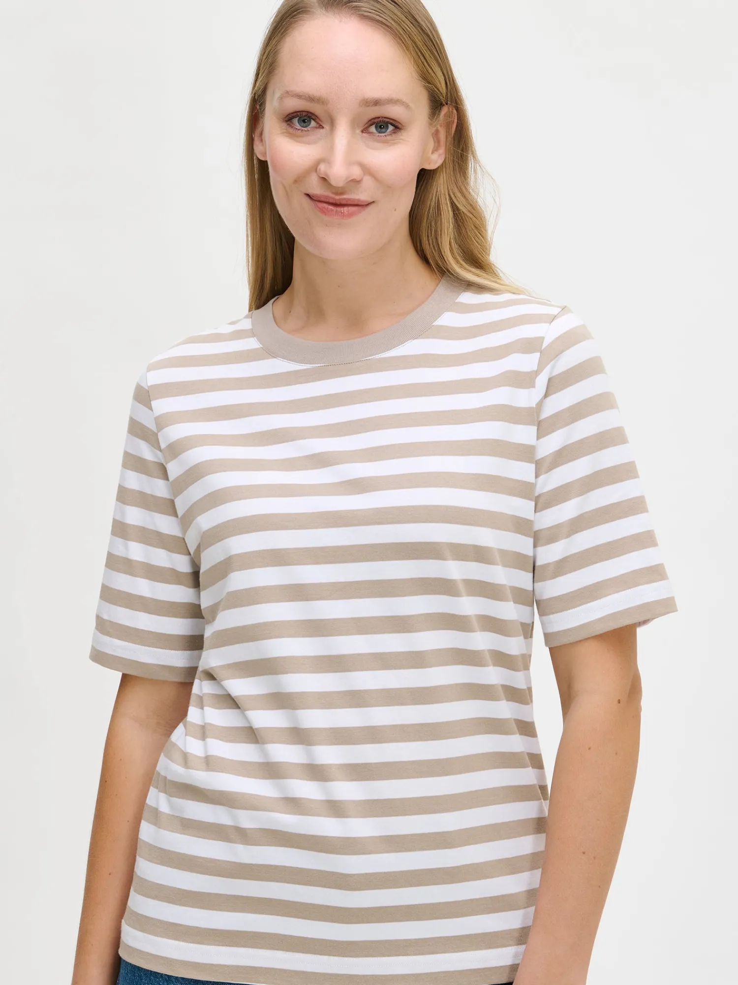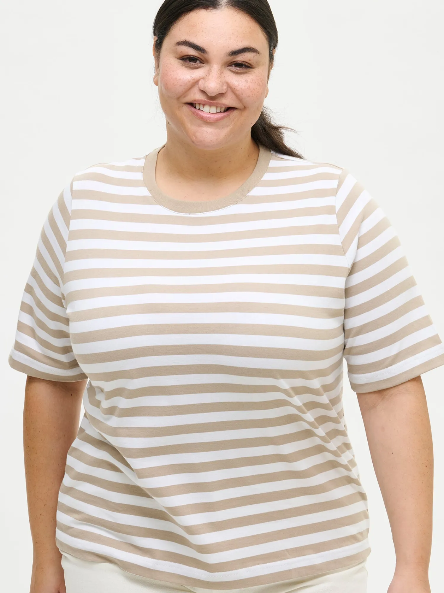 Naisten raidallinen beige-valkoinen Normi-t-paita. Mukava t-paita on arjen klassikko, johon on ihana pukeutua päivästä toiseen. Suoralinjaisessa t-paidassa on pyöreä ribbi pääntie ja 2/4 pituiset hihat. T-paidan pituus koossa M on noin 65 cm. Materiaali on 100 % laadukasta puuvillaa, joka pysyy hyvänä käytössä.