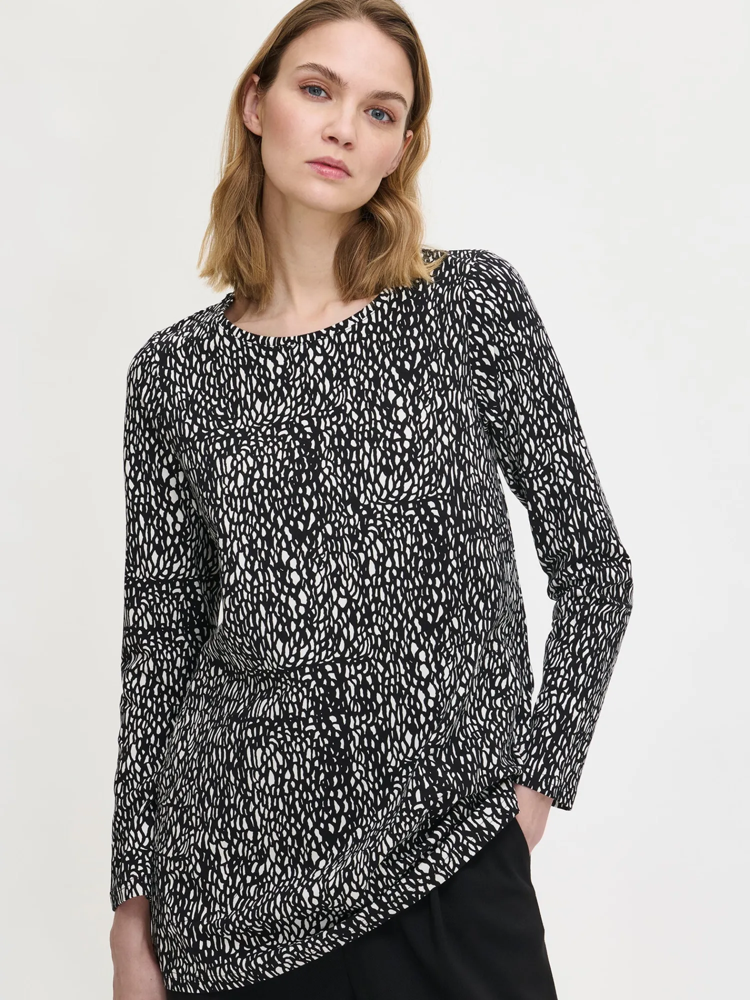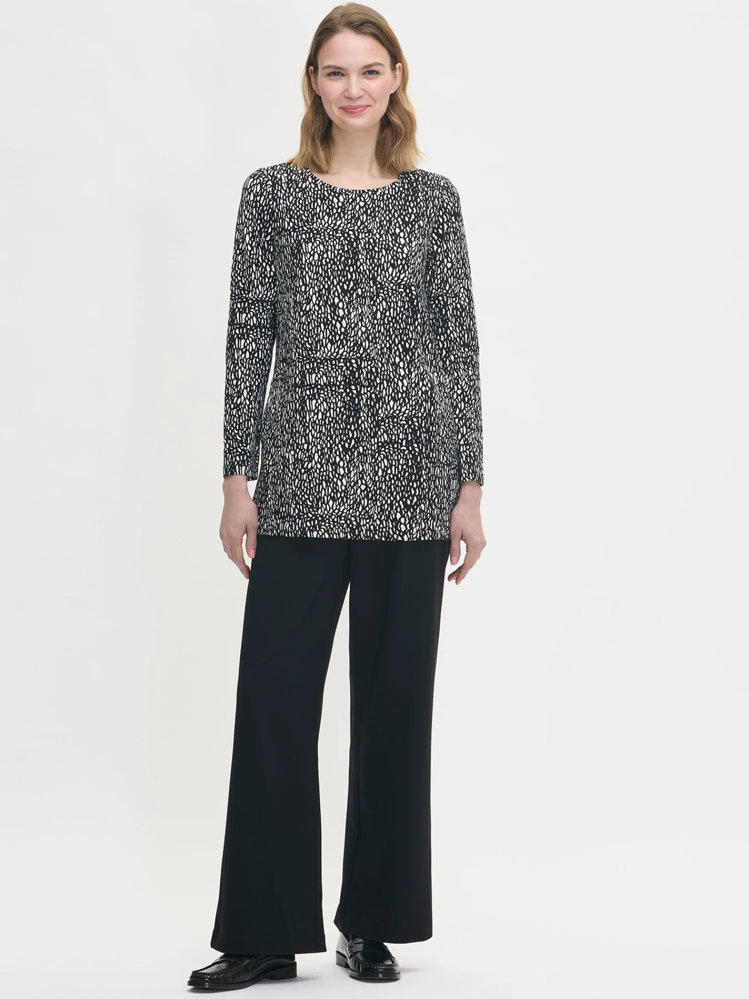 Naisten kuosillinen mustavalkoinen Raku-tunika. Tunikassa on pyöreä tereellä viimeistelty pääntie, sivuissa taskut ja täyspitkät hihat. Tunikan pituus koossa M on noin 80 cm. Materiaali on miellyttävän tuntuista ja helppohoitoista puuvilla-elastaani-neulosta.