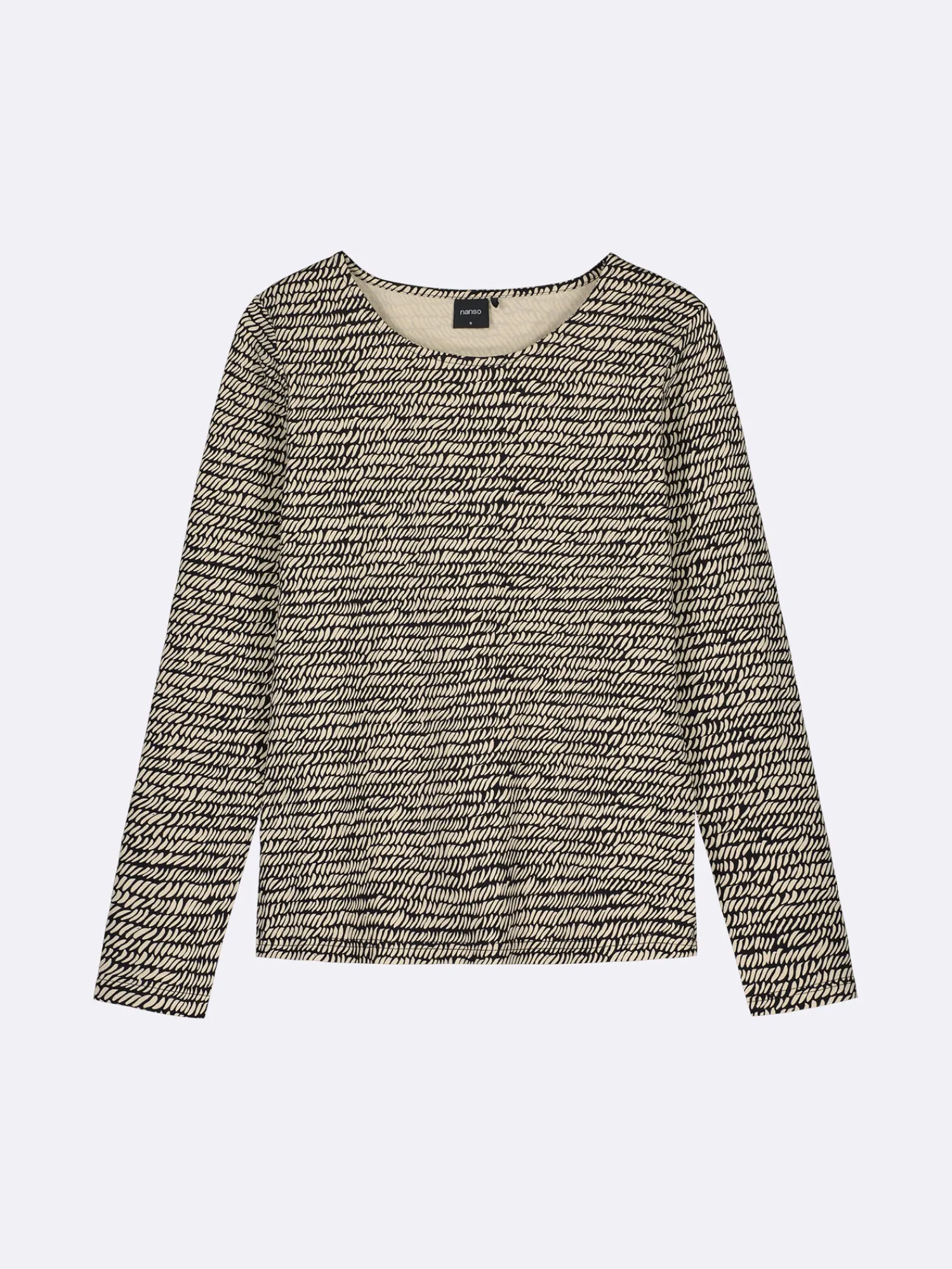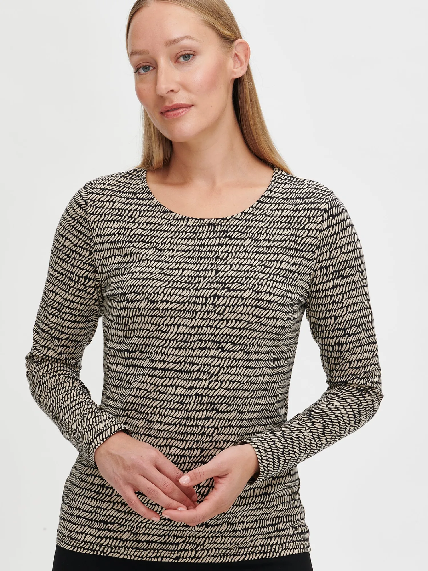 Naisten pitkähihainen, kuosillinen musta Reija-pusero. Laadukas ja mukava pusero on helppo sovittaa erilaisiin asukokonaisuuksiin. Istuvassa puserossa on kantilla viimeistelty pyöreä pääntie ja täyspitkät hihat. Puseron pituus koossa M on noin 65 cm. Materiaali on miellyttävän tuntuista ja helppohoitoista puuvilla-elastaani-neulosta.