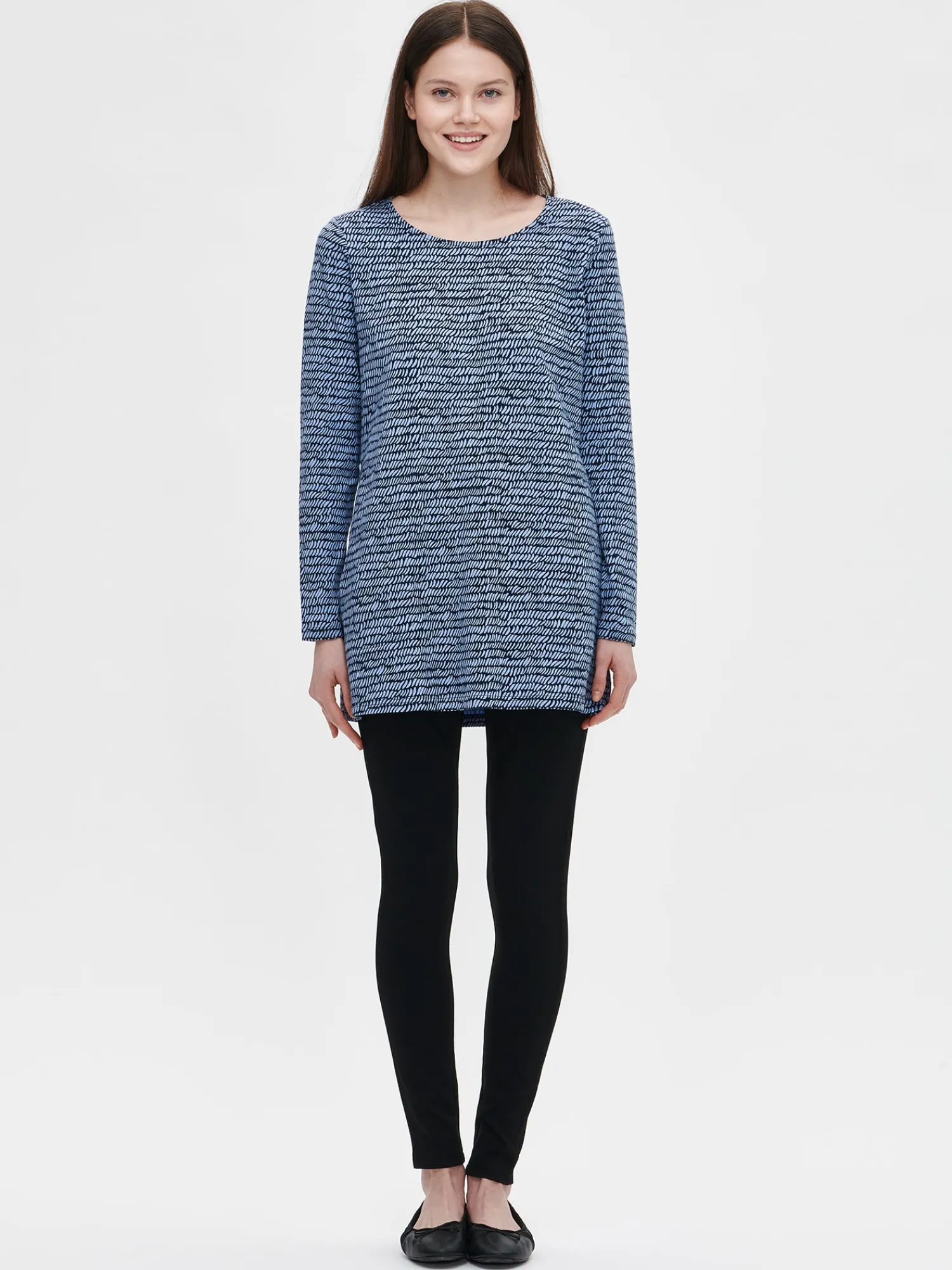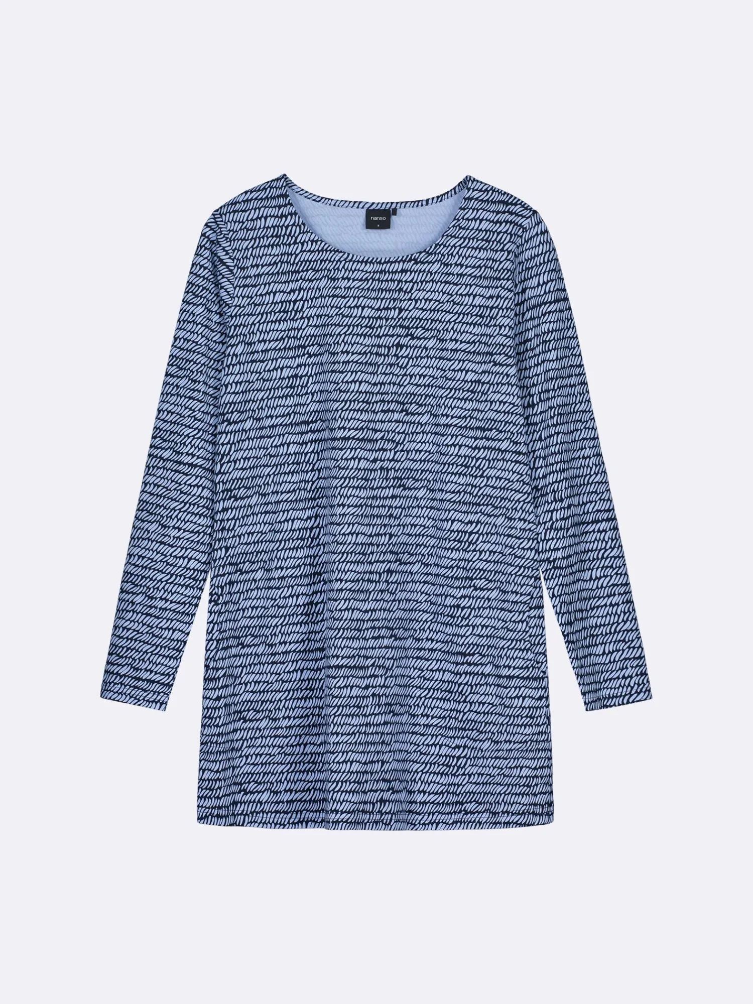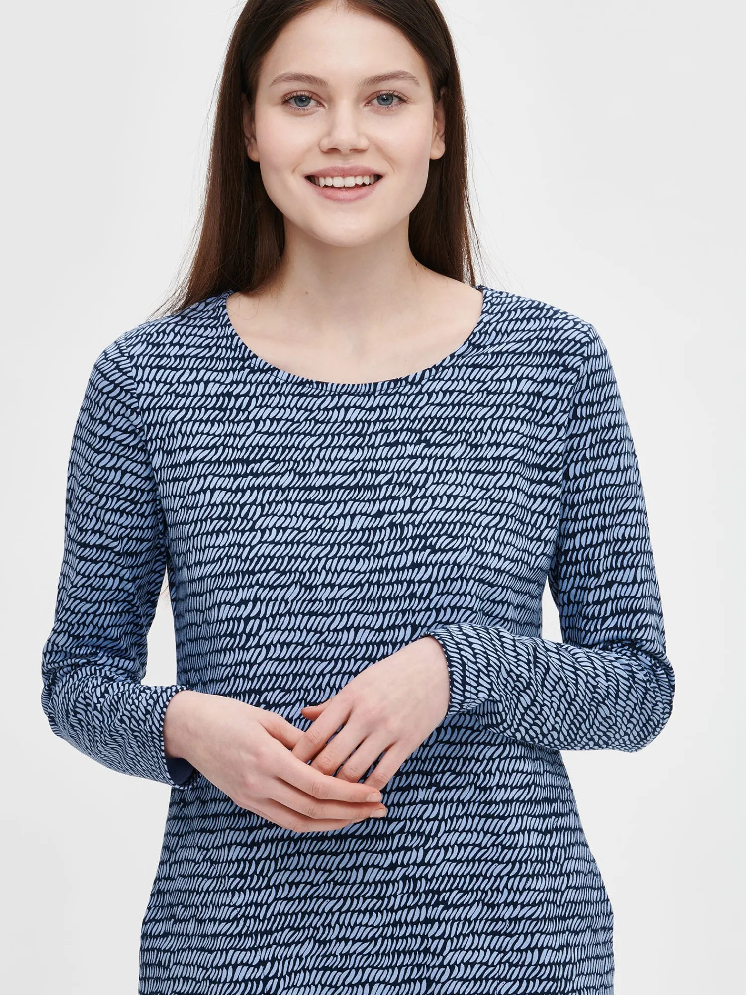 Naisten kuosillinen sininen Reija-tunika. Pitkähihainen tunika on rento ja mukava arkivaate, johon on aina ihanaa pukeutua. Tunikassa on kantilla viimeistelty pyöreä pääntie, taskut sivuissa ja täyspitkät hihat. Tunikan pituus koossa M on noin 80 cm. Materiaali on miellyttävän tuntuista ja helppohoitoista puuvilla-elastaani-neulosta.