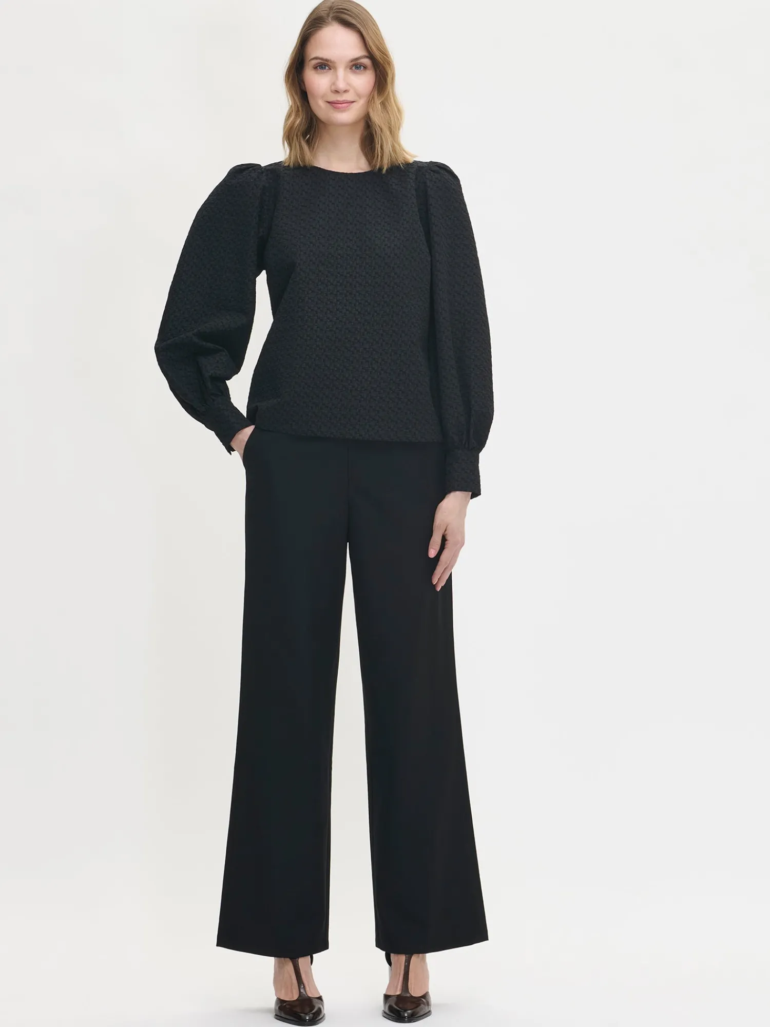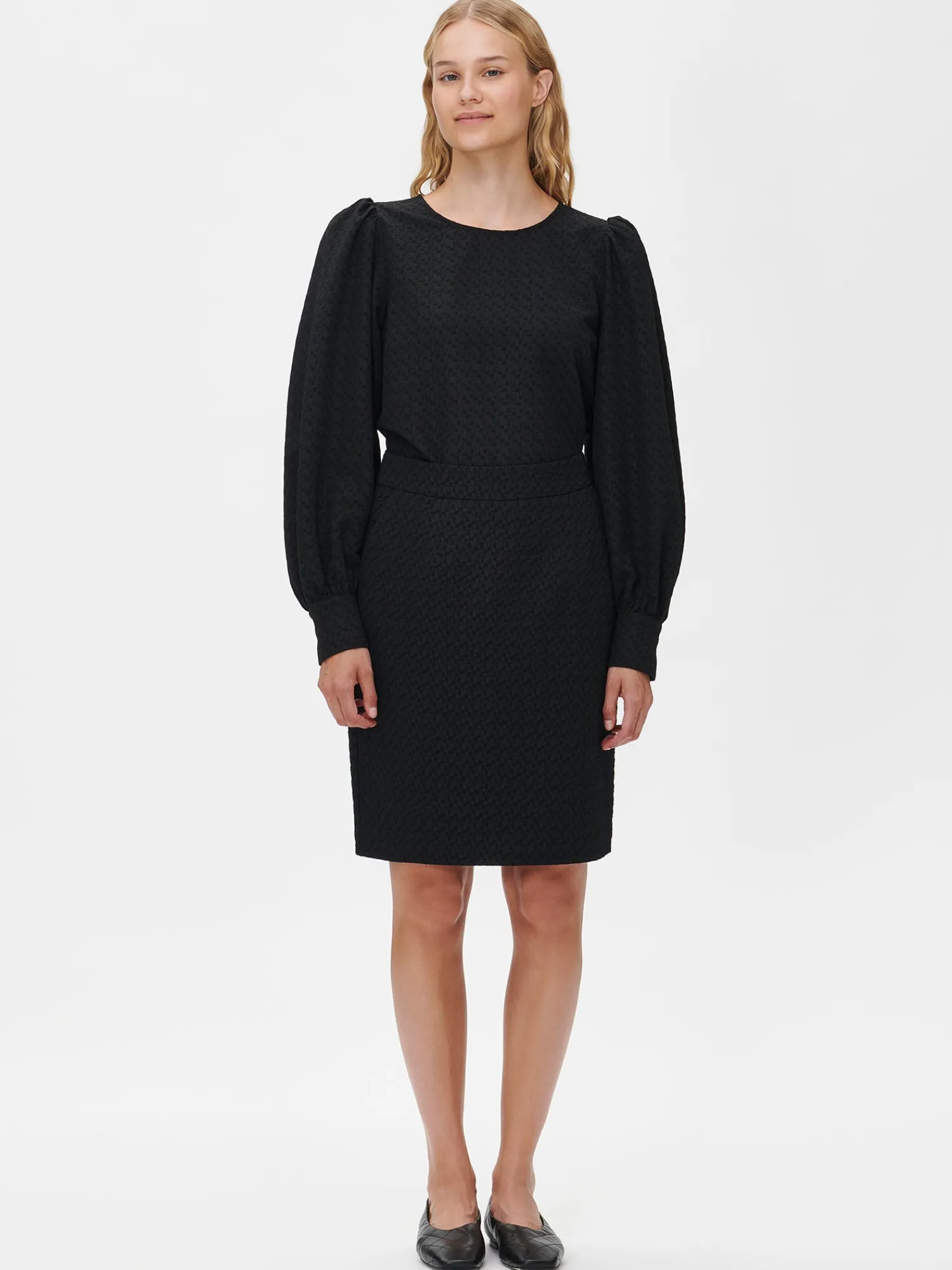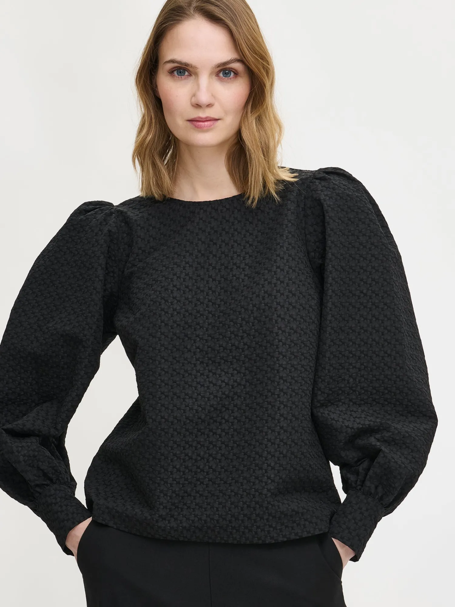 Naisten tyylikäs musta Reliefi-pusero kauniilla tekstuuripinnalla. Pusero on täydellinen yhdistettäväksi sekä hameiden että housujen kanssa. Puserossa on pyöreä pääntie, jossa takana nappihalkio. Puserossa on väljät ja muhkeat täyspitkät hihat, jotka poimuttuvat kauniisti olalla sekä kalvosimen yläpuolelle. Hihansuissa on nappikalvosimet. Puseron pituus koossa 38 on noin 60 cm. Materiaali on miellyttävän tuntuista kudottua polyesteri-viskoosi-elastaani -kangasta, jossa on kaunis pintastruktuuri. Materiaalille on ominaista 3-5 % kutistuminen ensimmäisessä pesussa. Suosittelemme tuotteen pesua ennen käyttöä, koska tuotteesta saattaa irrota väriä ennen ensimmäistä pesua.