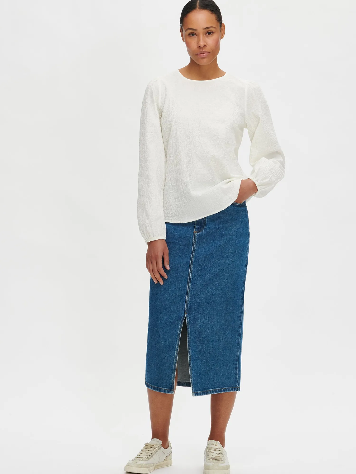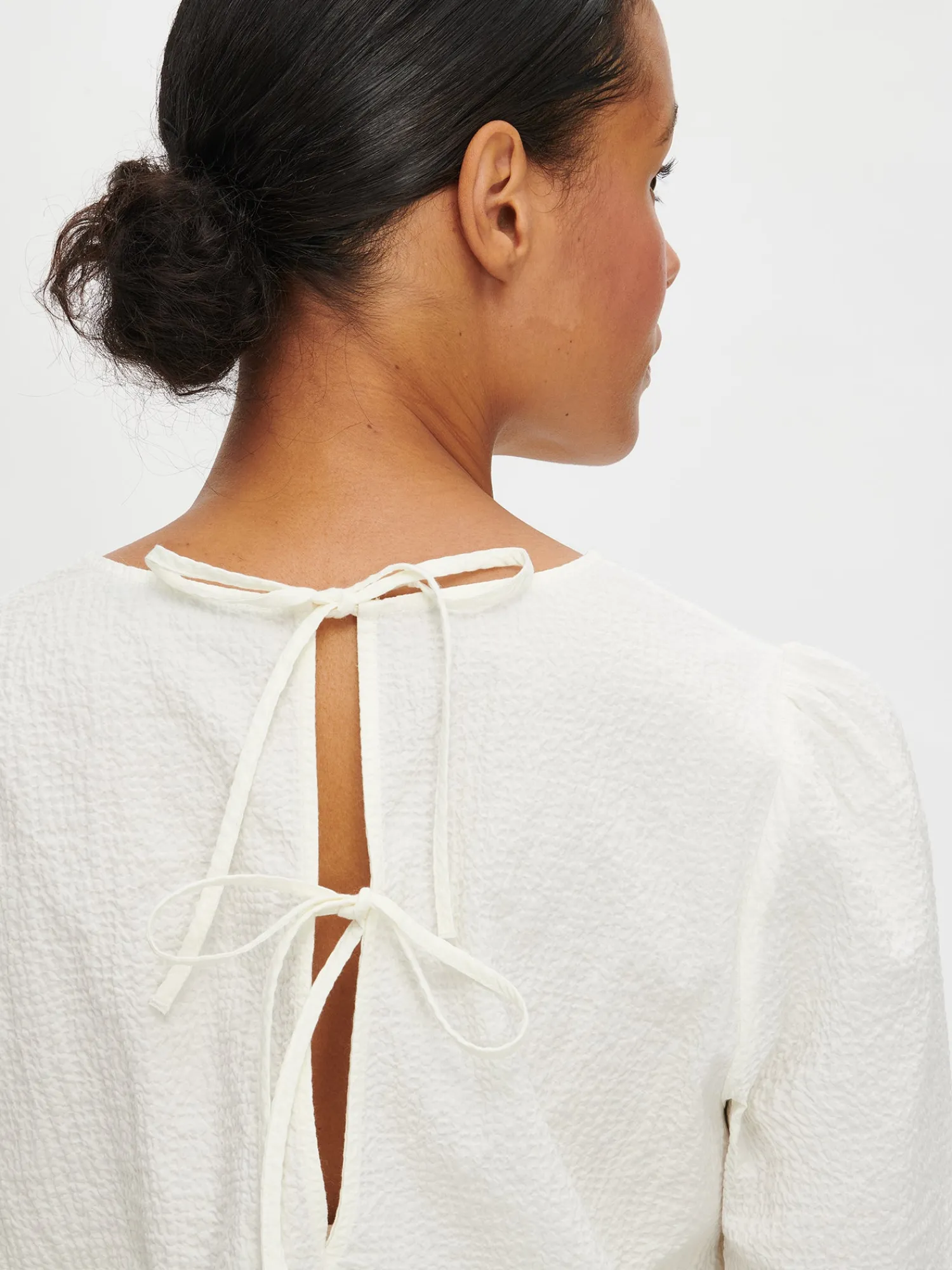 Naisten luonnonvalkoinen pitkähihainen Rusetti-pusero. Yksinkertaisen tyylikäs pusero on helppo yhdistää erilaisiin asukokonaisuuksiin. Puserossa on kantilla viimeistelty pyöreä pääntie ja takana yksityiskohtana halkio kahdella rusetilla, joista ylimmäinen on avattava. Täyspitkät hihat poimuttuvat hihansuiden kuminauhakäänteeseen. Puseron pituus koossa M on noin 64 cm. Materiaali on kudottua puuvillakangasta, jossa kaunis seersucker pintastruktuuri. Kankaassa on hieman elastaania antamassa joustoa. Materiaalille on ominaista 3-5% kutistuminen ensimmäisessä pesussa.