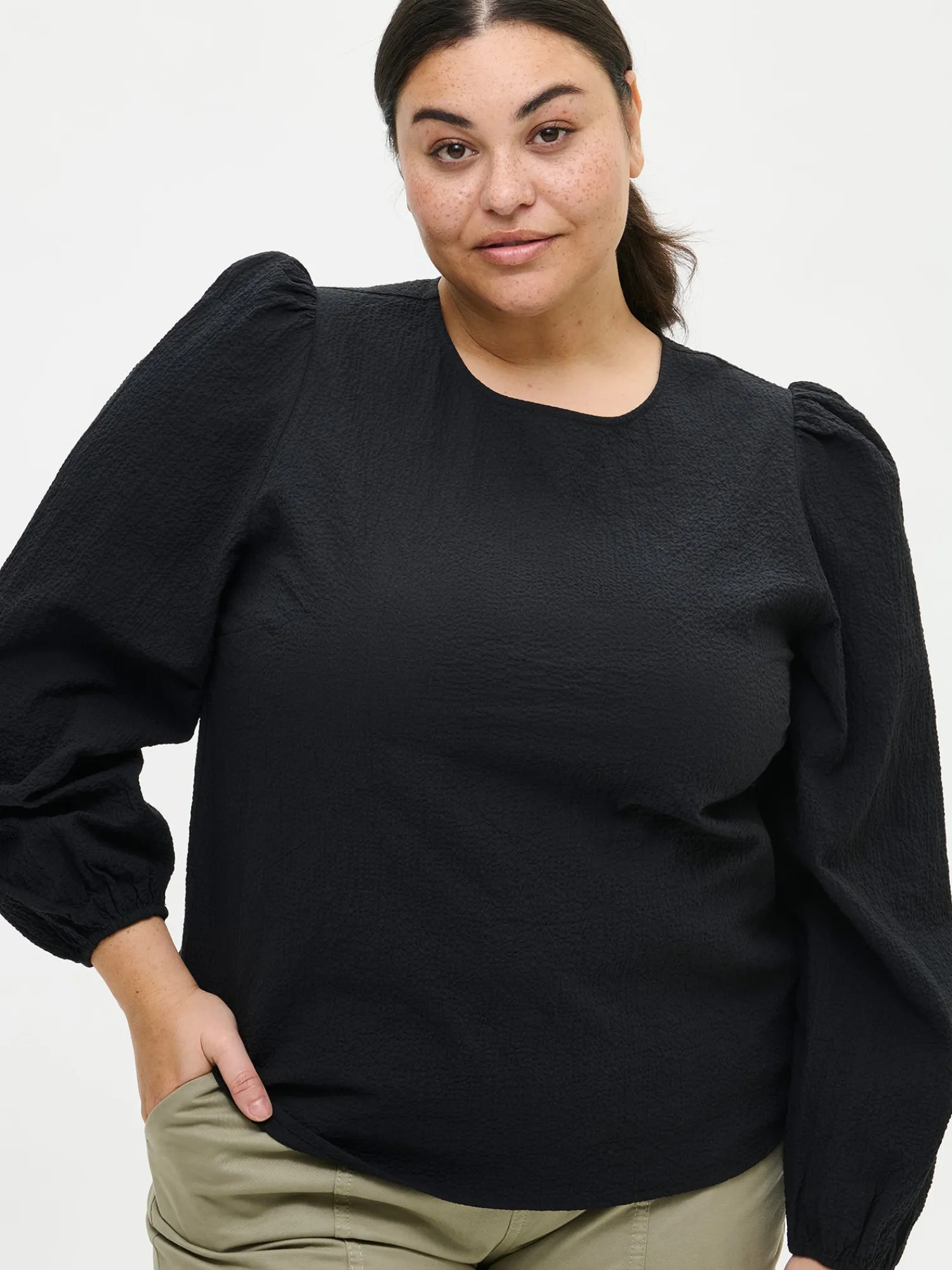Naisten musta pitkähihainen Rusetti-pusero. Yksinkertaisen tyylikäs pusero on helppo yhdistää erilaisiin asukokonaisuuksiin. Puserossa on kantilla viimeistelty pyöreä pääntie ja takana yksityiskohtana halkio kahdella rusetilla, joista ylimmäinen on avattava. Täyspitkät hihat poimuttuvat hihansuiden kuminauhakäänteeseen. Puseron pituus koossa M on noin 64 cm. Materiaali on kudottua puuvillakangasta, jossa kaunis seersucker pintastruktuuri. Kankaassa on hieman elastaania antamassa joustoa. Materiaalille on ominaista 3-5% kutistuminen ensimmäisessä pesussa.