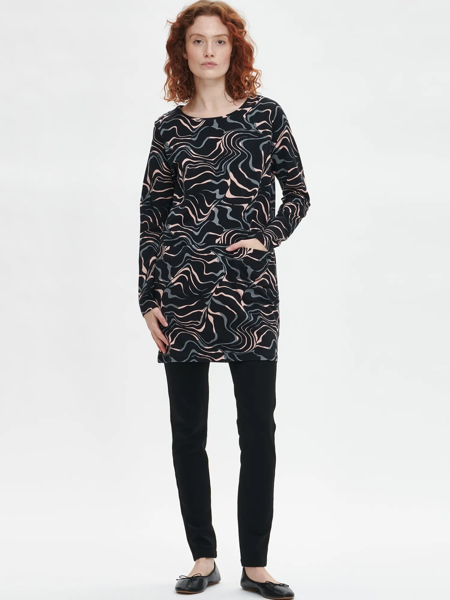 Naisten musta Saara-tunika kauniilla kuosilla. Rennossa suoralinjaisessa tunikassa on tereellä viimeistelty pyöreä pääntie ja täyspitkät hihat. Tunikan leikkaussaumassa on upotettuna taskut. Tunikan pituus koossa M on noin 85 cm. Materiaali on miellyttävän tuntuista ja helppohoitoista puuvilla-elastaani-neulosta.