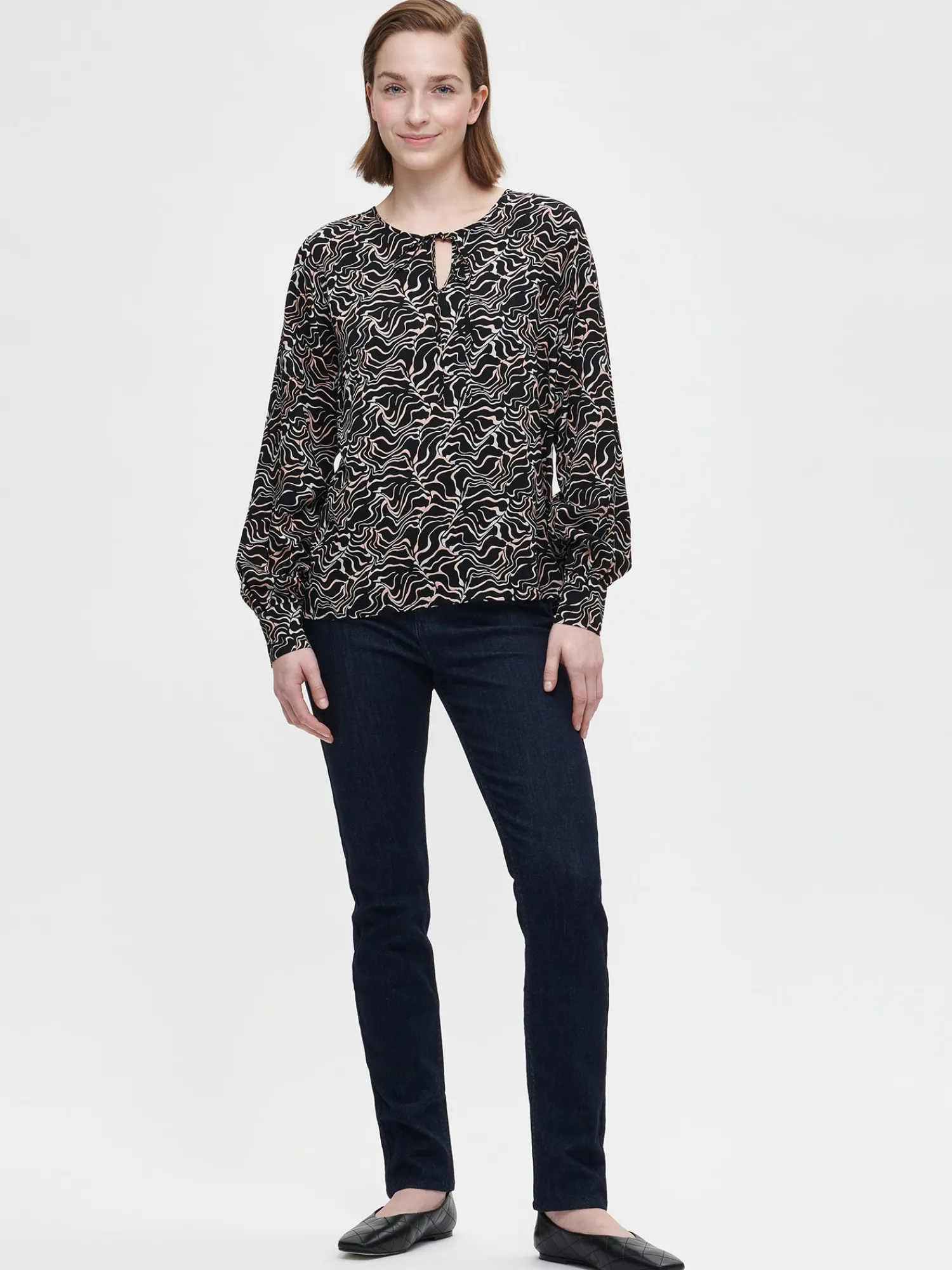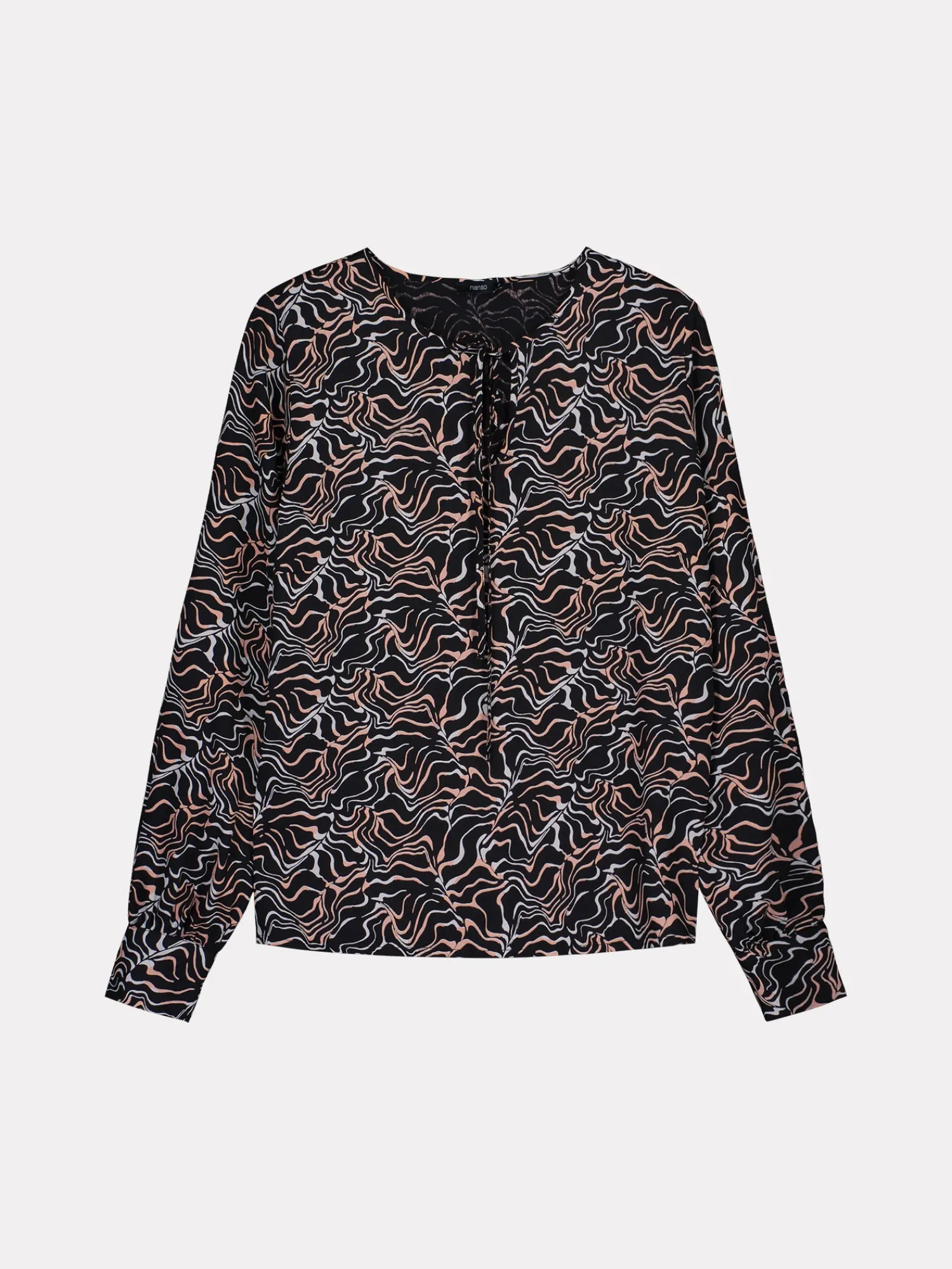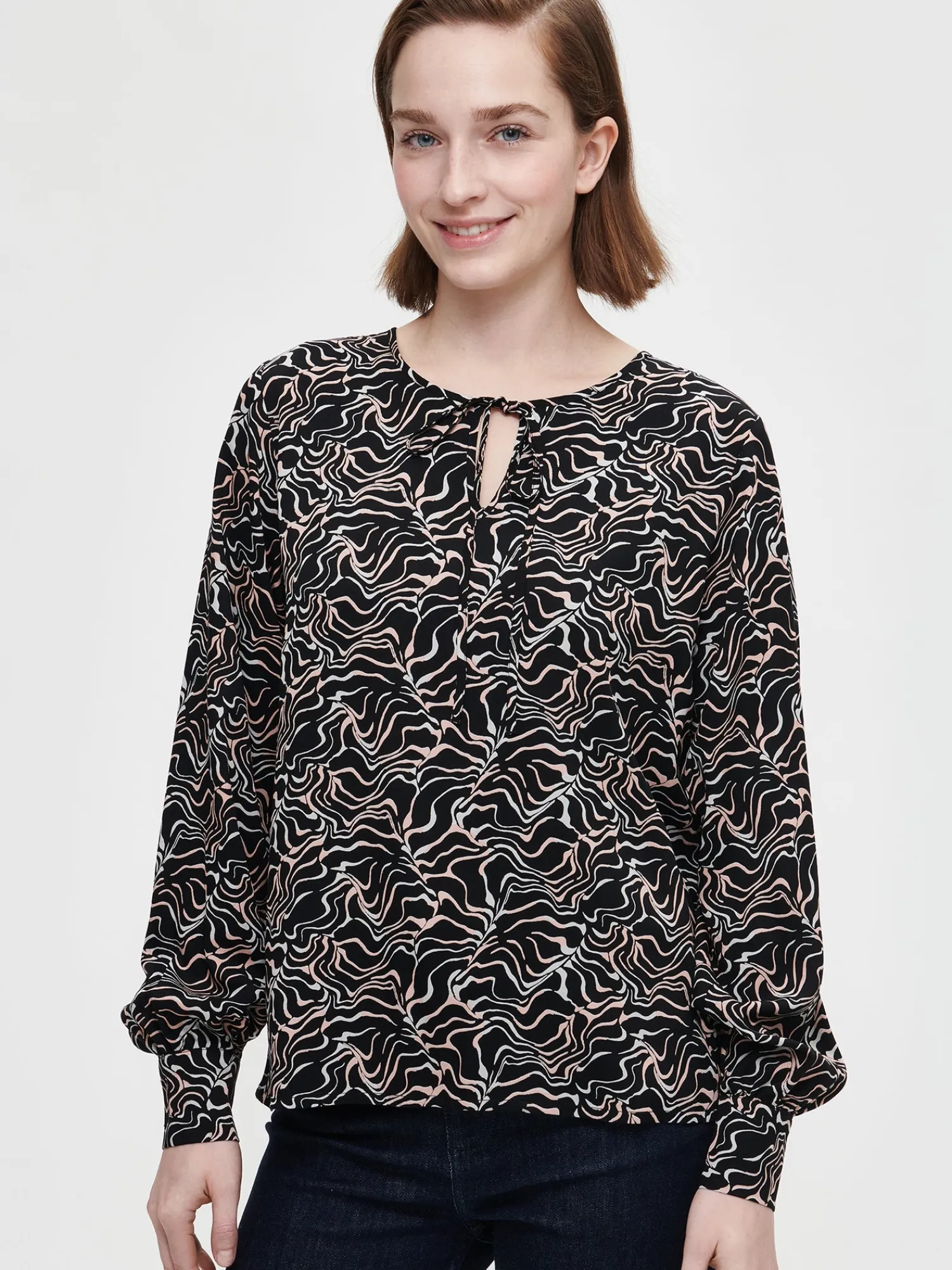 Naisten musta Sara-pusero upealla kuosilla. Kauniissa puserossa on kantattu pyöreä pääntie, jossa on edessä halkio nauhakiinnityksellä. Puserossa on täyspitkät hihat, jotka poimuttuvat hihansuun leveän nappikalvosimen yläpuolelle. Puseron pituus koossa 38 on noin 64 cm. Materiaali on kauniisti laskeutuvaa twillisidoksista viskoosikangasta. Materiaalille on ominaista 3-5% kutistuminen ensimmäisessä pesussa.