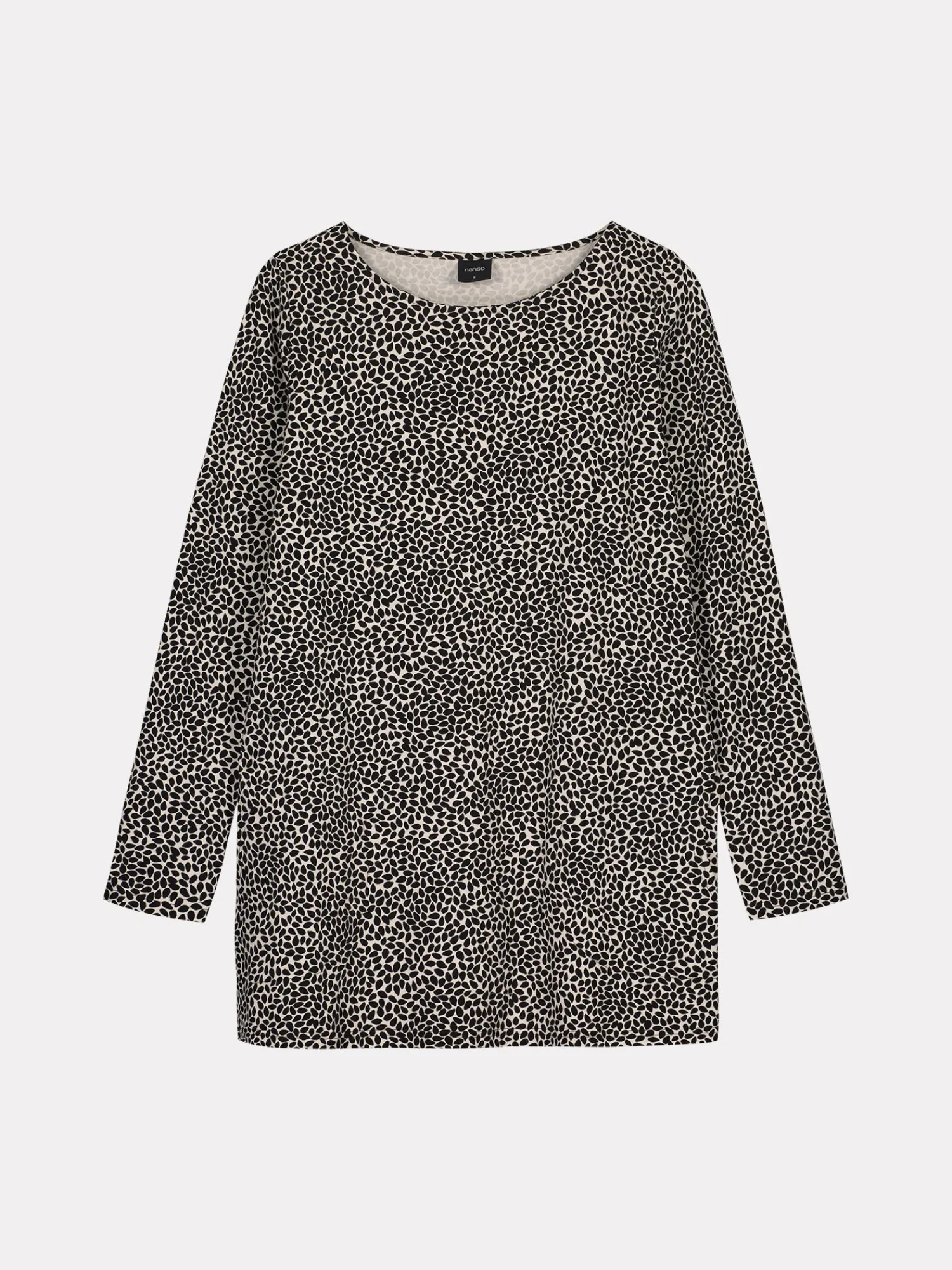Naisten kuosillinen beige Sesam-tunika. Kevyesti levenevässä tunikassa on kantilla viimeistelty ovaali pääntie, sivuissa taskut ja täyspitkät hihat. Tunikan pituus koossa M on noin 78 cm. Materiaali on miellyttävän tuntuista ja helppohoitoista puuvilla-elastaani-neulosta.