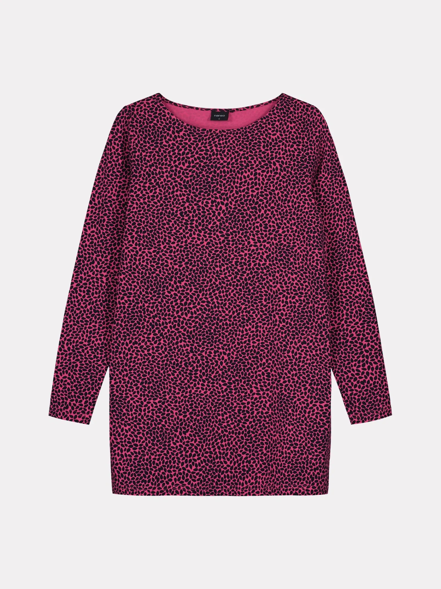 Naisten kuosillinen pinkki Sesam-tunika. Kevyesti levenevässä tunikassa on kantilla viimeistelty ovaali pääntie, sivuissa taskut ja täyspitkät hihat. Tunikan pituus koossa M on noin 78 cm. Materiaali on miellyttävän tuntuista ja helppohoitoista puuvilla-elastaani-neulosta.