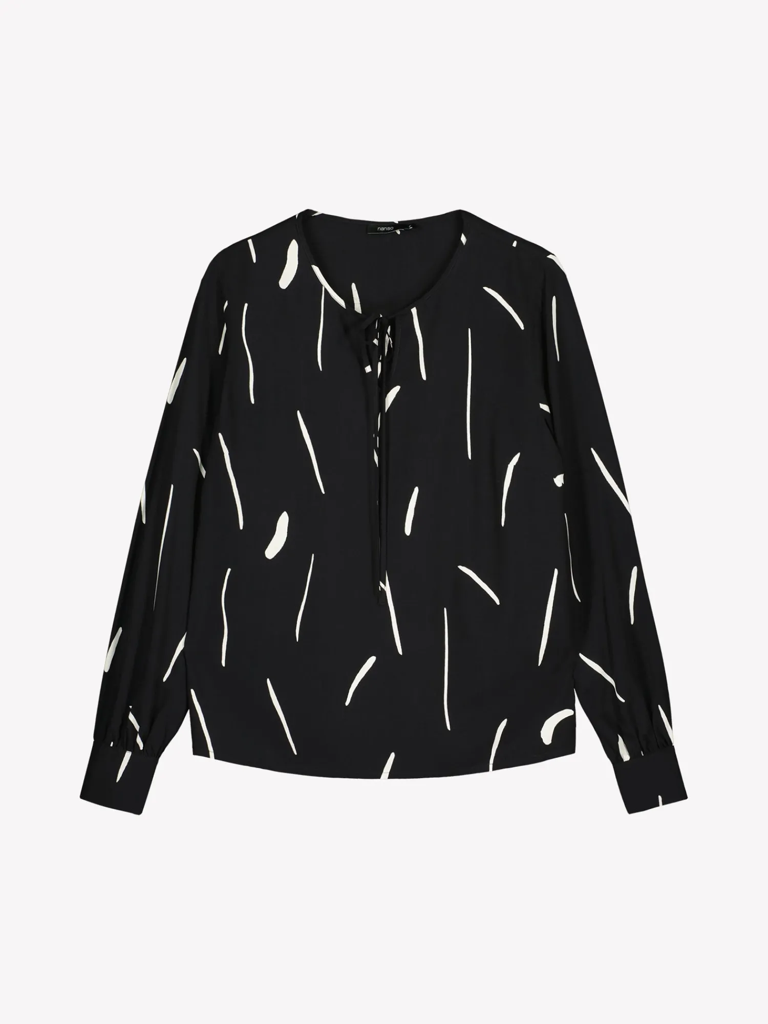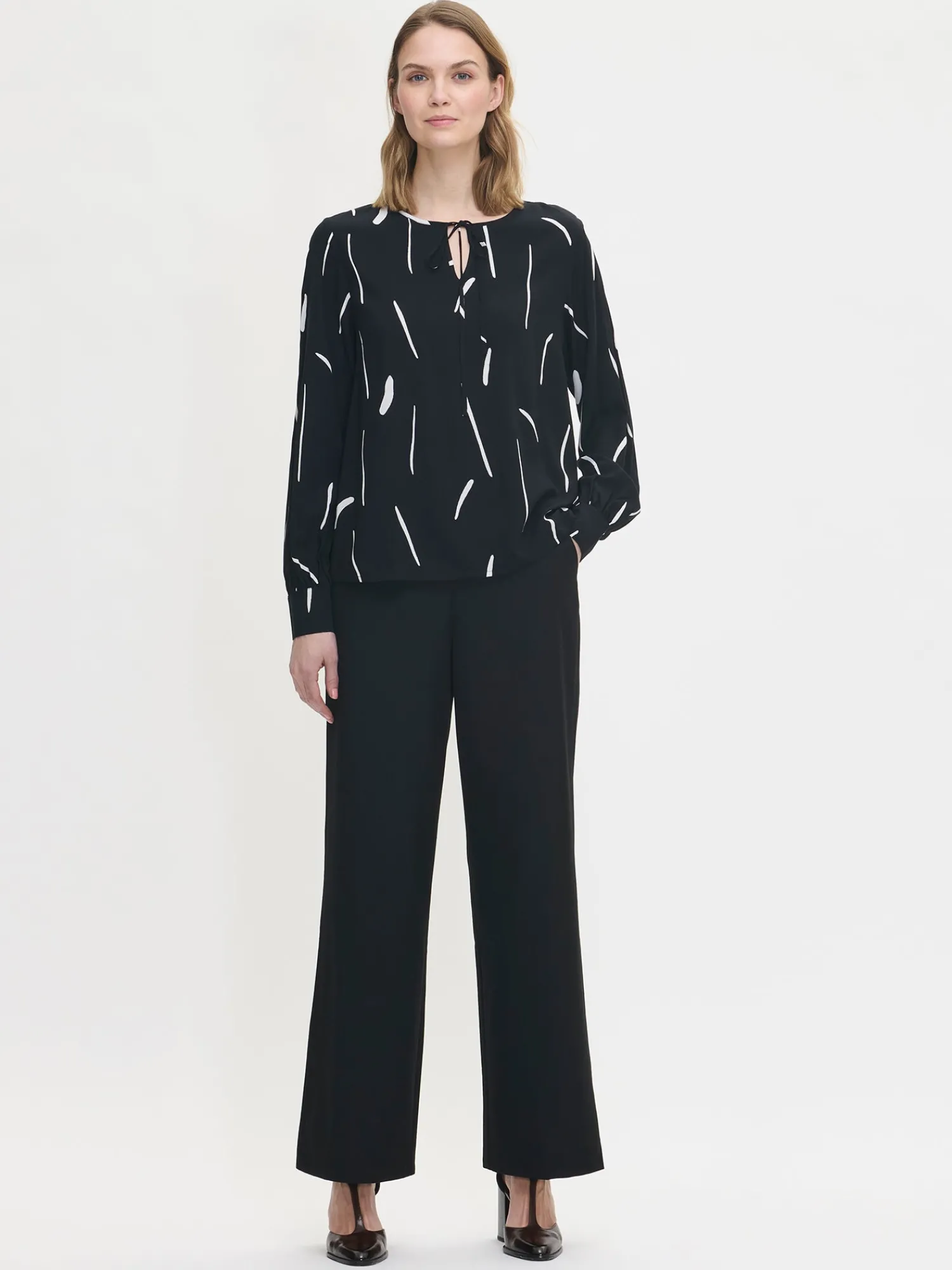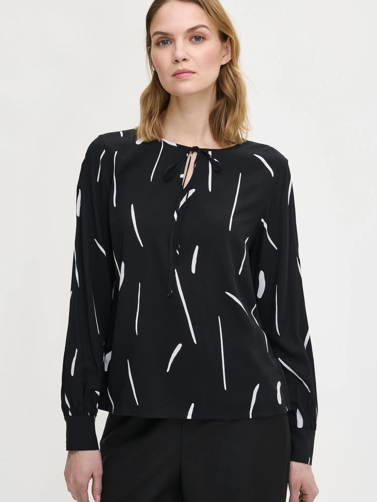 Naisten kuosillinen mustavalkoinen Sivellin-pusero. Puserossa on kantattu pyöreä pääntie, jossa on edessä halkio nauhakiinnityksellä. Puserossa on täyspitkät hihat, jotka poimuttuvat hihansuussa leveän nappikalvosimen yläpuolella. Puseron pituus koossa 38 on noin 64 cm. Materiaali on kauniisti laskeutuvaa kudottua 100 % viskoosikangasta. Materiaalille on ominaista 3-5 % kutistuminen ensimmäisessä pesussa.