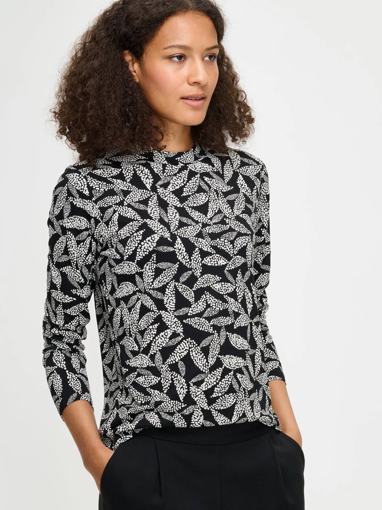 Naisten kuosillinen mustavalkoinen Triine-pusero pienellä pystykauluksella. Suoralinjaisessa puserossa on täyspitkät hihat. Puseron pituus koossa M on noin 65 cm. Materiaali on laadukasta ja miellyttävän tuntuista, ohutta viskoosi-elastaani-neulosta. Viskoosineulos on sähköistymätöntä ja helppohoitoista. Tuote on valmistettu LENZING™ ECOVERO™ -viskoosista. Materiaalille on ominaista 3-5 % kutistuminen ensimmäisessä pesussa.