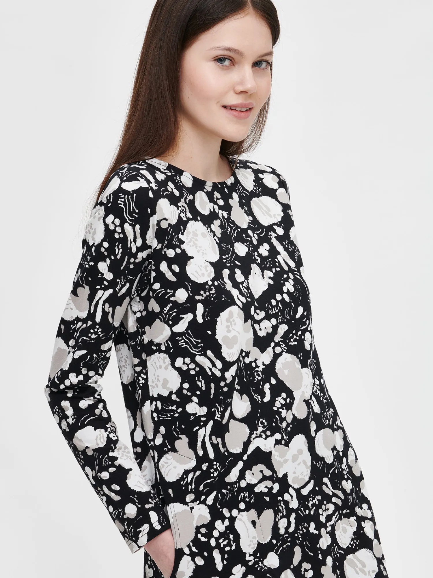 Naisten kuosillinen musta Venla-tunika. Rennossa tunikassa on kantilla viimeistelty ovaali pääntie, taskut sivuissa ja täyspitkät hihat. Tunikan pituus koossa M on noin 80 cm. Materiaali on miellyttävän tuntuista ja helppohoitoista puuvilla-elastaani-neulosta.